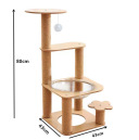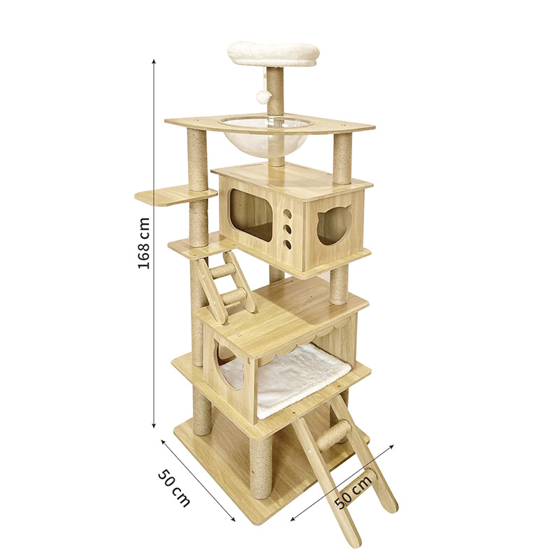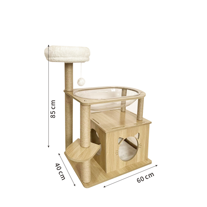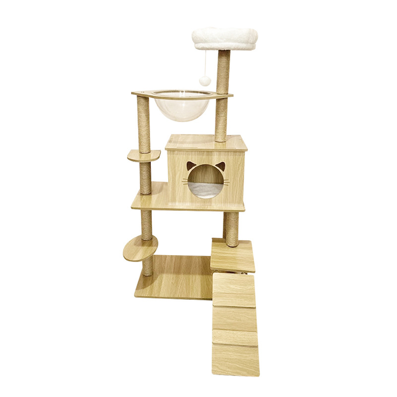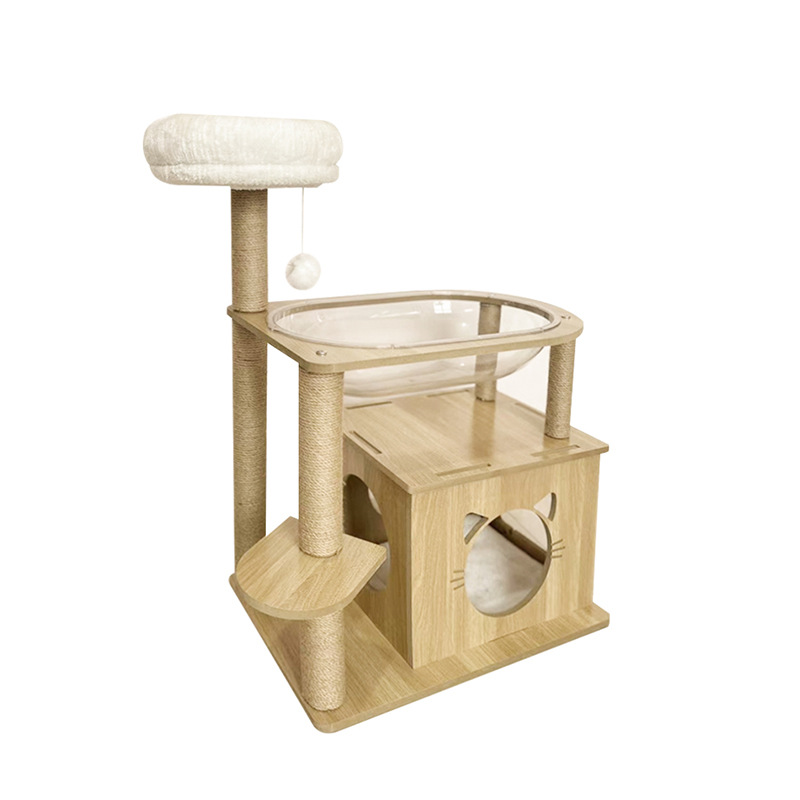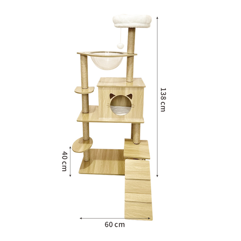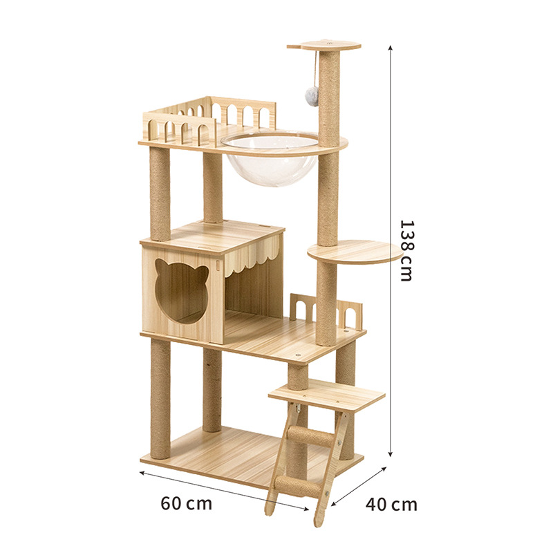 Кошачий лазает цельный деревянный столб с космической капсулой