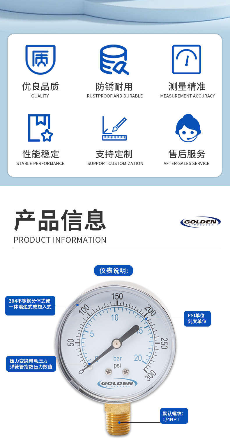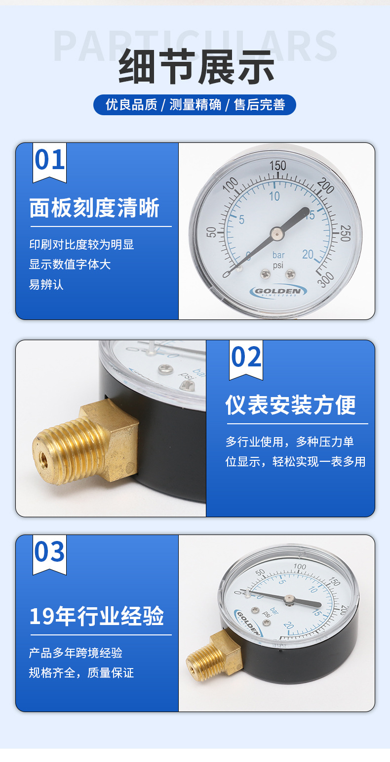 大家好,欢迎来到慈溪金色仪器仪表有限公司,我公司成立于2005年专业设计制造出口型压力表生产型企业。具有全新的管理体系及技术力量,从2006年开始产品远销美洲,欧洲等各国,并与知名品牌长期合作。