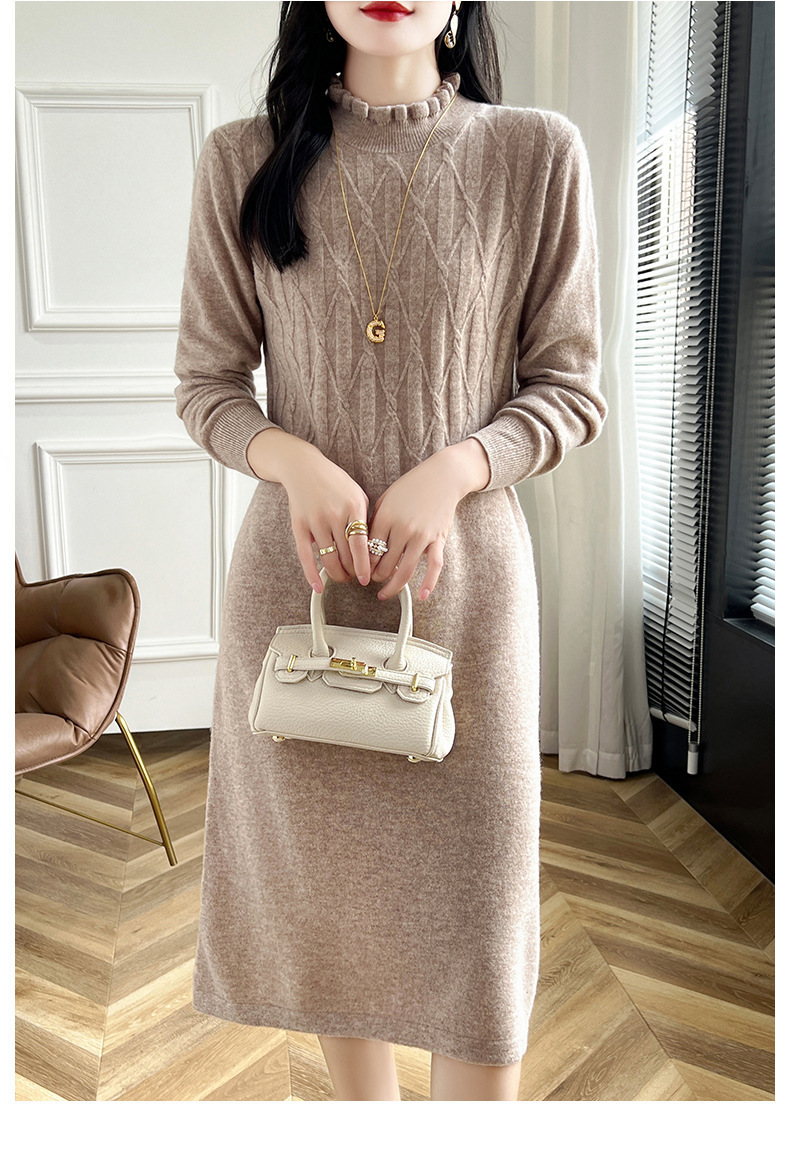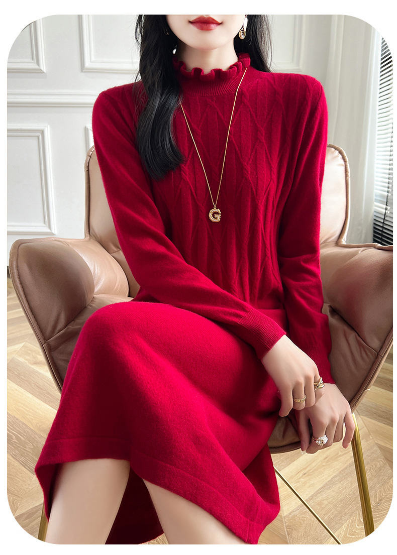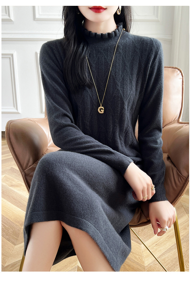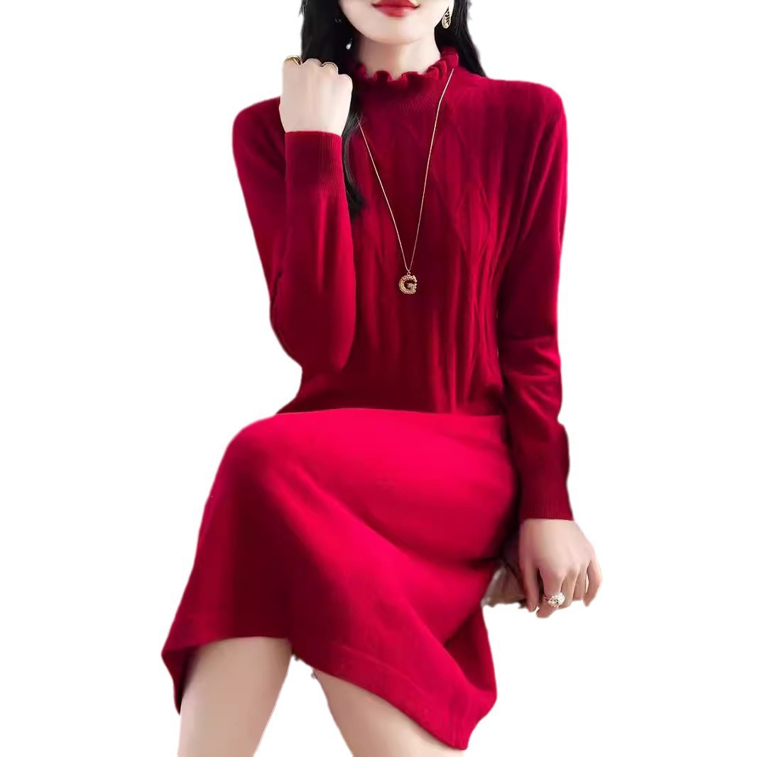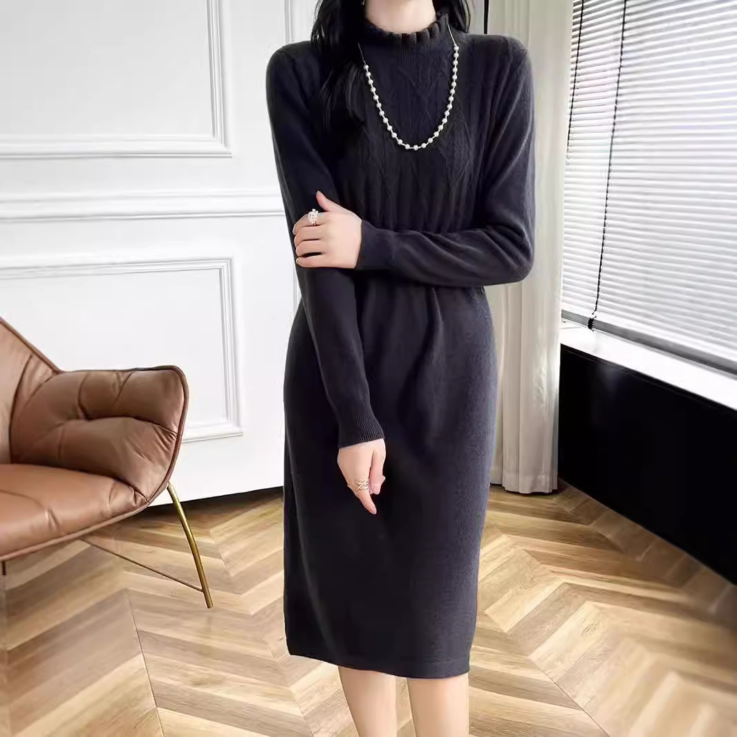 2024 Новое трикотажное платье осенне-зимний темперамент деревянный ушной воротник женский с тонким внутренним пальто
