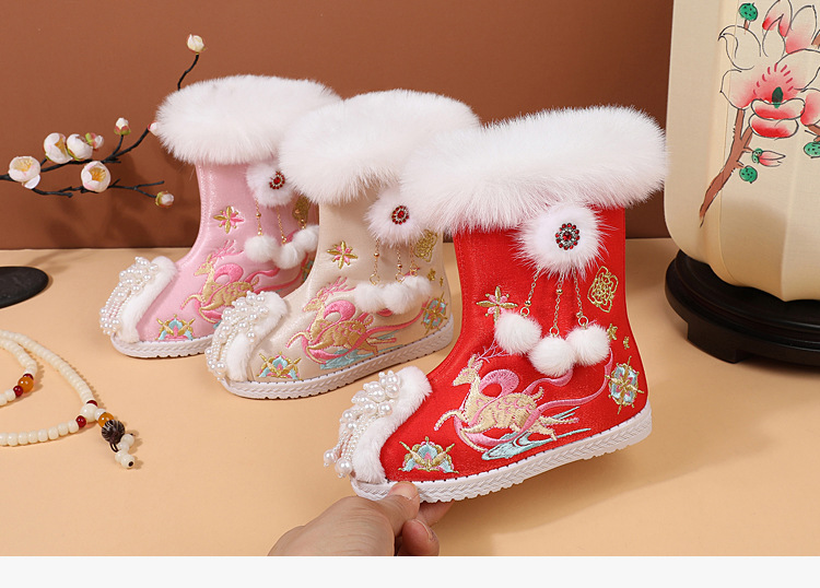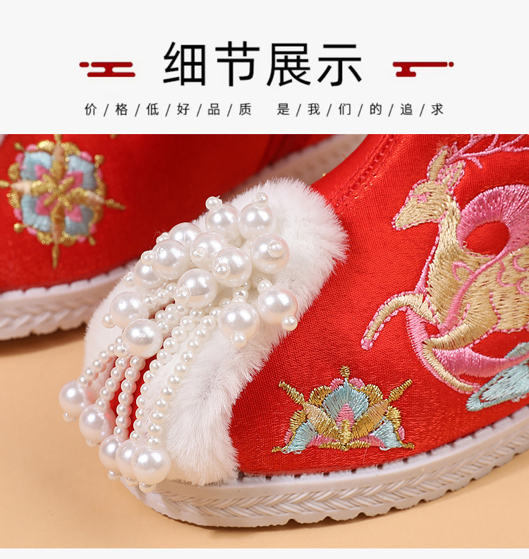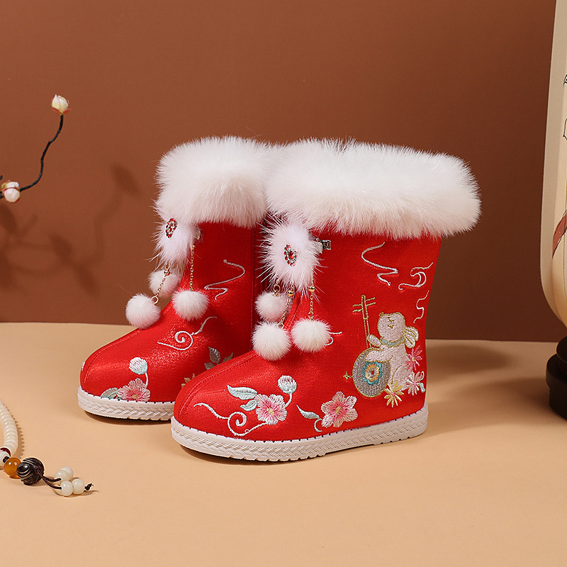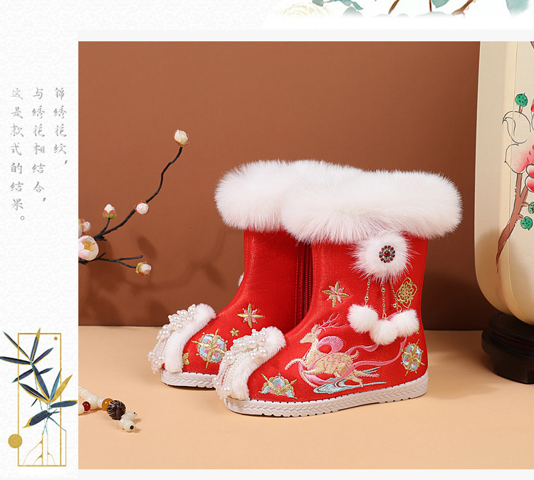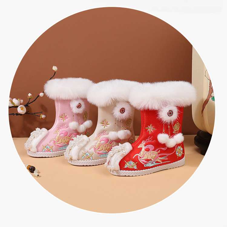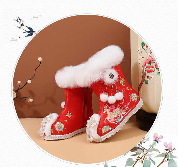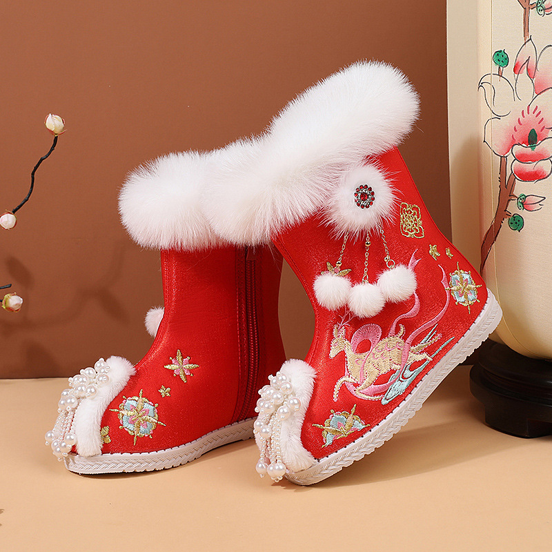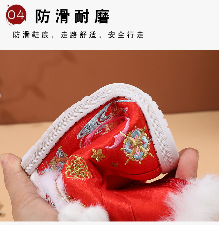 Зимняя утолщение обуви для девочек Hanfu с новогодней обувью для девочек в китайском стиле красная детская вышитая обувь теплая хлопчатобумажная обувь
