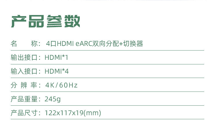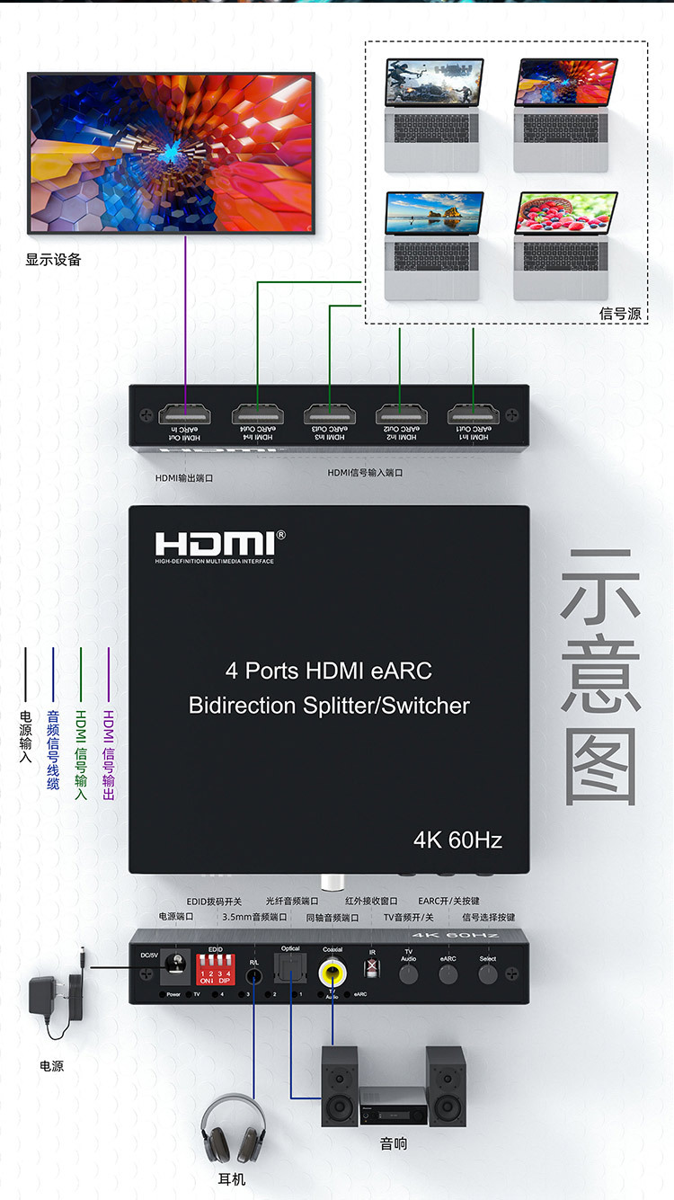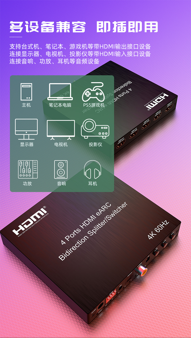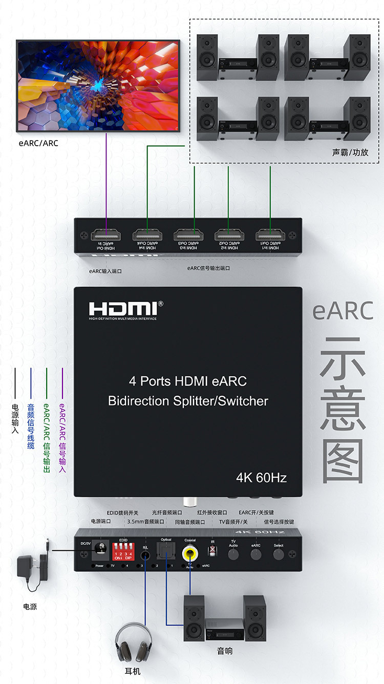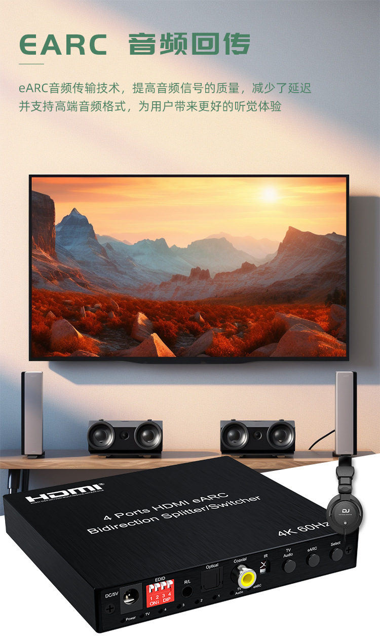 Производитель версии 2.0 4K @ 60Hz 4-ходовой HDMI eARC двухсторонний распределительный переключатель 4-канальный распределитель eARC коаксиальный