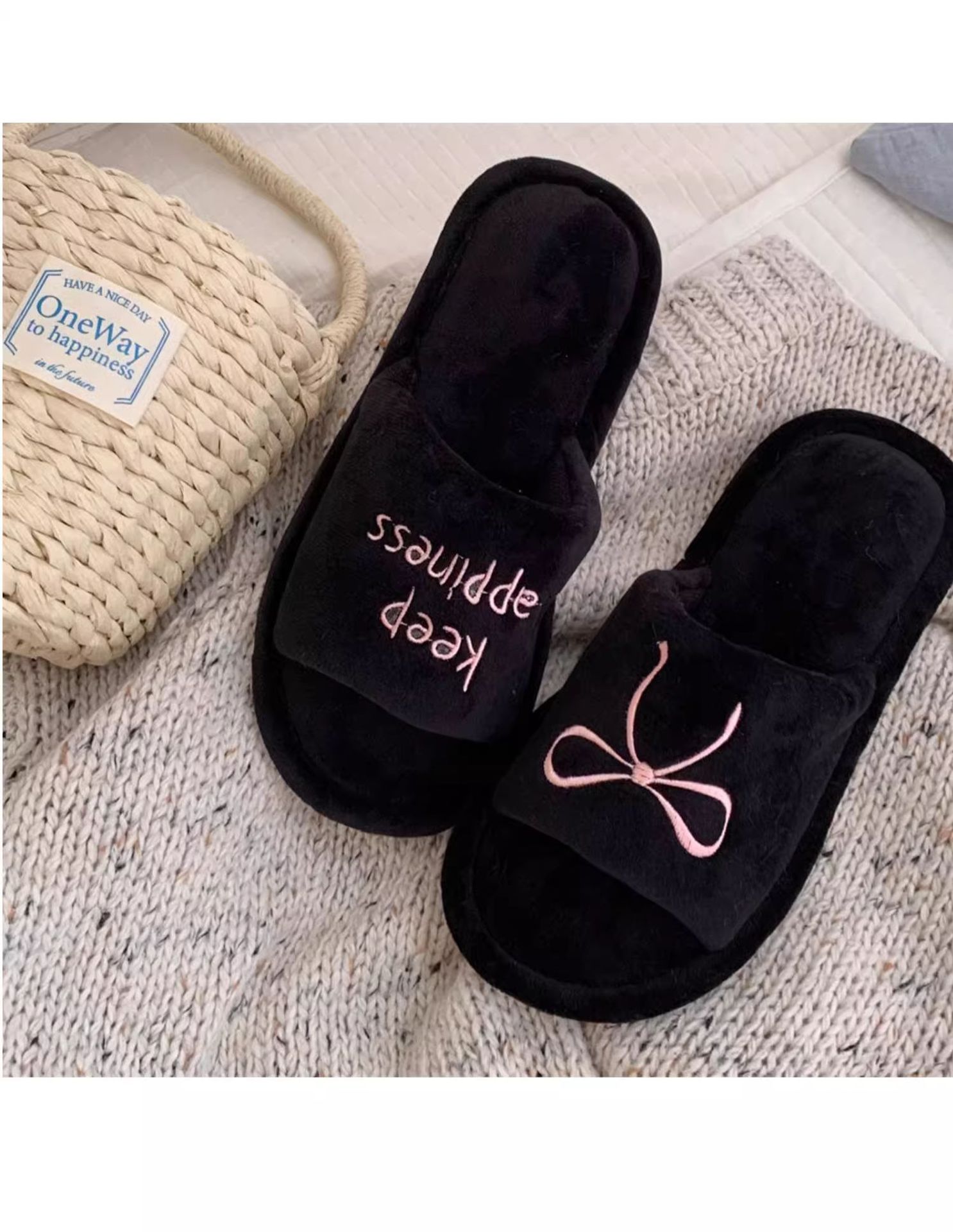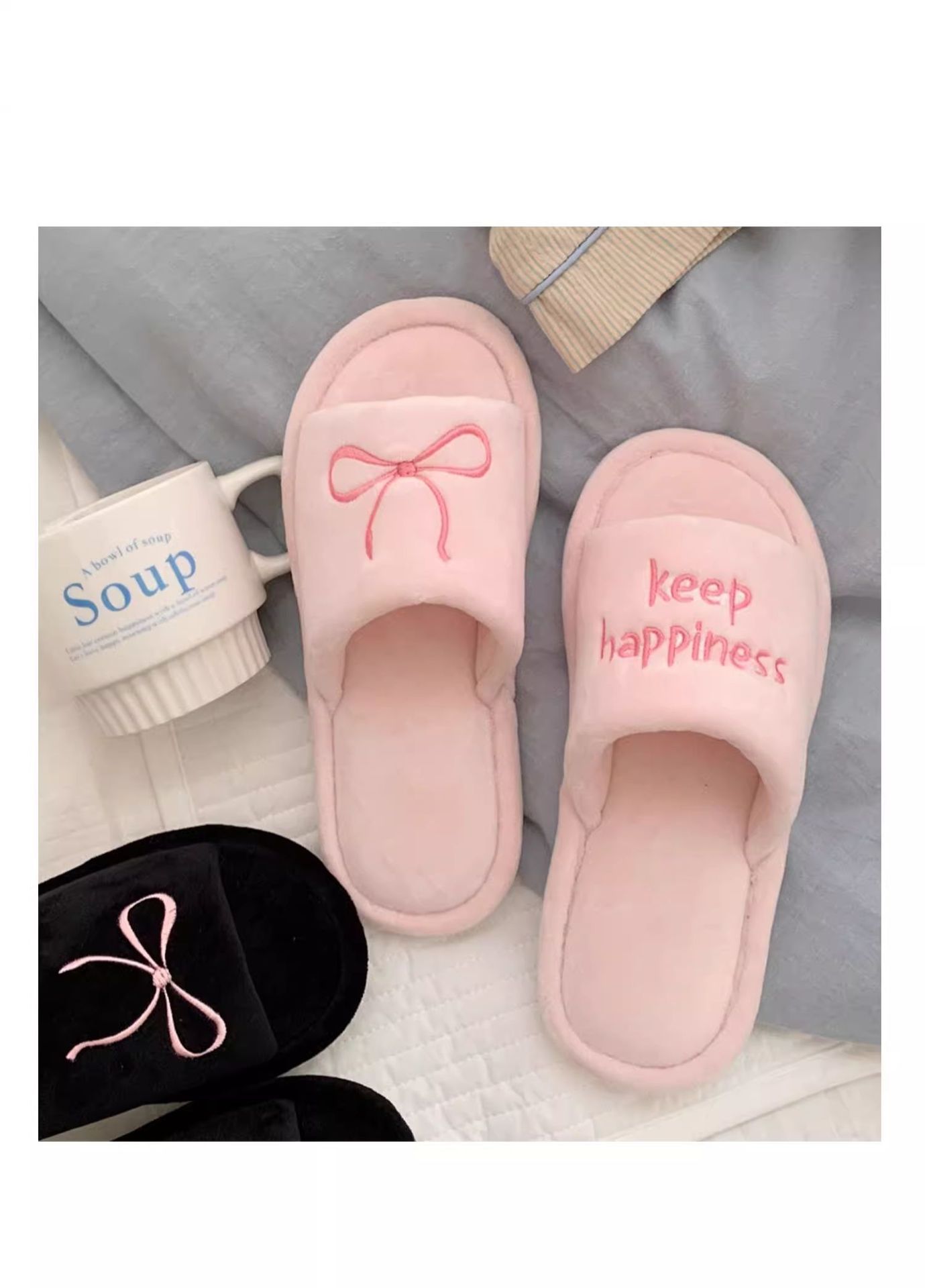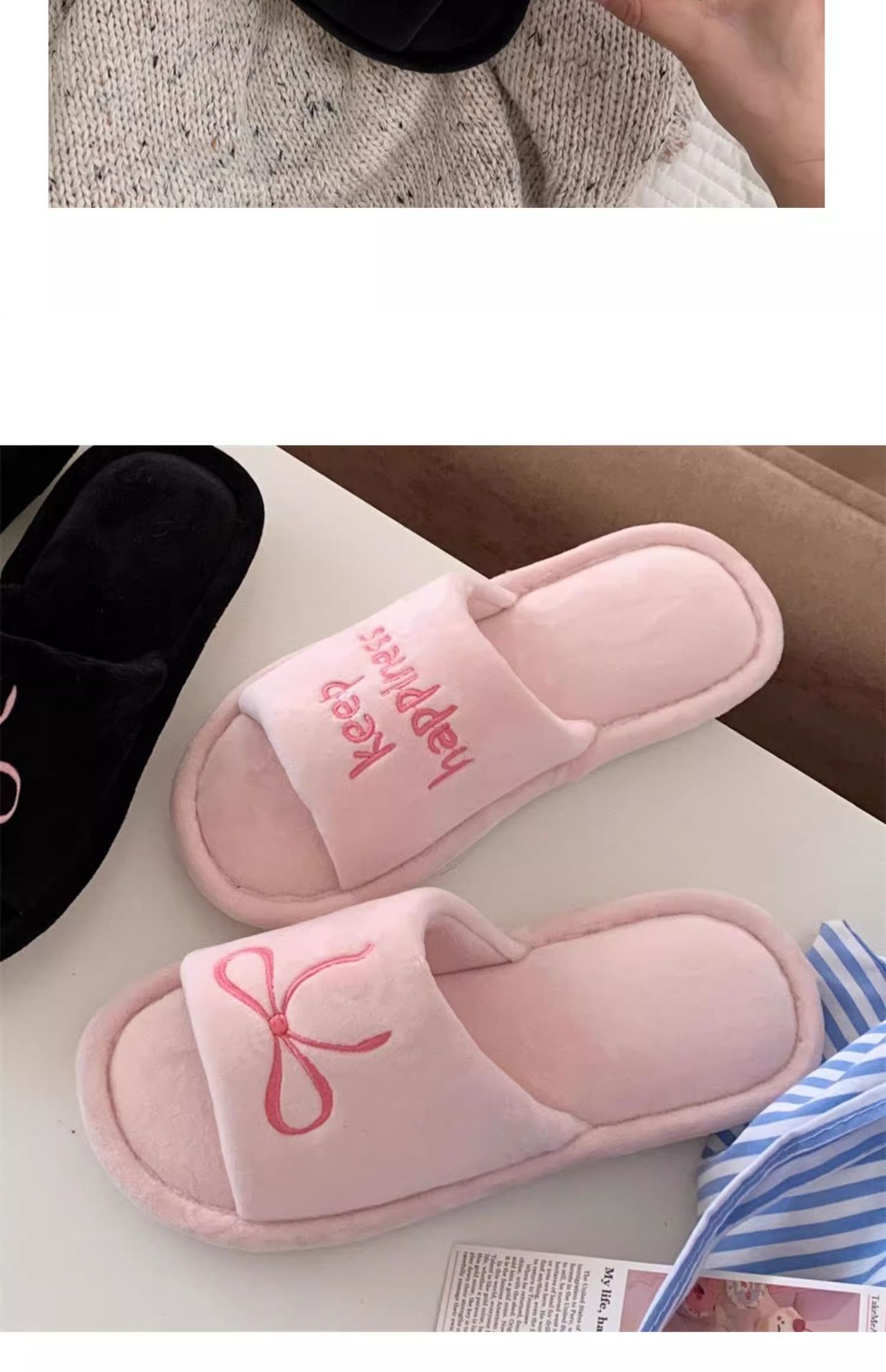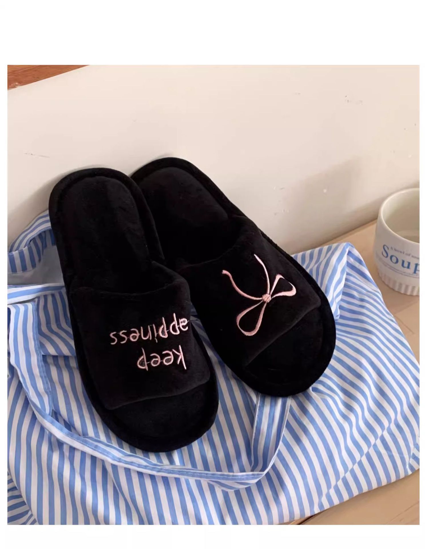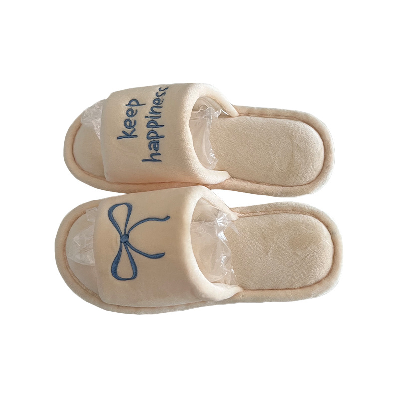 Тонкие полоски корейских букв бант туфли для пола женские повседневные спальни осенью и зимой удобные хлопковые тапочки