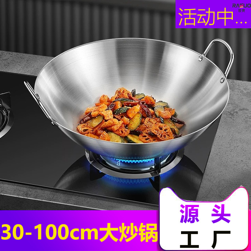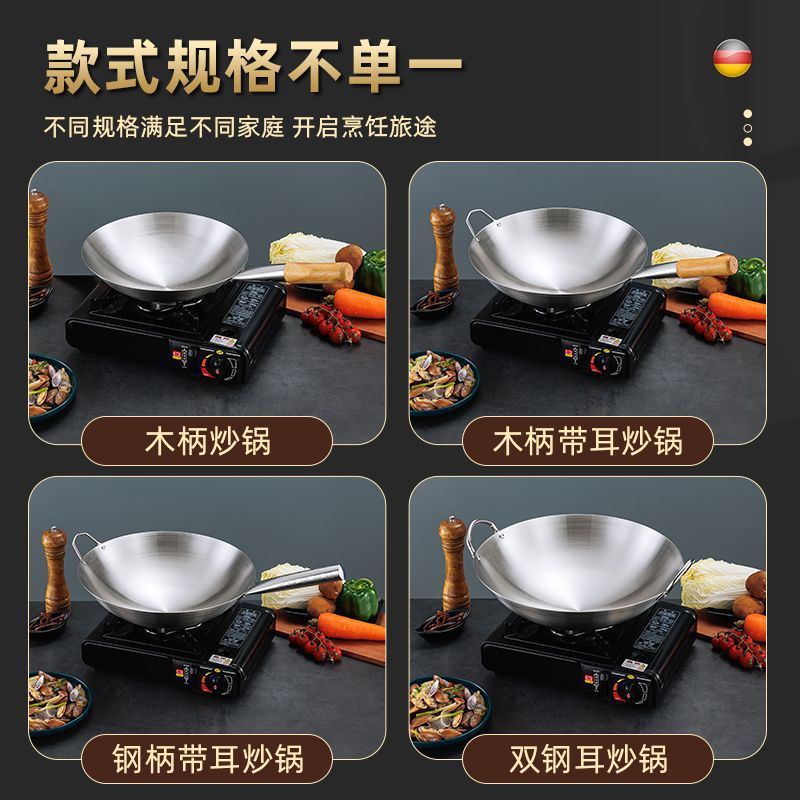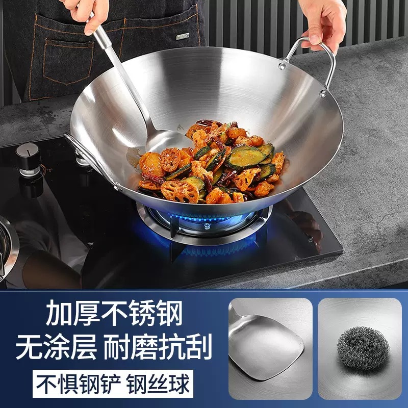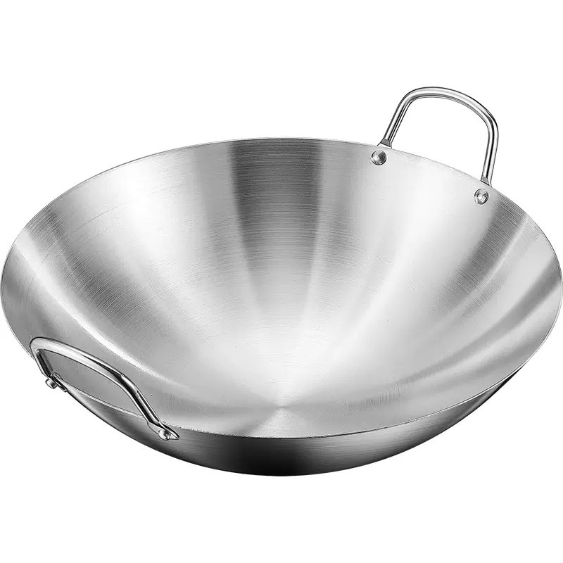 Утолщенная сковорода-вок из нержавеющей стали, тайская сковорода-вок с круглым дном и одной ручкой, большая кухонная сковорода-вок с двумя ручками и конструкцией с одной ручкой.