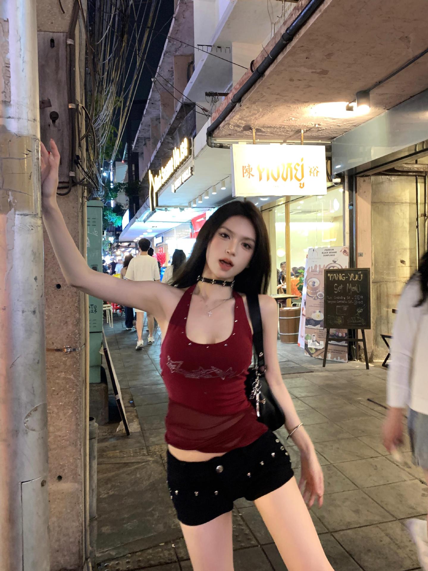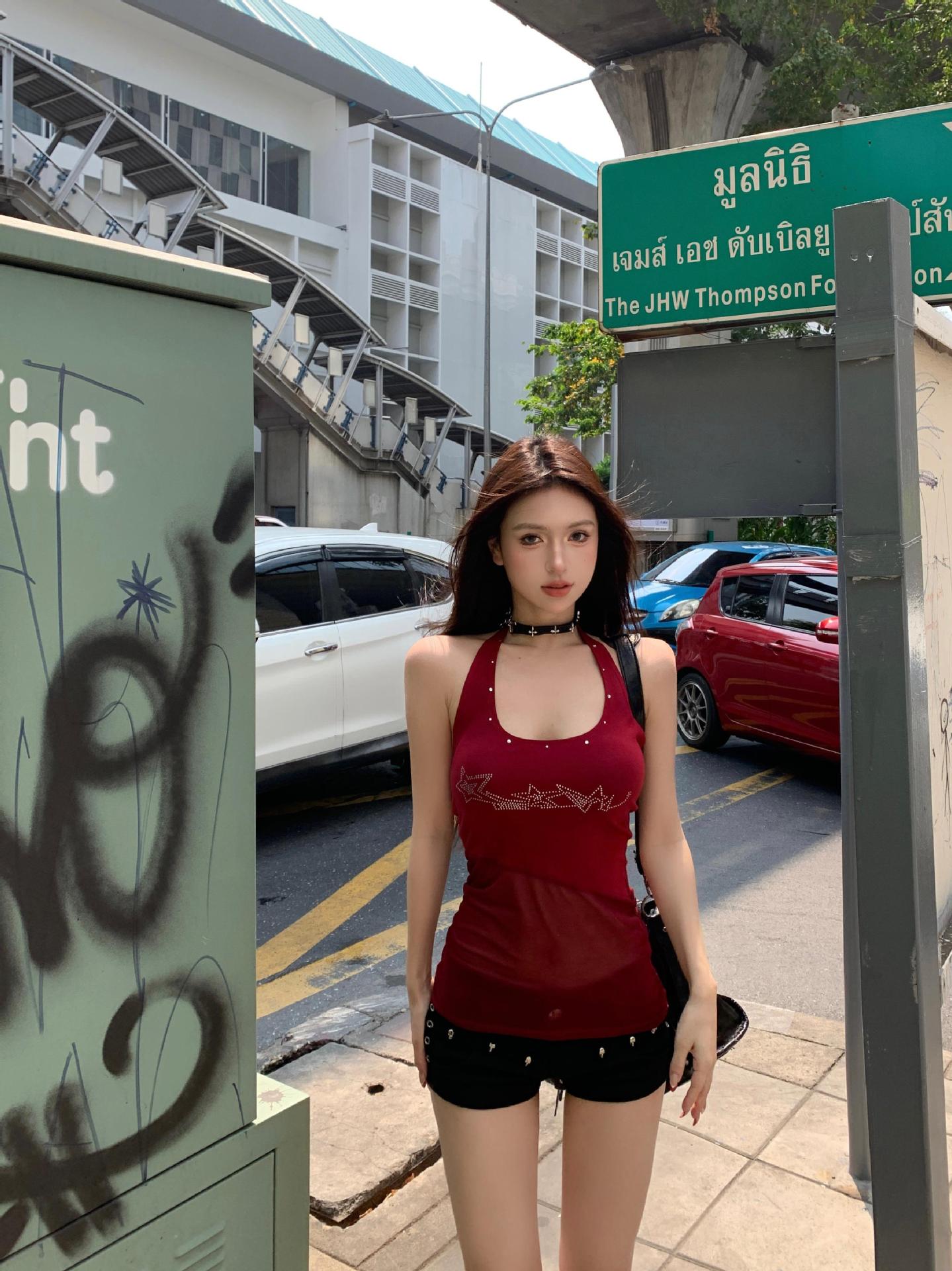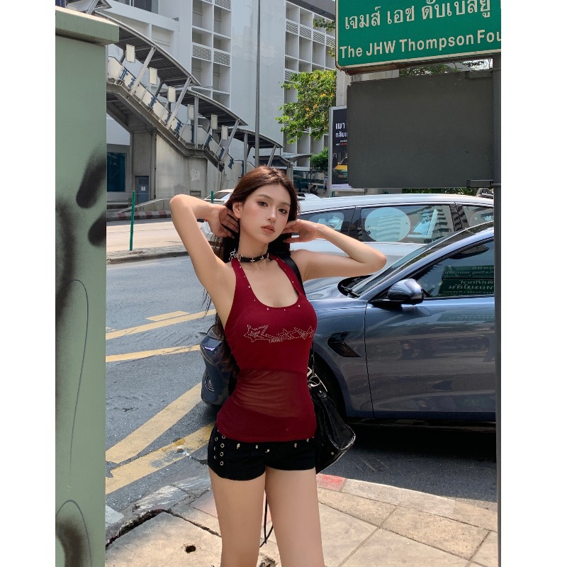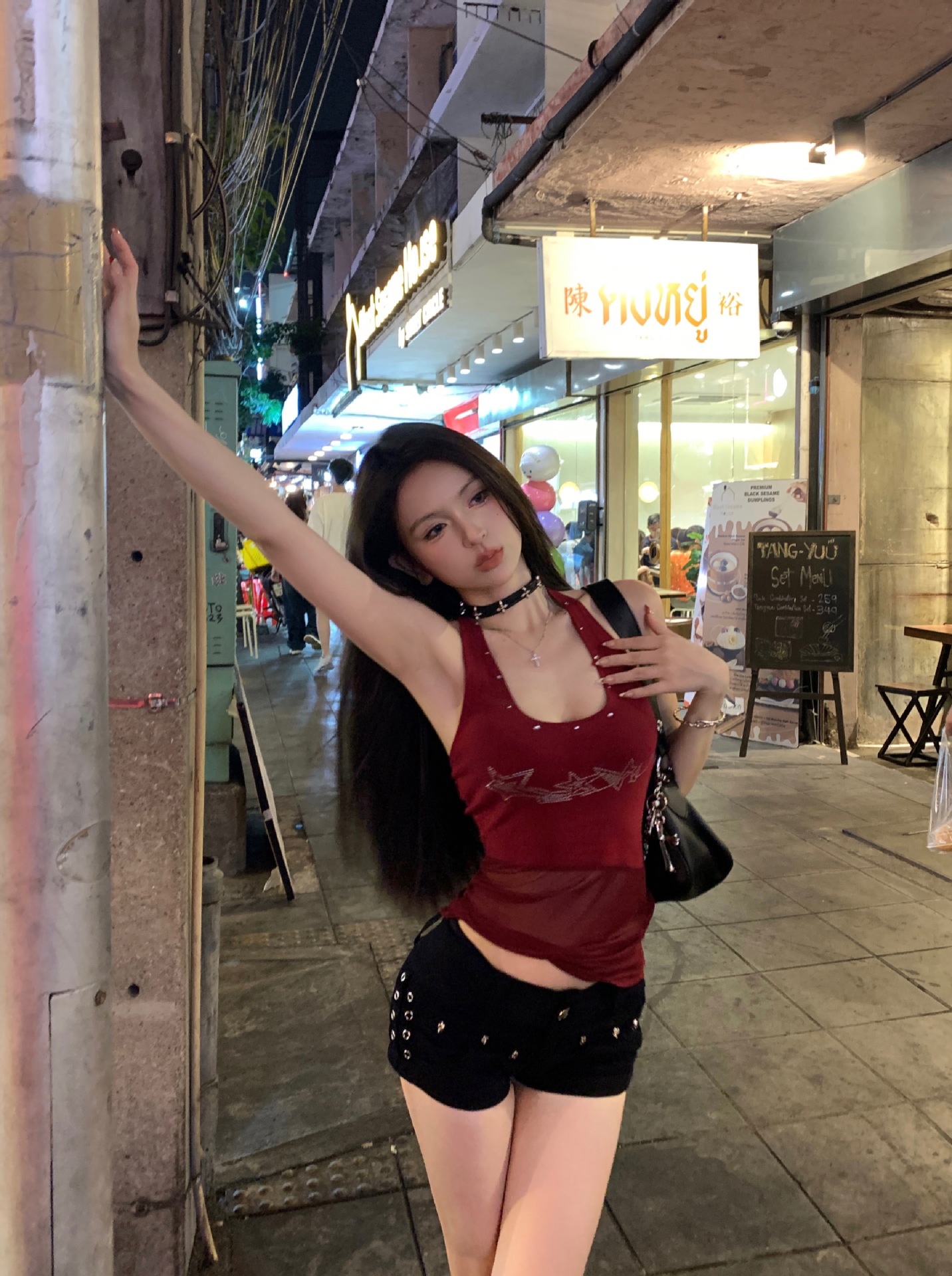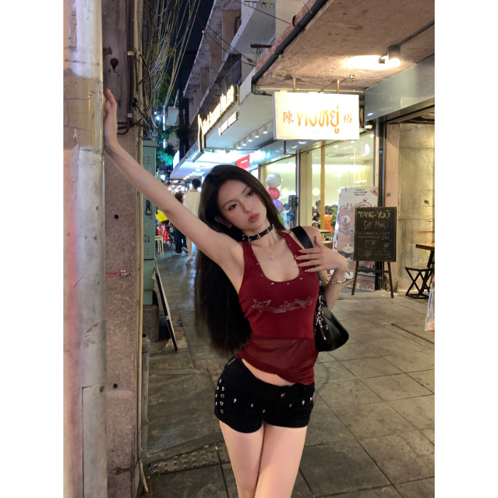 Американский ретро горячая девушка с горячим бриллиантом подтяжка жилет женский летом носить тонкая сетчатая пряжа, чтобы сшить красный топ без рукавов