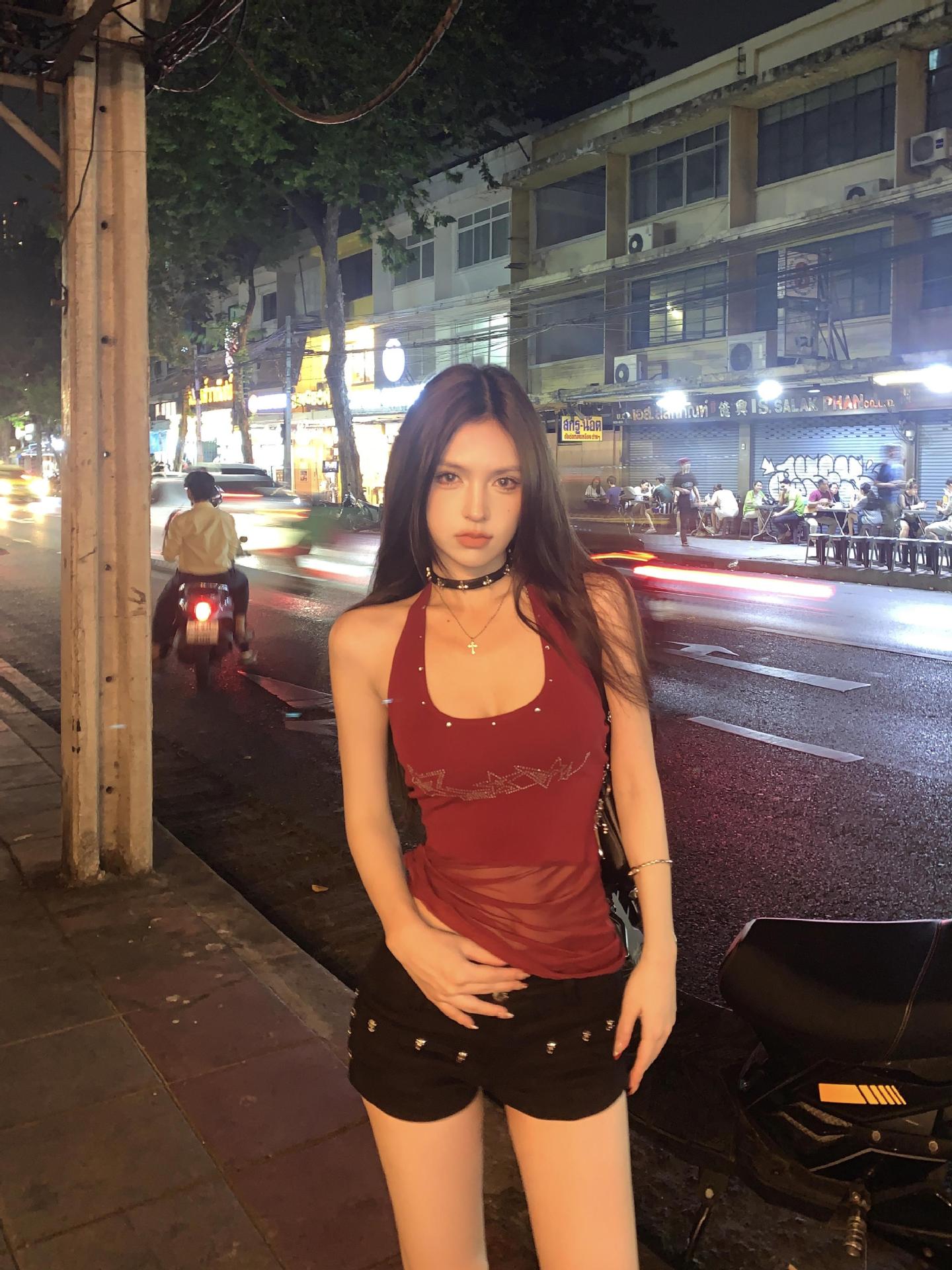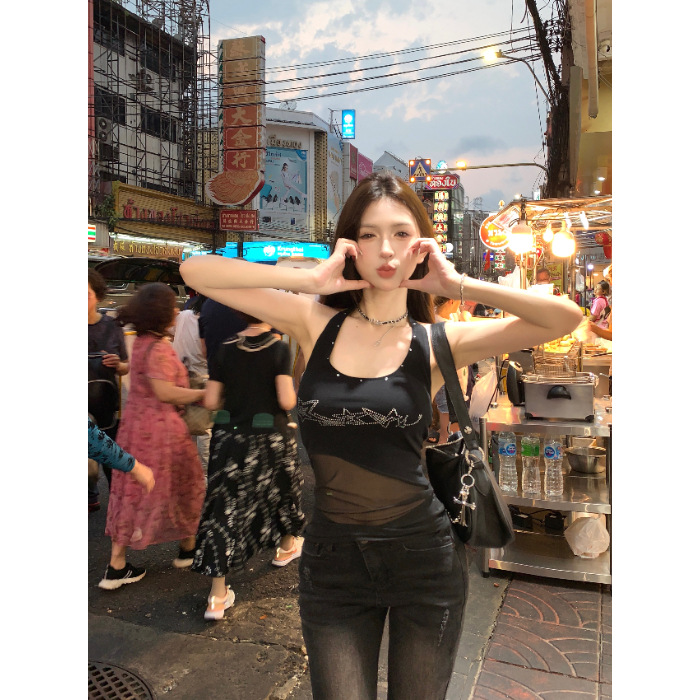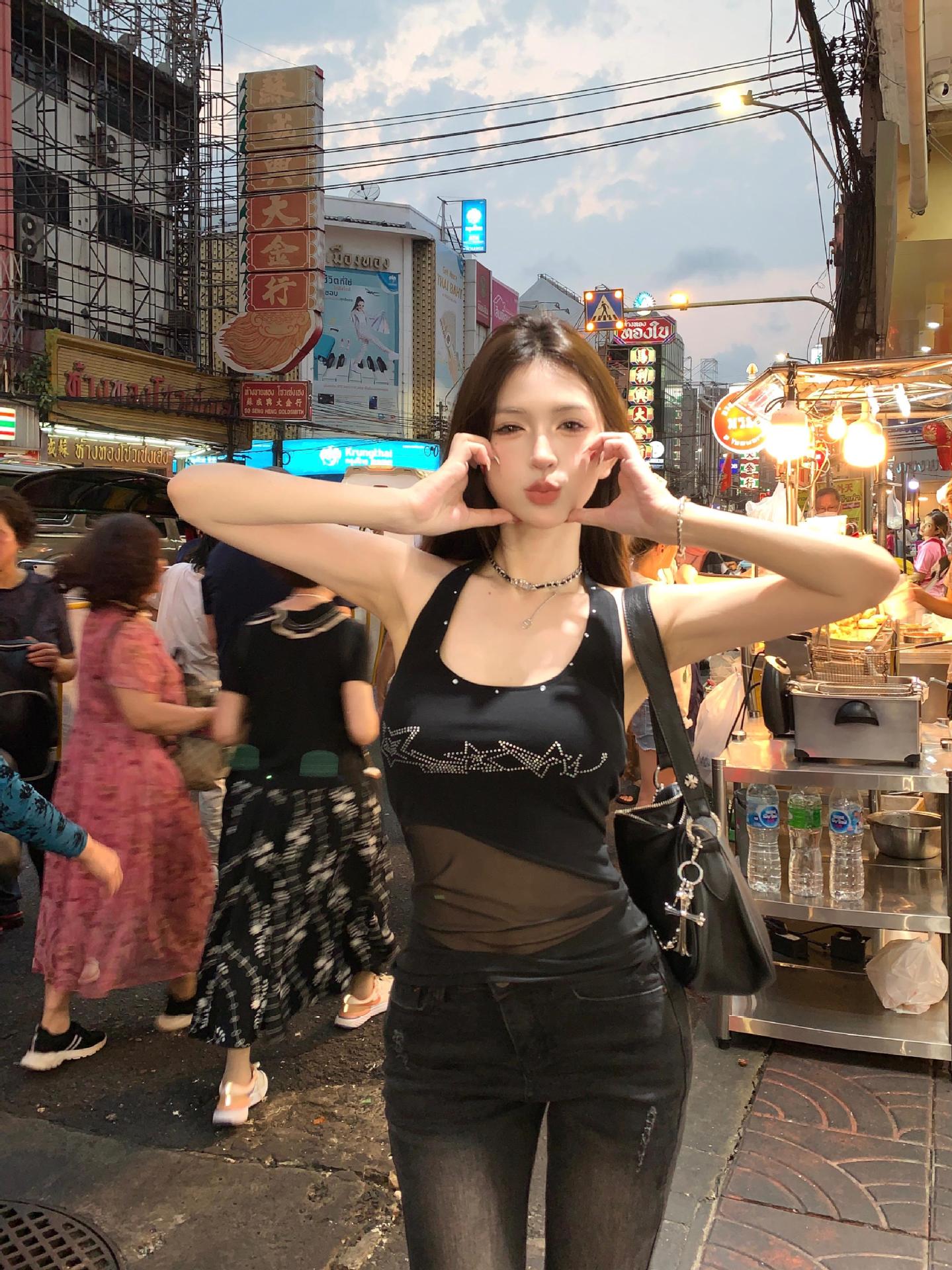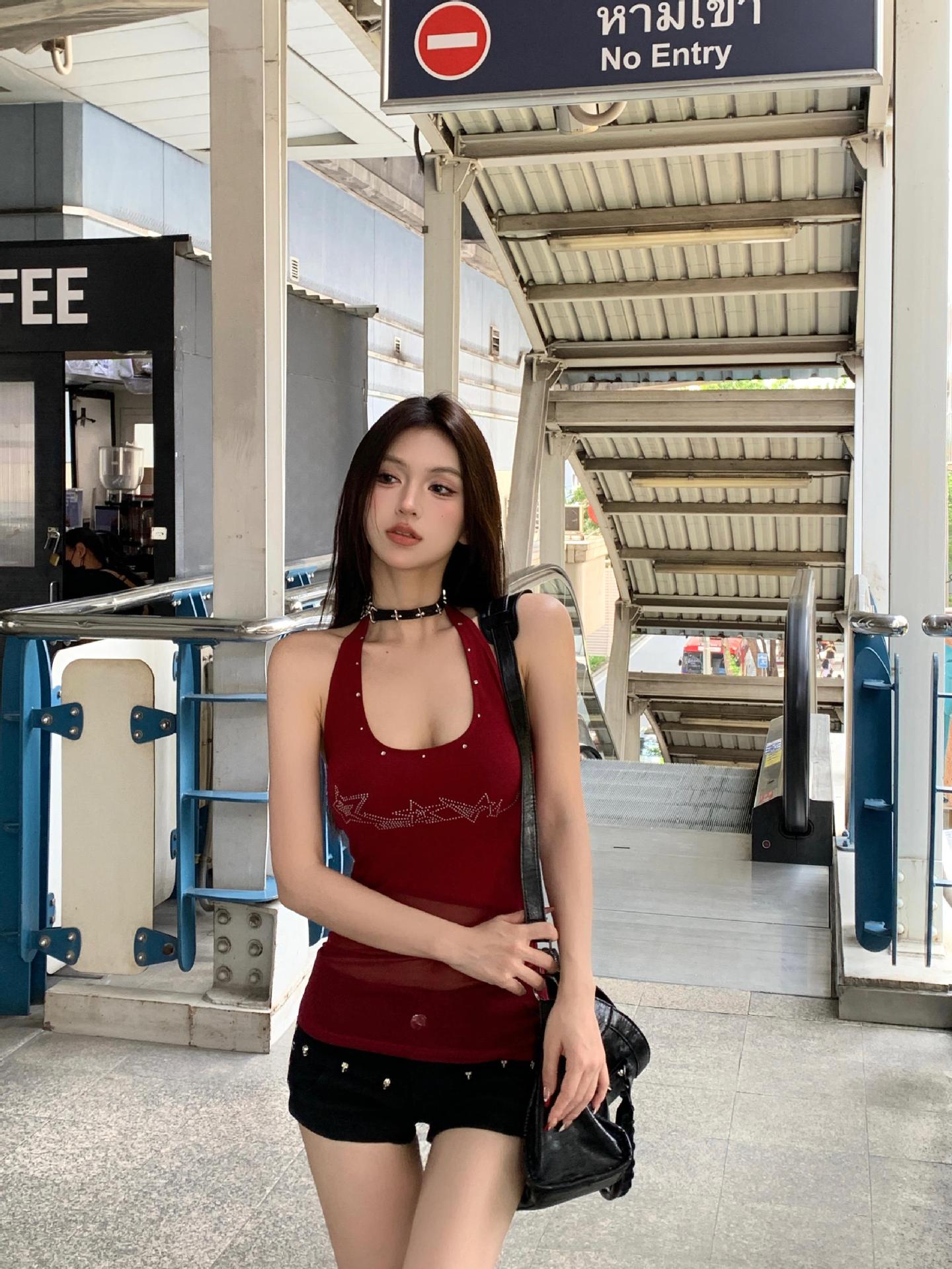 Американский ретро горячая девушка с горячим бриллиантом подтяжка жилет женский летом носить тонкая сетчатая пряжа, чтобы сшить красный топ без рукавов