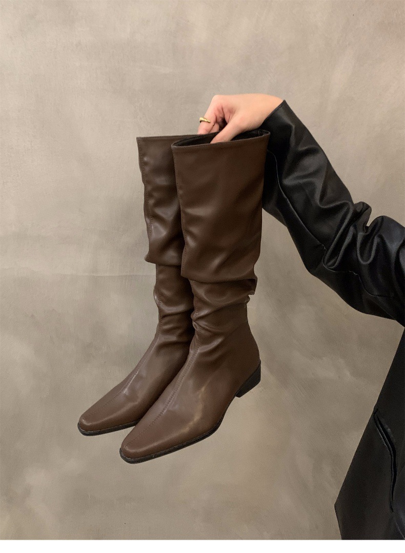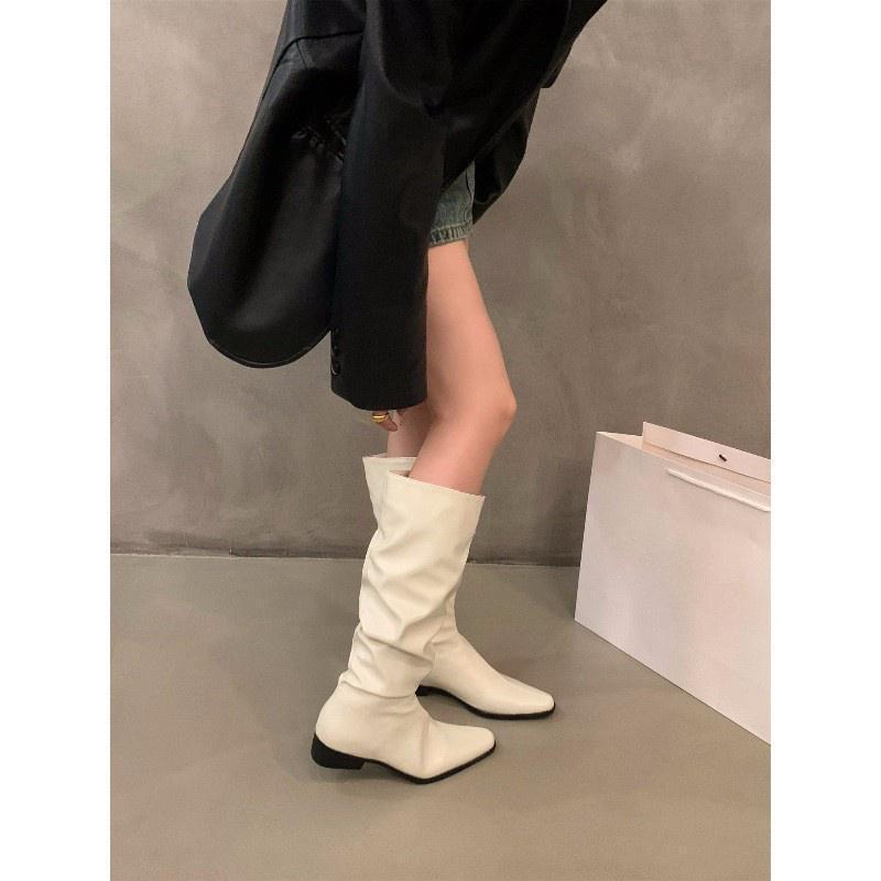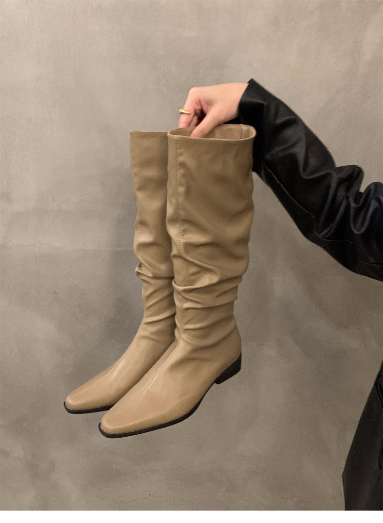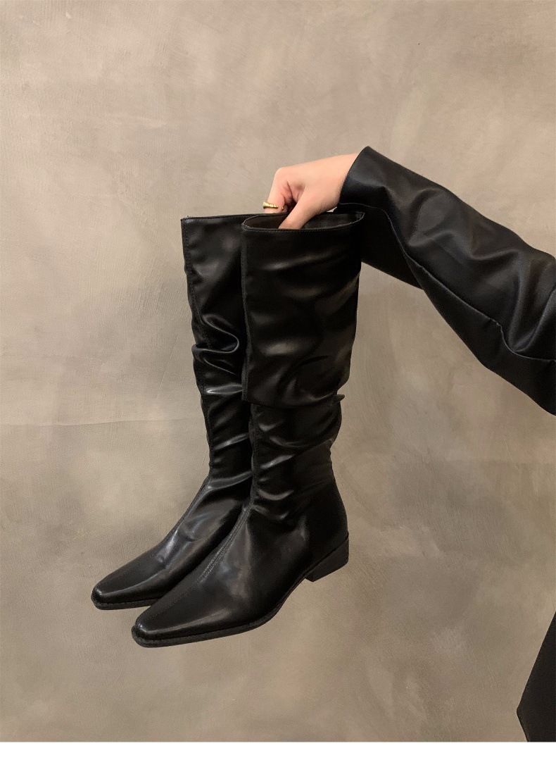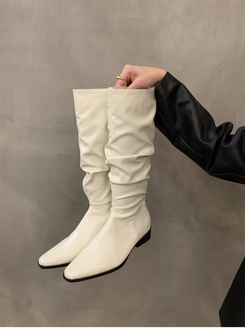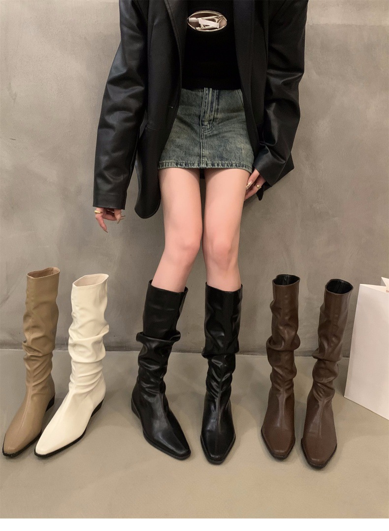 Толстые каблуки складки и складки длинные сапоги рыцаря женские туфли 2024 новая весна и осень на западе тонкие средние сапоги