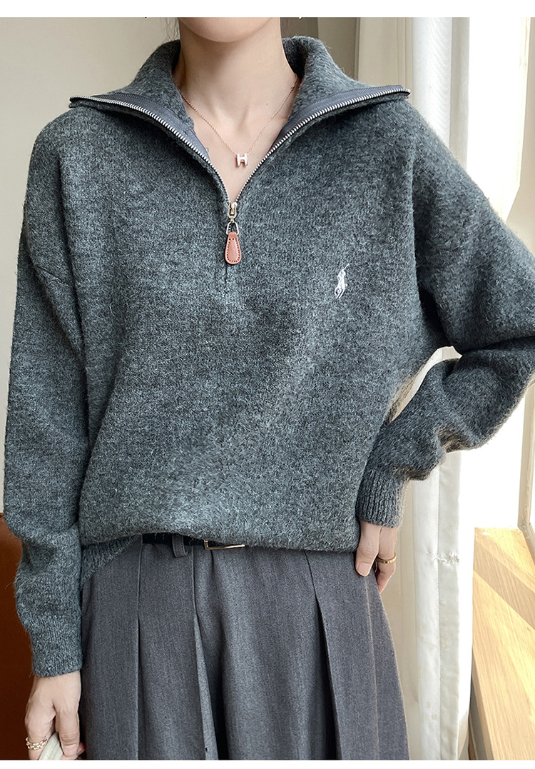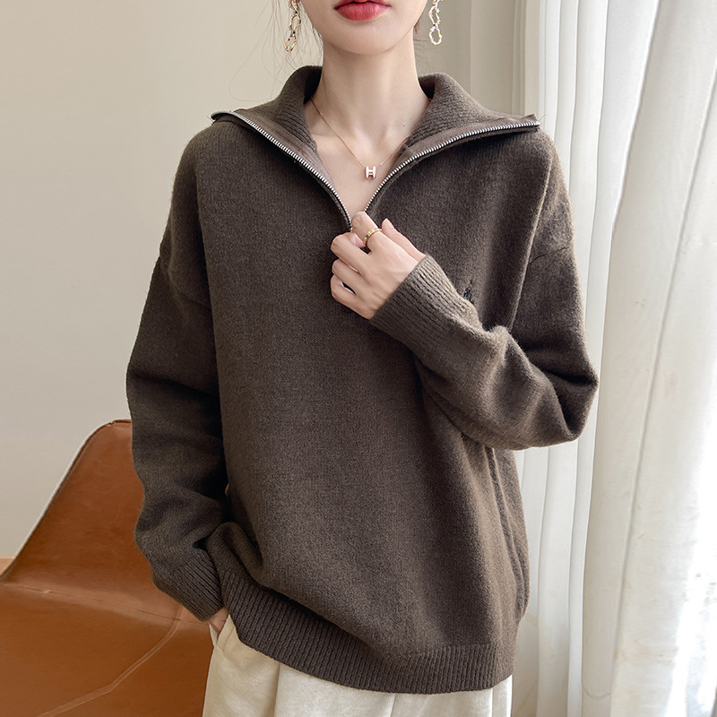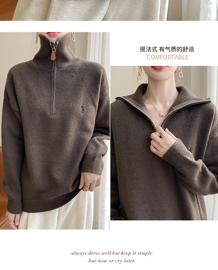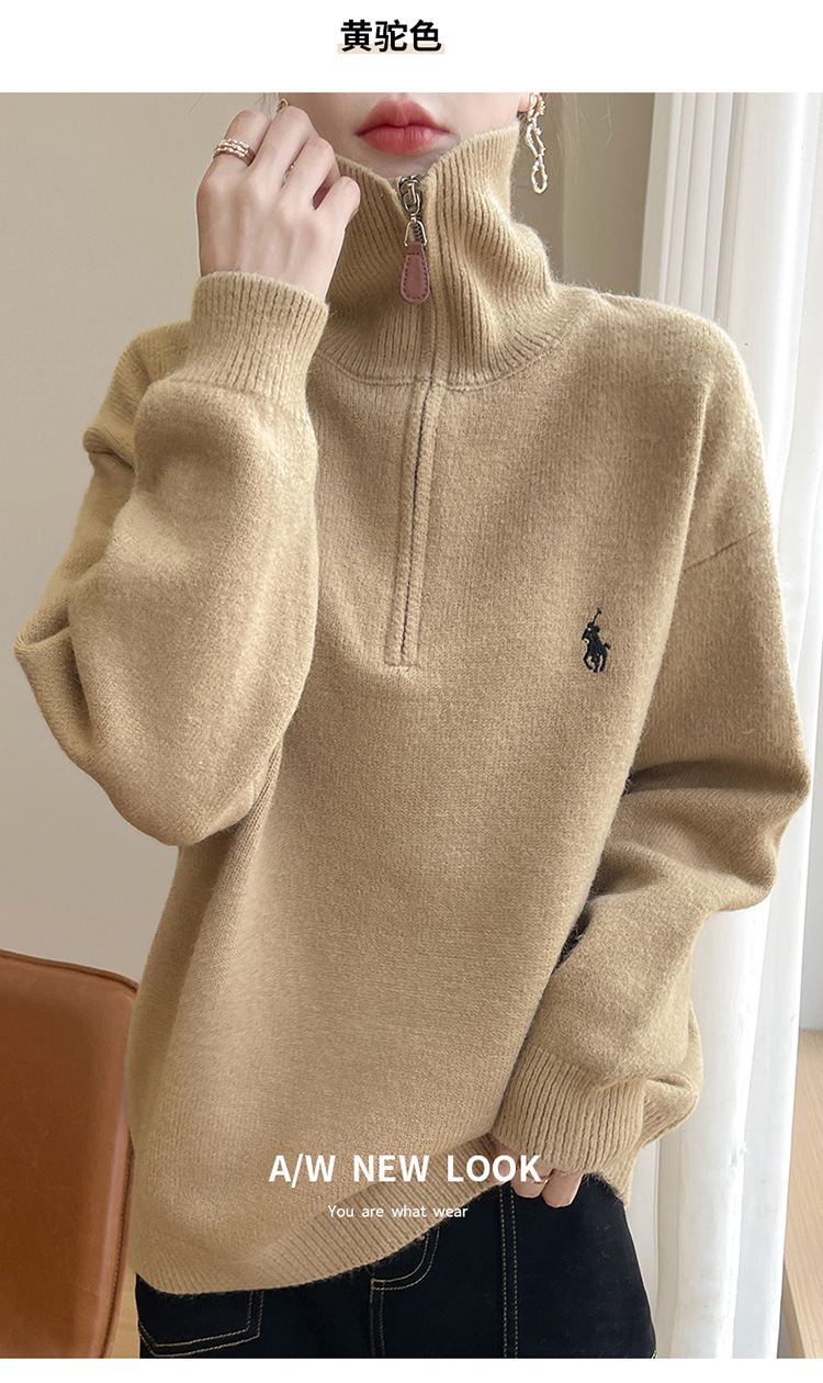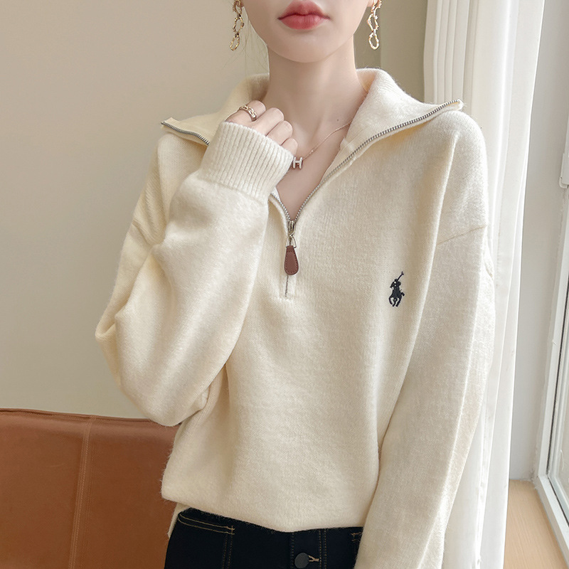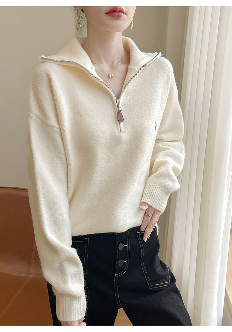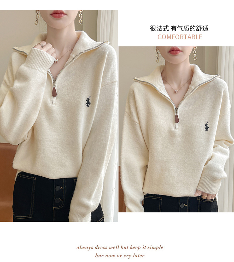 2024 осень и зима новый корейский пони с вышивкой полузастежкой-молнией свитер кувшина женский свободный дикий трикотажный топ