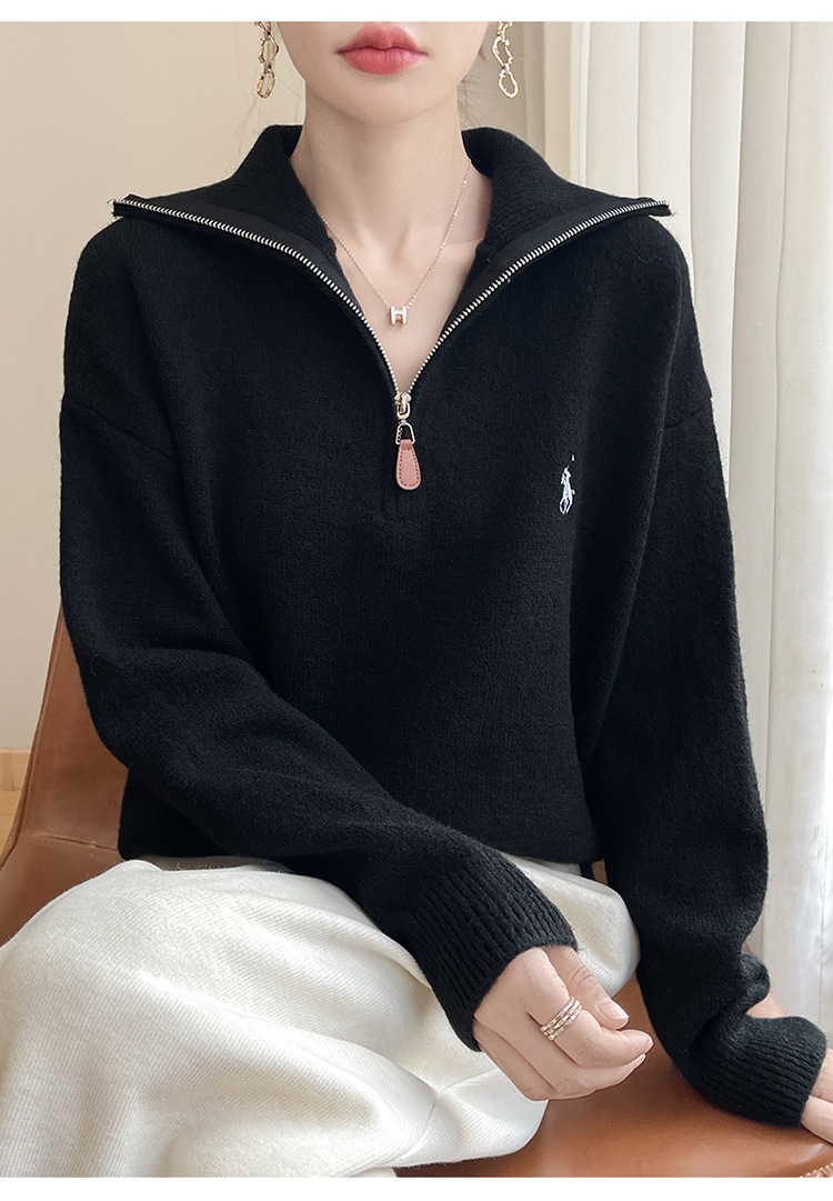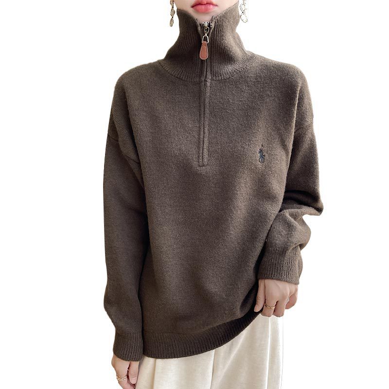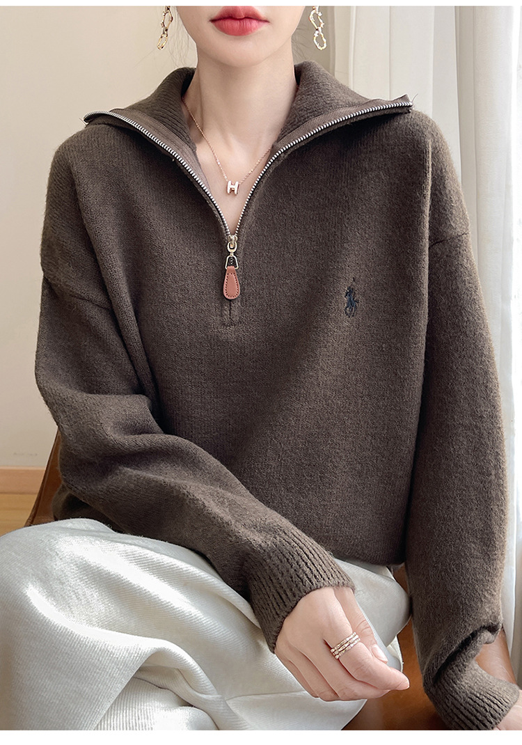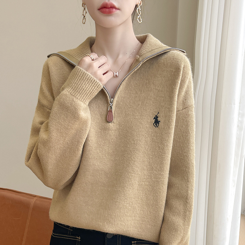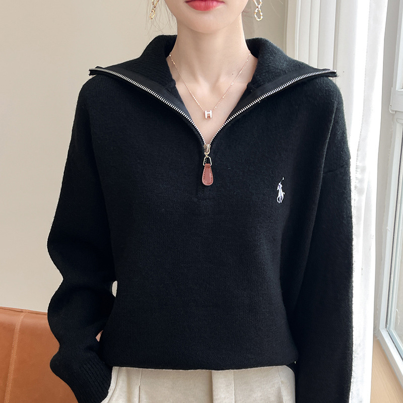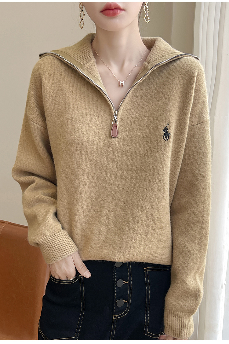 2024 осень и зима новый корейский пони с вышивкой полузастежкой-молнией свитер кувшина женский свободный дикий трикотажный топ