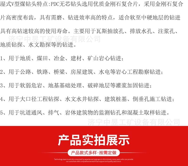 煤钻头是煤炭部推广的一种三小产品,分为干式和湿式两种。钻头体采用精铸、精煅和中碳合金钢切削加工等多种生产加工工艺,适应不同的钻头类型和不同钻孔作业条件的需求。