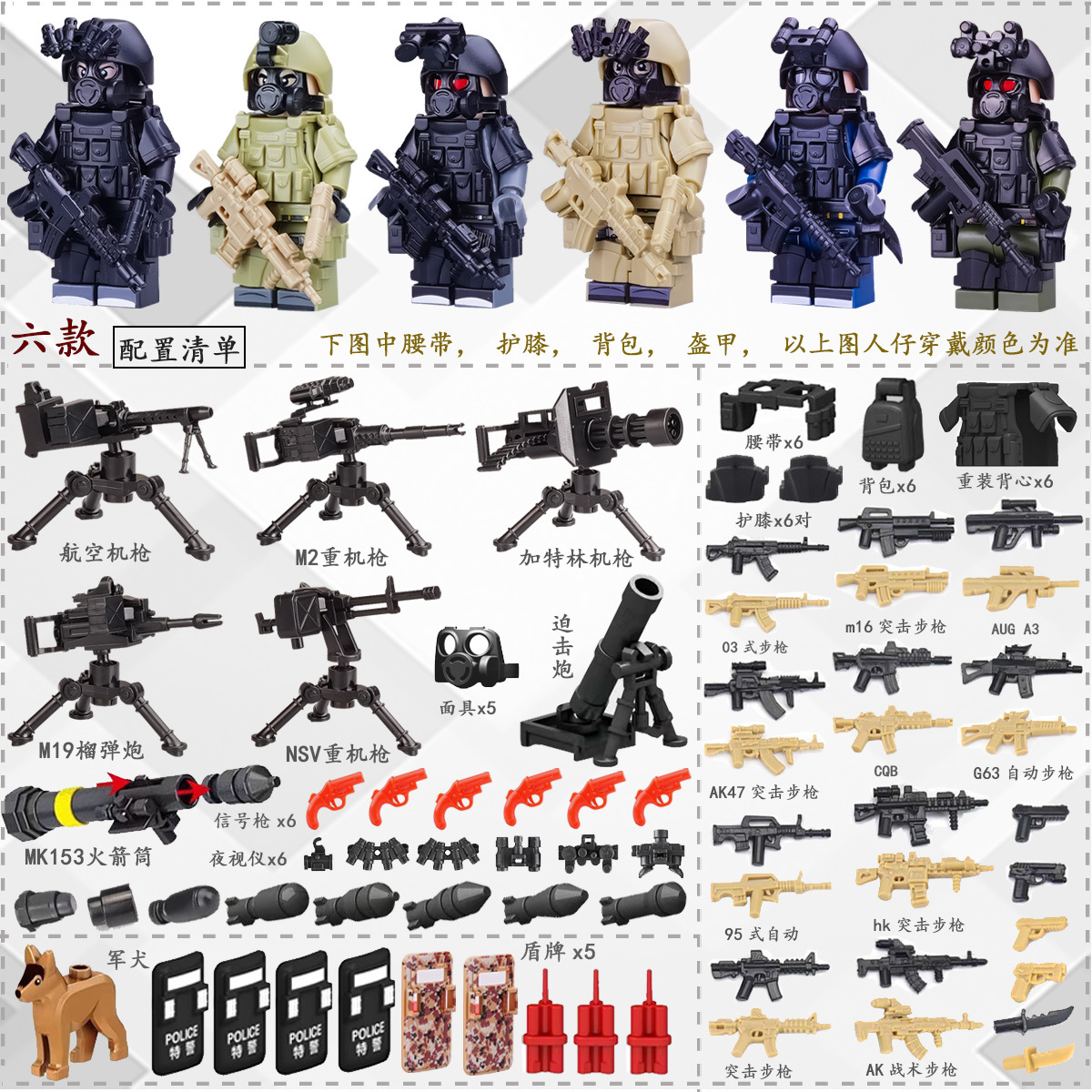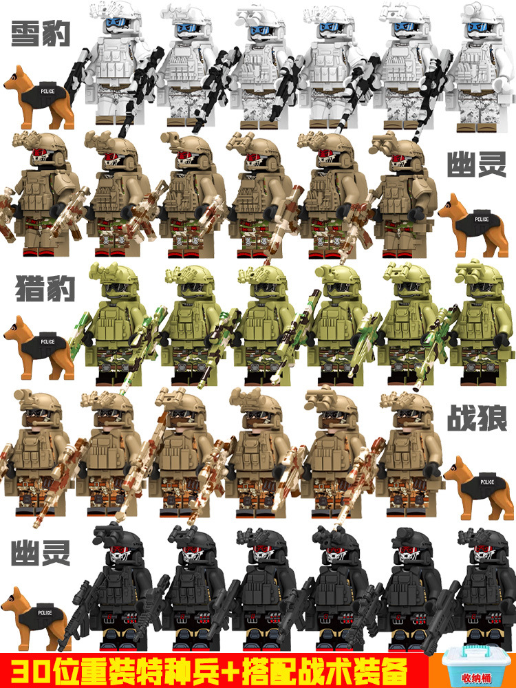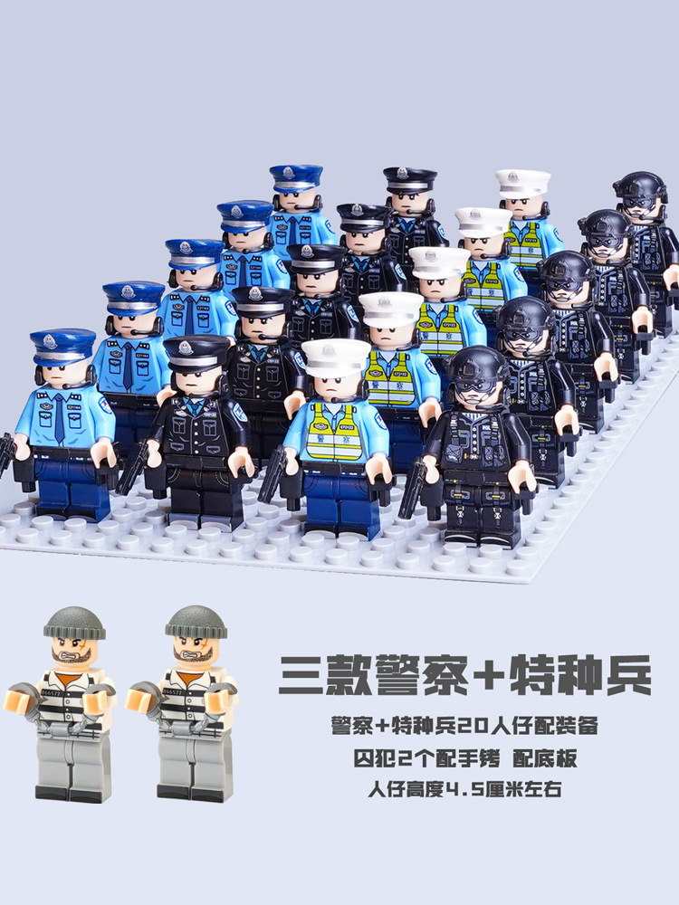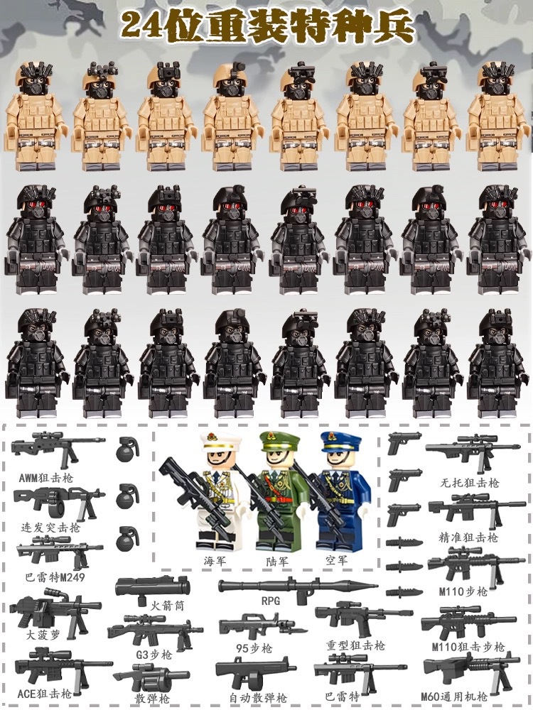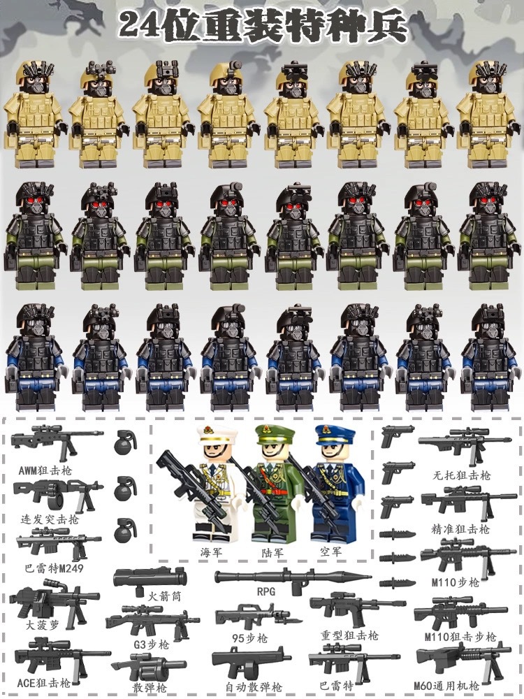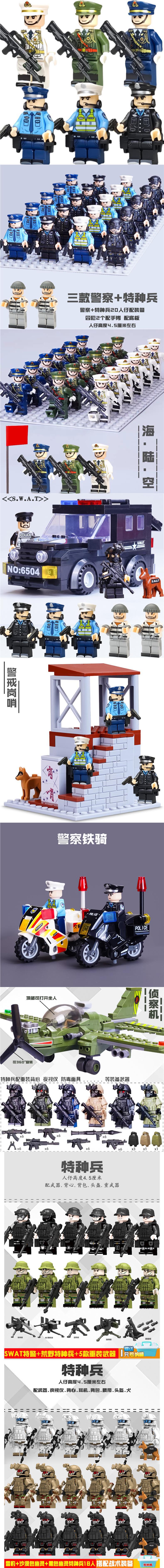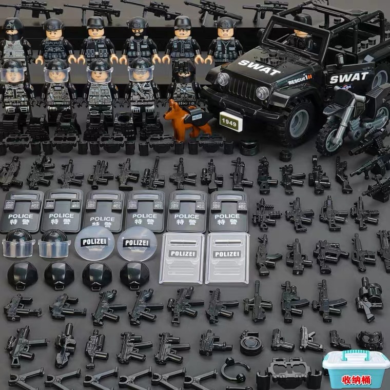 (3 вида полиции + спецназа) 20 человек + 2 заключенника + оружие на опорной пластине; Морские, сушевые и воздушные минифигурки 21 + оружие на опорной плите; Полицейская машина SWAT с 7 минифигурками; Команда патрулирования вертолета с 5 минифигурками; Синий полицейский квадратный массив 20 минифигурок + 2 заключенных + оружие на опорной пластине; Черный полицейский квадратный массив 20 минифигурок + 2 заключенных + оружие на опорной пластине; 20 минифигурок офисов дорожной полиции + 2 заключенных + оружие с базовой пластиной; Морские, сушевые и воздушные минифигурки 21 с опорной пластиной + микродвижки Тяньаньмен; Traffic + Black Police Motorcycle (как показано на рисунке); Морское, наземное и воздушное +3 полиция (6 минифигурок); Предупреждающий пост свисток с тремя полицейскими отделениями; Бронированная команда Scout с 6 минифигурками; Скоростная помощь боевого поля (на фото); Контейнер Bandit версии с 8 минифигурками; Soad надходит 8-фигурное противовесное оружие.; Шесть тяжелых спецназов с пачками оборудования; Специальные солдатские минифигурки типа А5 с сумкой для снаряжения; Специальные солдатские минифигурки типа B 5 с сумкой для снаряжения; Специальные солдатские минифигурки в стиле C 5, с сумкой для снаряжения; (Волк + Гепард + Снежный Леопард + Призрак Пустыни + Черный Призрак) 30 человек с оружием + Ведро; (SWAT SWAT + дикая прическа) 12 человек + 5 тяжелых инвентаря + ведро; (Снежный леопард + Призрак пустыни + Черный Призрак) 18 человек с оружием + ведро для хранения; (Волк + Гепард + Черный Призрак) 18 человек сооружением + ведро для хранения вещей; 142 штуки оружия и снаряжения + ведро для хранения; SWAT SWAT 6 человек сооружением; Специальные силы в дикой природе 6 человек с оружием; K шесть видов тяжелых спецназа сооружением; Desert Ghost Squad 6 человек + рулевой станок с землистыми кронштейнами; Black Ghost Squad 6 человек + черный кронштейн-пистолет; Специальная команда Snow Leopard 6 человек + черный кронштейн-пистолет; Специальная команда Wolf 6 человек + Машинный пистолет с кронштейнами земного цвета; Специальная команда Cheetah 6 + военный зеленый кронштейн-пистолет; 24-битное переустановленное спецназа ABC + морское, сушевое и воздушное оружие + ведро для хранения; 24-битное переустановленное спецназа DEF + морское, сушевое и воздушное оружие + ведро для хранения; City Police Team 51 человек + полицейский автомобильный самолет + ведро для хранения вещей; Коллекция городской полиции 30 минифигурок + джип + ведро для хранения; Городская полицейская история 14 минифигурок + полицейская машина + ведро для хранения; Камуфляжная спецназа 12 минифигурок + джип + ведро для хранения; Минифигурки Dragon Tiger Police 12 + джип + ведро для хранения; Black Hummer Armor с 6 минифигурками; Военная зеленая броня Hummer с 6 минифигурками; Броня пустыни Color Hummer с 6 минифигурками; Подставка для флага (на фото) поставляется с тремя минифигурками.