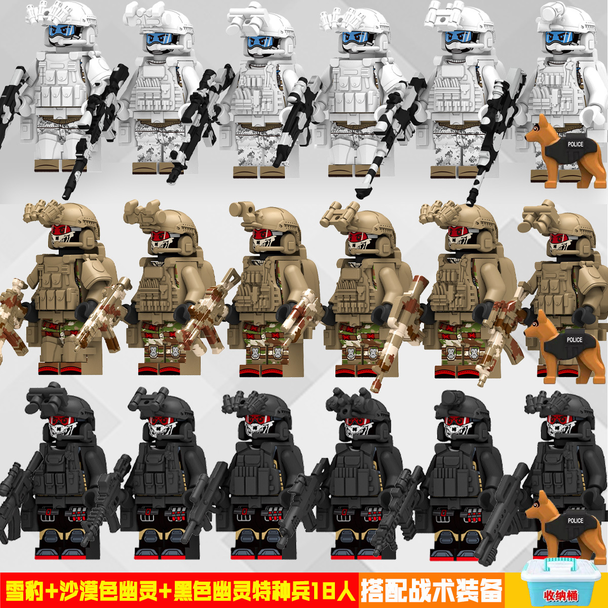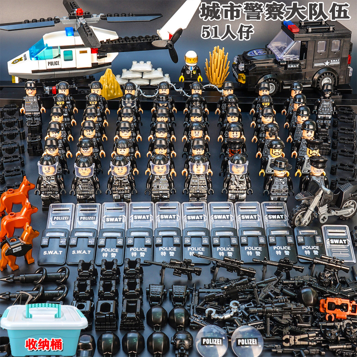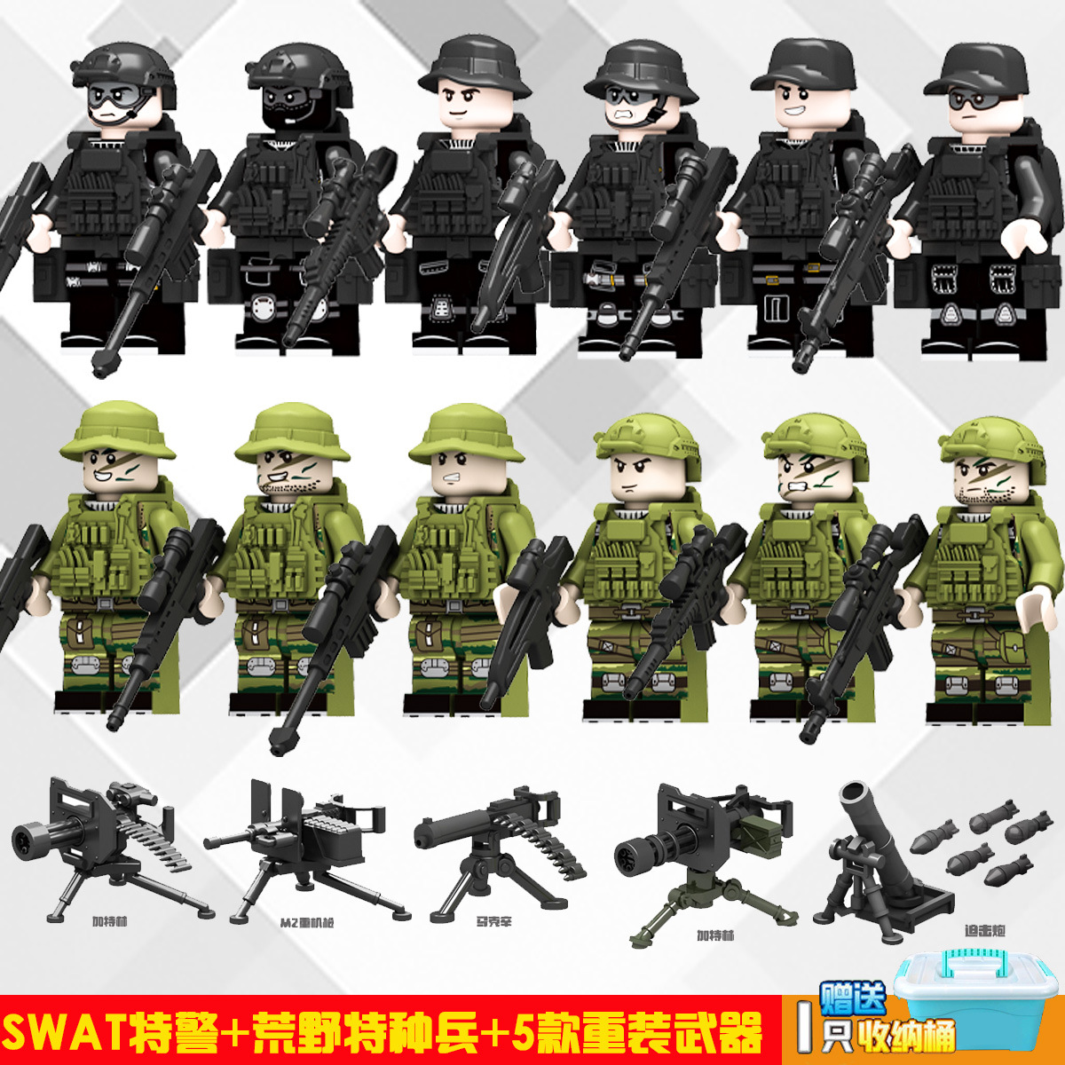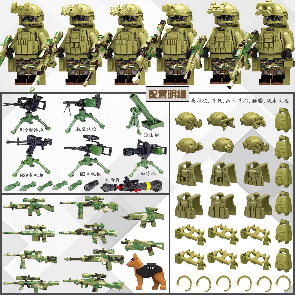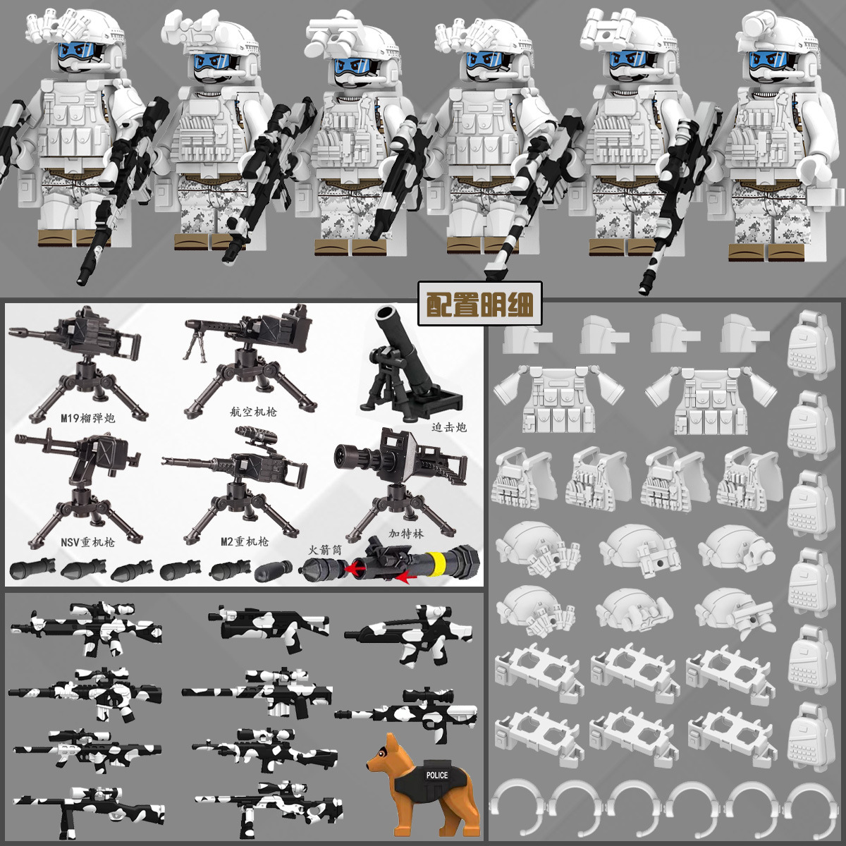(3 вида полиции + спецназа) 20 человек + 2 заключенника + оружие на опорной пластине; Морские, сушевые и воздушные минифигурки 21 + оружие на опорной плите; Полицейская машина SWAT с 7 минифигурками; Команда патрулирования вертолета с 5 минифигурками; Синий полицейский квадратный массив 20 минифигурок + 2 заключенных + оружие на опорной пластине; Черный полицейский квадратный массив 20 минифигурок + 2 заключенных + оружие на опорной пластине; 20 минифигурок офисов дорожной полиции + 2 заключенных + оружие с базовой пластиной; Морские, сушевые и воздушные минифигурки 21 с опорной пластиной + микродвижки Тяньаньмен; Traffic + Black Police Motorcycle (как показано на рисунке); Морское, наземное и воздушное +3 полиция (6 минифигурок); Предупреждающий пост свисток с тремя полицейскими отделениями; Бронированная команда Scout с 6 минифигурками; Скоростная помощь боевого поля (на фото); Контейнер Bandit версии с 8 минифигурками; Soad надходит 8-фигурное противовесное оружие.; Шесть тяжелых спецназов с пачками оборудования; Специальные солдатские минифигурки типа А5 с сумкой для снаряжения; Специальные солдатские минифигурки типа B 5 с сумкой для снаряжения; Специальные солдатские минифигурки в стиле C 5, с сумкой для снаряжения; (Волк + Гепард + Снежный Леопард + Призрак Пустыни + Черный Призрак) 30 человек с оружием + Ведро; (SWAT SWAT + дикая прическа) 12 человек + 5 тяжелых инвентаря + ведро; (Снежный леопард + Призрак пустыни + Черный Призрак) 18 человек с оружием + ведро для хранения; (Волк + Гепард + Черный Призрак) 18 человек сооружением + ведро для хранения вещей; 142 штуки оружия и снаряжения + ведро для хранения; SWAT SWAT 6 человек сооружением; Специальные силы в дикой природе 6 человек с оружием; K шесть видов тяжелых спецназа сооружением; Desert Ghost Squad 6 человек + рулевой станок с землистыми кронштейнами; Black Ghost Squad 6 человек + черный кронштейн-пистолет; Специальная команда Snow Leopard 6 человек + черный кронштейн-пистолет; Специальная команда Wolf 6 человек + Машинный пистолет с кронштейнами земного цвета; Специальная команда Cheetah 6 + военный зеленый кронштейн-пистолет; 24-битное переустановленное спецназа ABC + морское, сушевое и воздушное оружие + ведро для хранения; 24-битное переустановленное спецназа DEF + морское, сушевое и воздушное оружие + ведро для хранения; City Police Team 51 человек + полицейский автомобильный самолет + ведро для хранения вещей; Коллекция городской полиции 30 минифигурок + джип + ведро для хранения; Городская полицейская история 14 минифигурок + полицейская машина + ведро для хранения; Камуфляжная спецназа 12 минифигурок + джип + ведро для хранения; Минифигурки Dragon Tiger Police 12 + джип + ведро для хранения; Black Hummer Armor с 6 минифигурками; Военная зеленая броня Hummer с 6 минифигурками; Броня пустыни Color Hummer с 6 минифигурками; Подставка для флага (на фото) поставляется с тремя минифигурками.