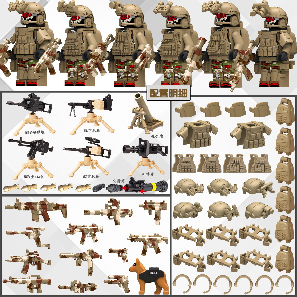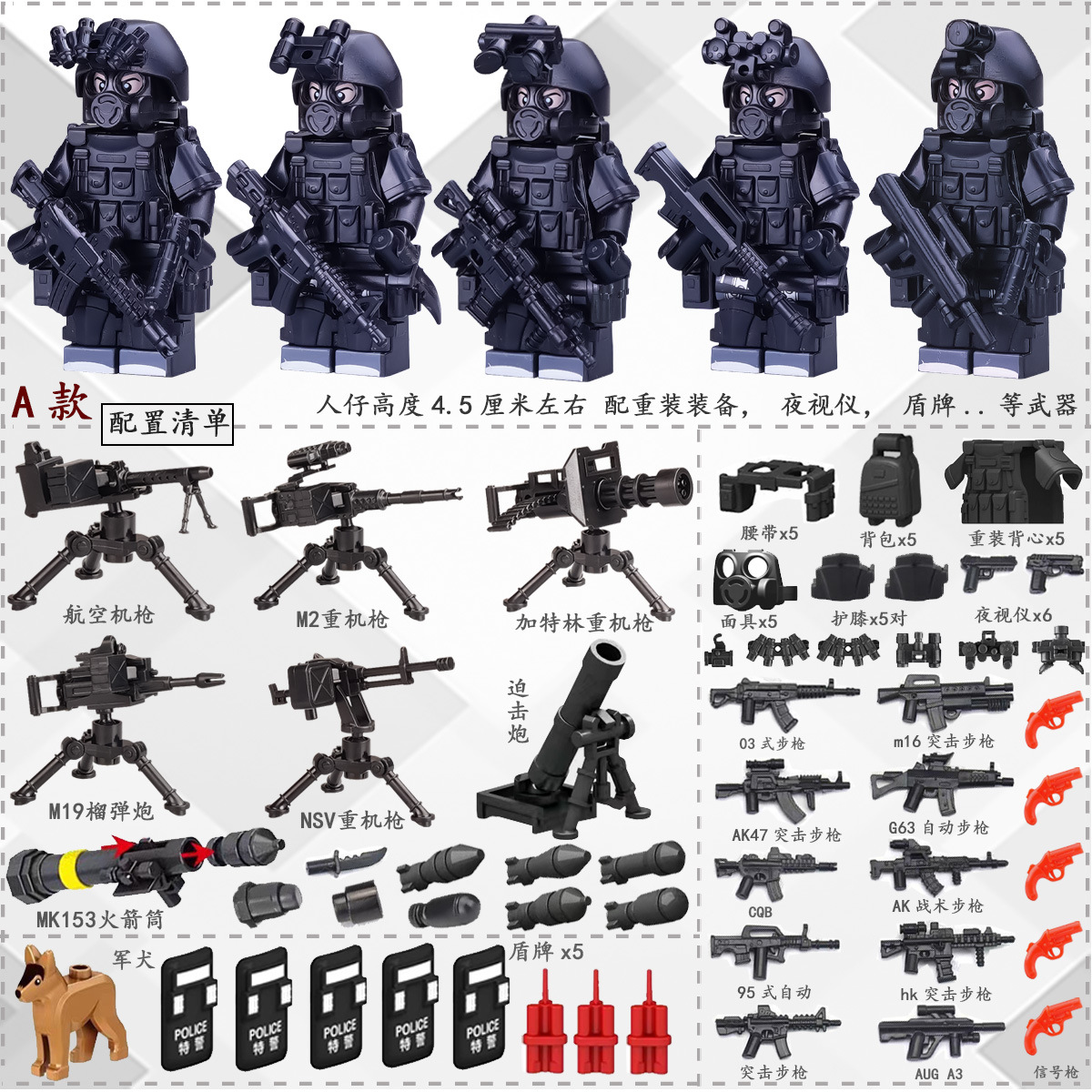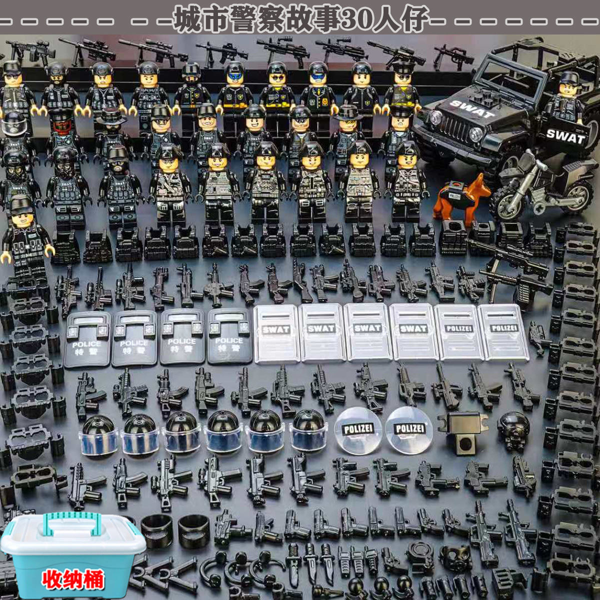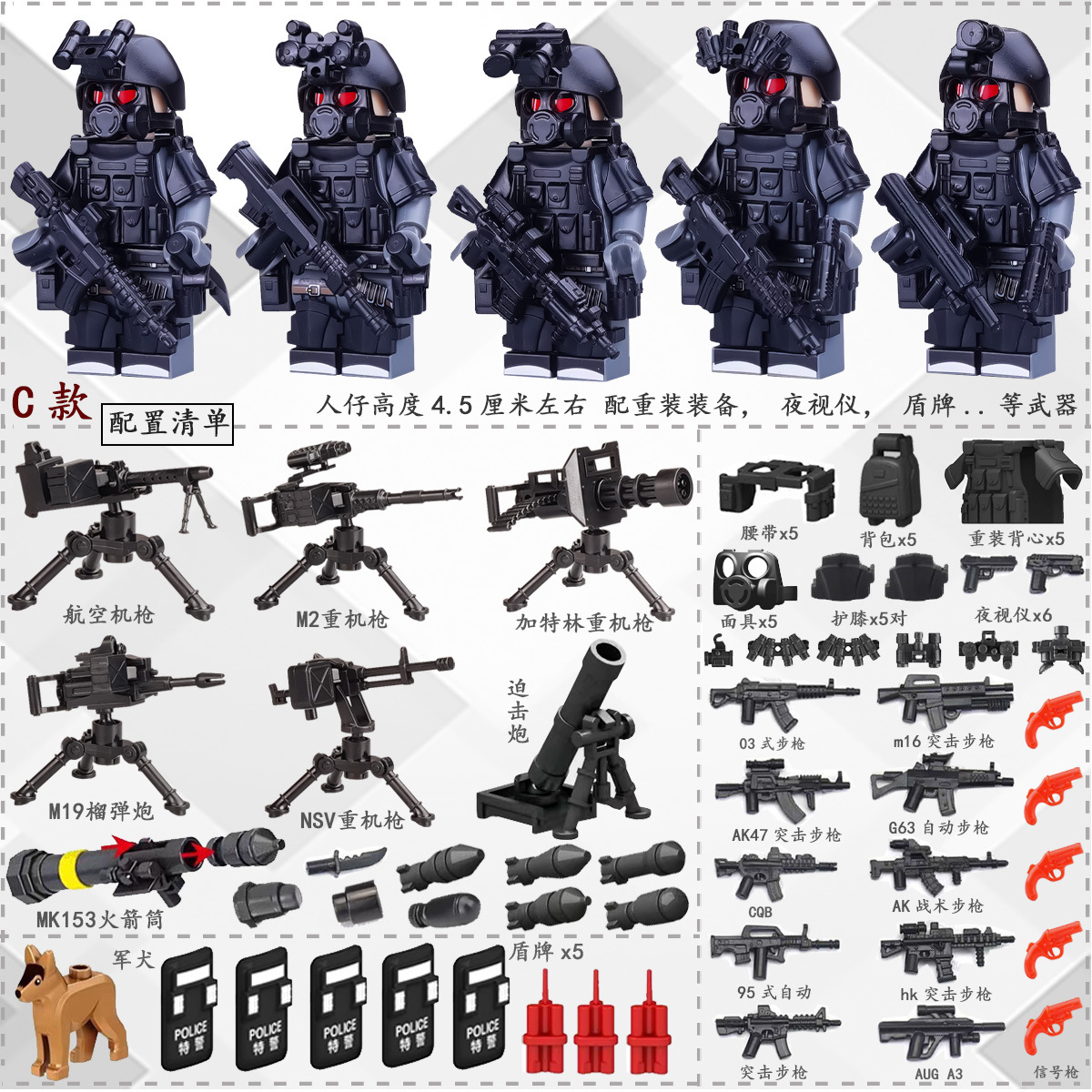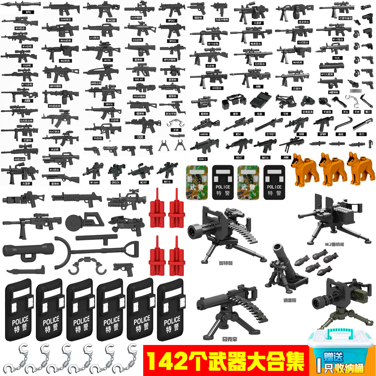 (3 вида полиции + спецназа) 20 человек + 2 заключенника + оружие на опорной пластине; Морские, сушевые и воздушные минифигурки 21 + оружие на опорной плите; Полицейская машина SWAT с 7 минифигурками; Команда патрулирования вертолета с 5 минифигурками; Синий полицейский квадратный массив 20 минифигурок + 2 заключенных + оружие на опорной пластине; Черный полицейский квадратный массив 20 минифигурок + 2 заключенных + оружие на опорной пластине; 20 минифигурок офисов дорожной полиции + 2 заключенных + оружие с базовой пластиной; Морские, сушевые и воздушные минифигурки 21 с опорной пластиной + микродвижки Тяньаньмен; Traffic + Black Police Motorcycle (как показано на рисунке); Морское, наземное и воздушное +3 полиция (6 минифигурок); Предупреждающий пост свисток с тремя полицейскими отделениями; Бронированная команда Scout с 6 минифигурками; Скоростная помощь боевого поля (на фото); Контейнер Bandit версии с 8 минифигурками; Soad надходит 8-фигурное противовесное оружие.; Шесть тяжелых спецназов с пачками оборудования; Специальные солдатские минифигурки типа А5 с сумкой для снаряжения; Специальные солдатские минифигурки типа B 5 с сумкой для снаряжения; Специальные солдатские минифигурки в стиле C 5, с сумкой для снаряжения; (Волк + Гепард + Снежный Леопард + Призрак Пустыни + Черный Призрак) 30 человек с оружием + Ведро; (SWAT SWAT + дикая прическа) 12 человек + 5 тяжелых инвентаря + ведро; (Снежный леопард + Призрак пустыни + Черный Призрак) 18 человек с оружием + ведро для хранения; (Волк + Гепард + Черный Призрак) 18 человек сооружением + ведро для хранения вещей; 142 штуки оружия и снаряжения + ведро для хранения; SWAT SWAT 6 человек сооружением; Специальные силы в дикой природе 6 человек с оружием; K шесть видов тяжелых спецназа сооружением; Desert Ghost Squad 6 человек + рулевой станок с землистыми кронштейнами; Black Ghost Squad 6 человек + черный кронштейн-пистолет; Специальная команда Snow Leopard 6 человек + черный кронштейн-пистолет; Специальная команда Wolf 6 человек + Машинный пистолет с кронштейнами земного цвета; Специальная команда Cheetah 6 + военный зеленый кронштейн-пистолет; 24-битное переустановленное спецназа ABC + морское, сушевое и воздушное оружие + ведро для хранения; 24-битное переустановленное спецназа DEF + морское, сушевое и воздушное оружие + ведро для хранения; City Police Team 51 человек + полицейский автомобильный самолет + ведро для хранения вещей; Коллекция городской полиции 30 минифигурок + джип + ведро для хранения; Городская полицейская история 14 минифигурок + полицейская машина + ведро для хранения; Камуфляжная спецназа 12 минифигурок + джип + ведро для хранения; Минифигурки Dragon Tiger Police 12 + джип + ведро для хранения; Black Hummer Armor с 6 минифигурками; Военная зеленая броня Hummer с 6 минифигурками; Броня пустыни Color Hummer с 6 минифигурками; Подставка для флага (на фото) поставляется с тремя минифигурками.
