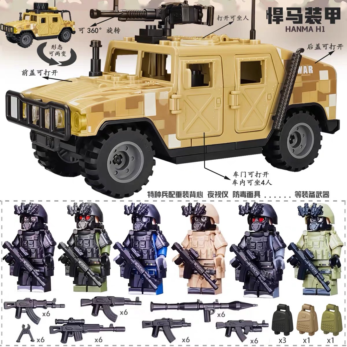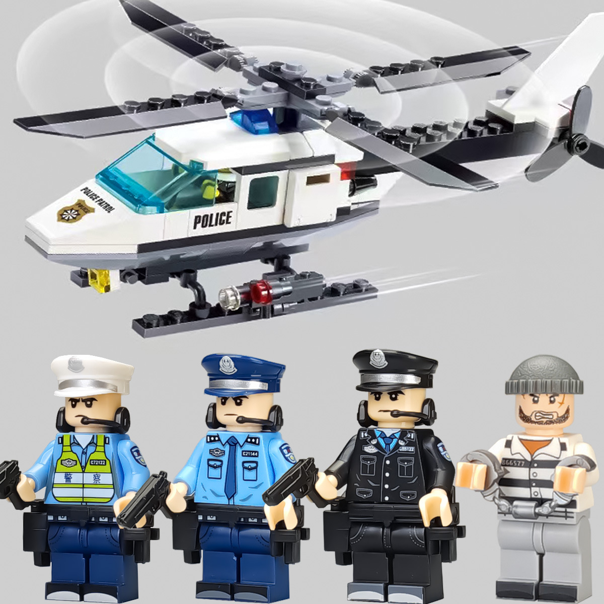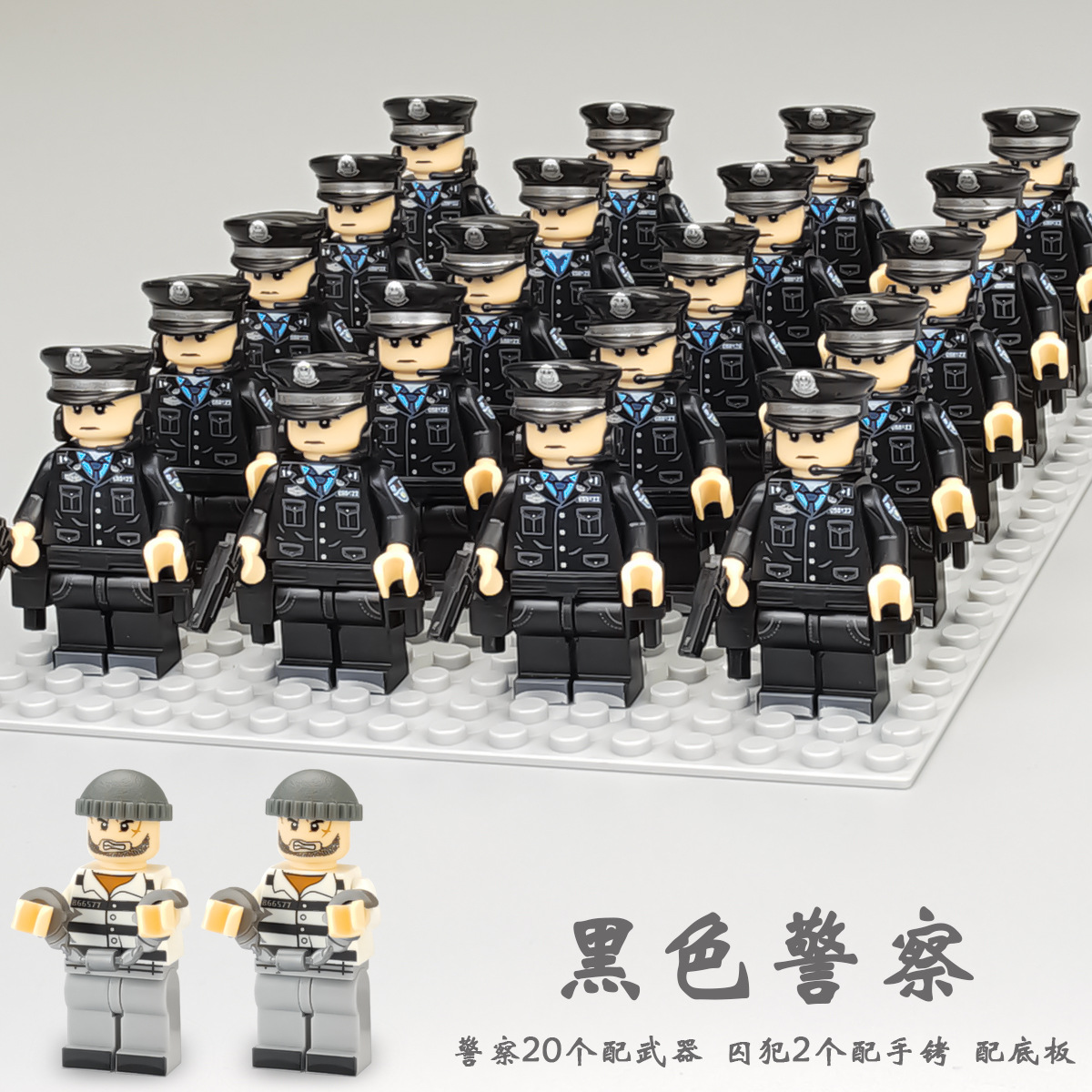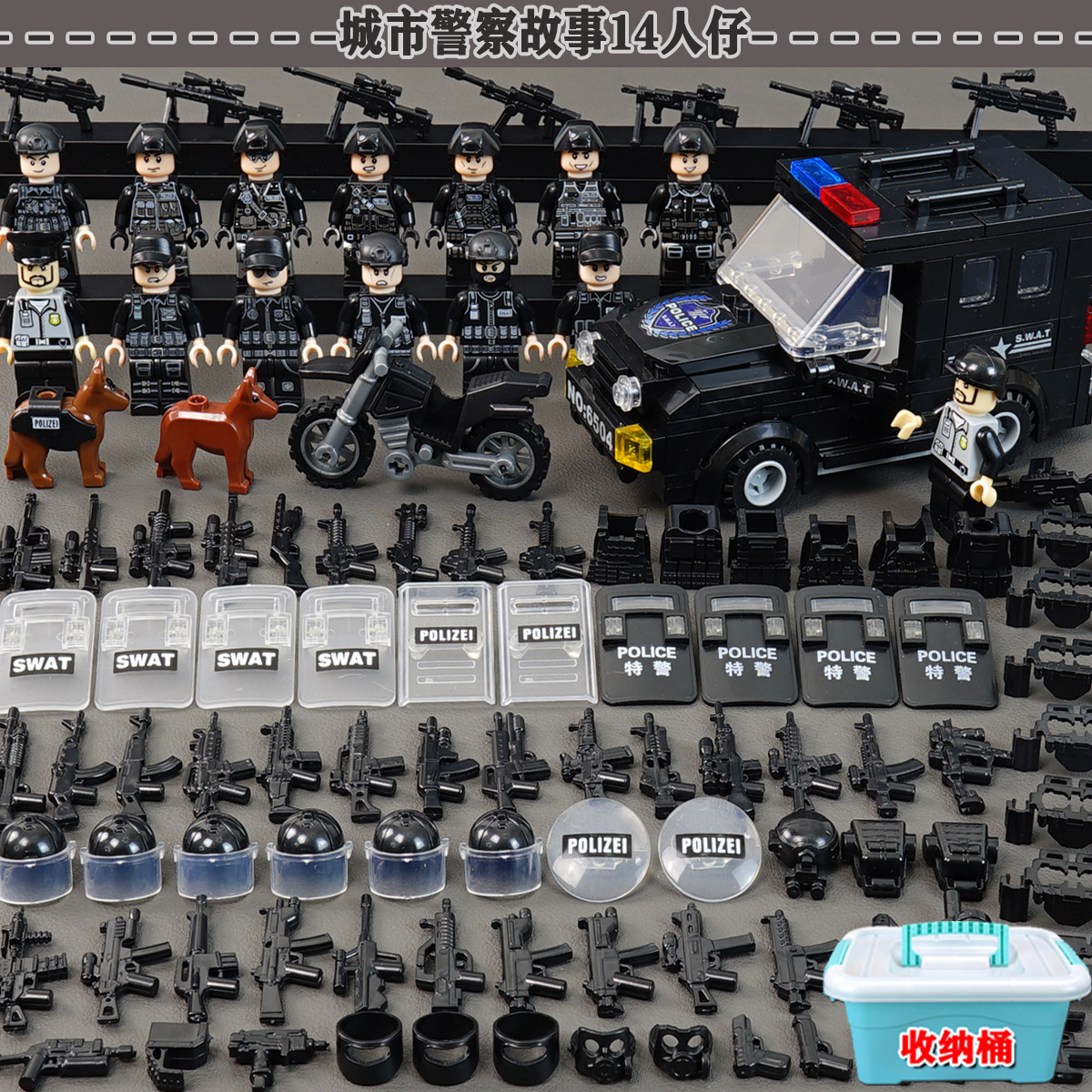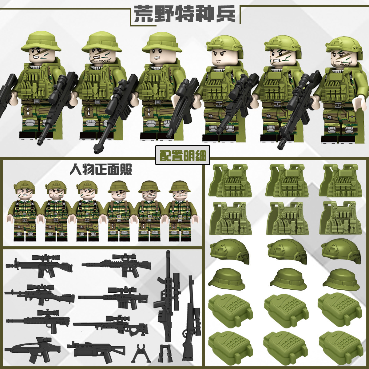 (3 вида полиции + спецназа) 20 человек + 2 заключенника + оружие на опорной пластине; Морские, сушевые и воздушные минифигурки 21 + оружие на опорной плите; Полицейская машина SWAT с 7 минифигурками; Команда патрулирования вертолета с 5 минифигурками; Синий полицейский квадратный массив 20 минифигурок + 2 заключенных + оружие на опорной пластине; Черный полицейский квадратный массив 20 минифигурок + 2 заключенных + оружие на опорной пластине; 20 минифигурок офисов дорожной полиции + 2 заключенных + оружие с базовой пластиной; Морские, сушевые и воздушные минифигурки 21 с опорной пластиной + микродвижки Тяньаньмен; Traffic + Black Police Motorcycle (как показано на рисунке); Морское, наземное и воздушное +3 полиция (6 минифигурок); Предупреждающий пост свисток с тремя полицейскими отделениями; Бронированная команда Scout с 6 минифигурками; Скоростная помощь боевого поля (на фото); Контейнер Bandit версии с 8 минифигурками; Soad надходит 8-фигурное противовесное оружие.; Шесть тяжелых спецназов с пачками оборудования; Специальные солдатские минифигурки типа А5 с сумкой для снаряжения; Специальные солдатские минифигурки типа B 5 с сумкой для снаряжения; Специальные солдатские минифигурки в стиле C 5, с сумкой для снаряжения; (Волк + Гепард + Снежный Леопард + Призрак Пустыни + Черный Призрак) 30 человек с оружием + Ведро; (SWAT SWAT + дикая прическа) 12 человек + 5 тяжелых инвентаря + ведро; (Снежный леопард + Призрак пустыни + Черный Призрак) 18 человек с оружием + ведро для хранения; (Волк + Гепард + Черный Призрак) 18 человек сооружением + ведро для хранения вещей; 142 штуки оружия и снаряжения + ведро для хранения; SWAT SWAT 6 человек сооружением; Специальные силы в дикой природе 6 человек с оружием; K шесть видов тяжелых спецназа сооружением; Desert Ghost Squad 6 человек + рулевой станок с землистыми кронштейнами; Black Ghost Squad 6 человек + черный кронштейн-пистолет; Специальная команда Snow Leopard 6 человек + черный кронштейн-пистолет; Специальная команда Wolf 6 человек + Машинный пистолет с кронштейнами земного цвета; Специальная команда Cheetah 6 + военный зеленый кронштейн-пистолет; 24-битное переустановленное спецназа ABC + морское, сушевое и воздушное оружие + ведро для хранения; 24-битное переустановленное спецназа DEF + морское, сушевое и воздушное оружие + ведро для хранения; City Police Team 51 человек + полицейский автомобильный самолет + ведро для хранения вещей; Коллекция городской полиции 30 минифигурок + джип + ведро для хранения; Городская полицейская история 14 минифигурок + полицейская машина + ведро для хранения; Камуфляжная спецназа 12 минифигурок + джип + ведро для хранения; Минифигурки Dragon Tiger Police 12 + джип + ведро для хранения; Black Hummer Armor с 6 минифигурками; Военная зеленая броня Hummer с 6 минифигурками; Броня пустыни Color Hummer с 6 минифигурками; Подставка для флага (на фото) поставляется с тремя минифигурками.