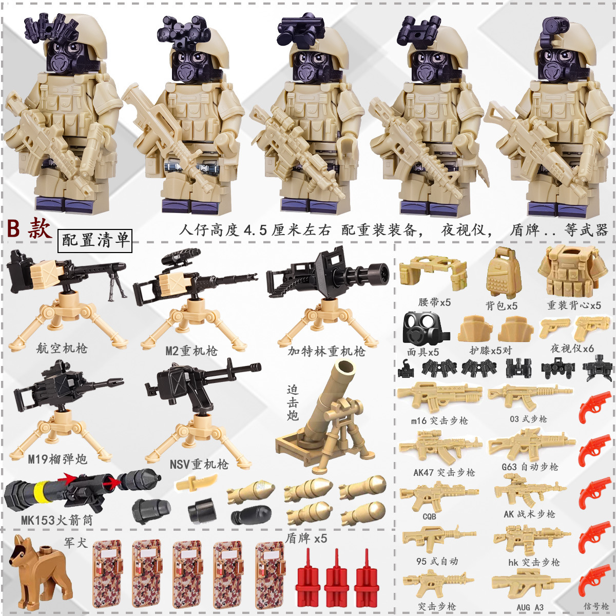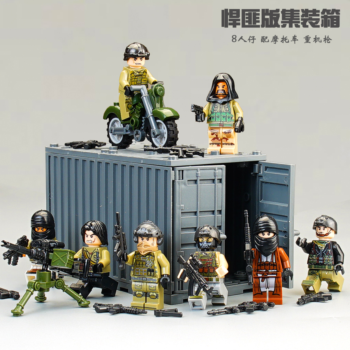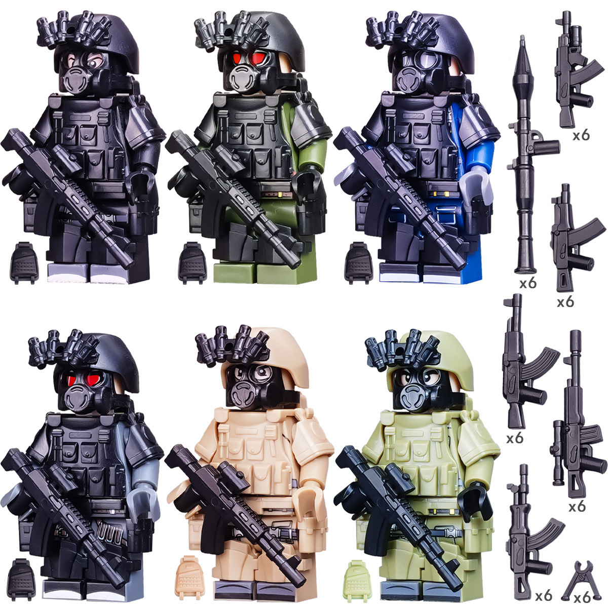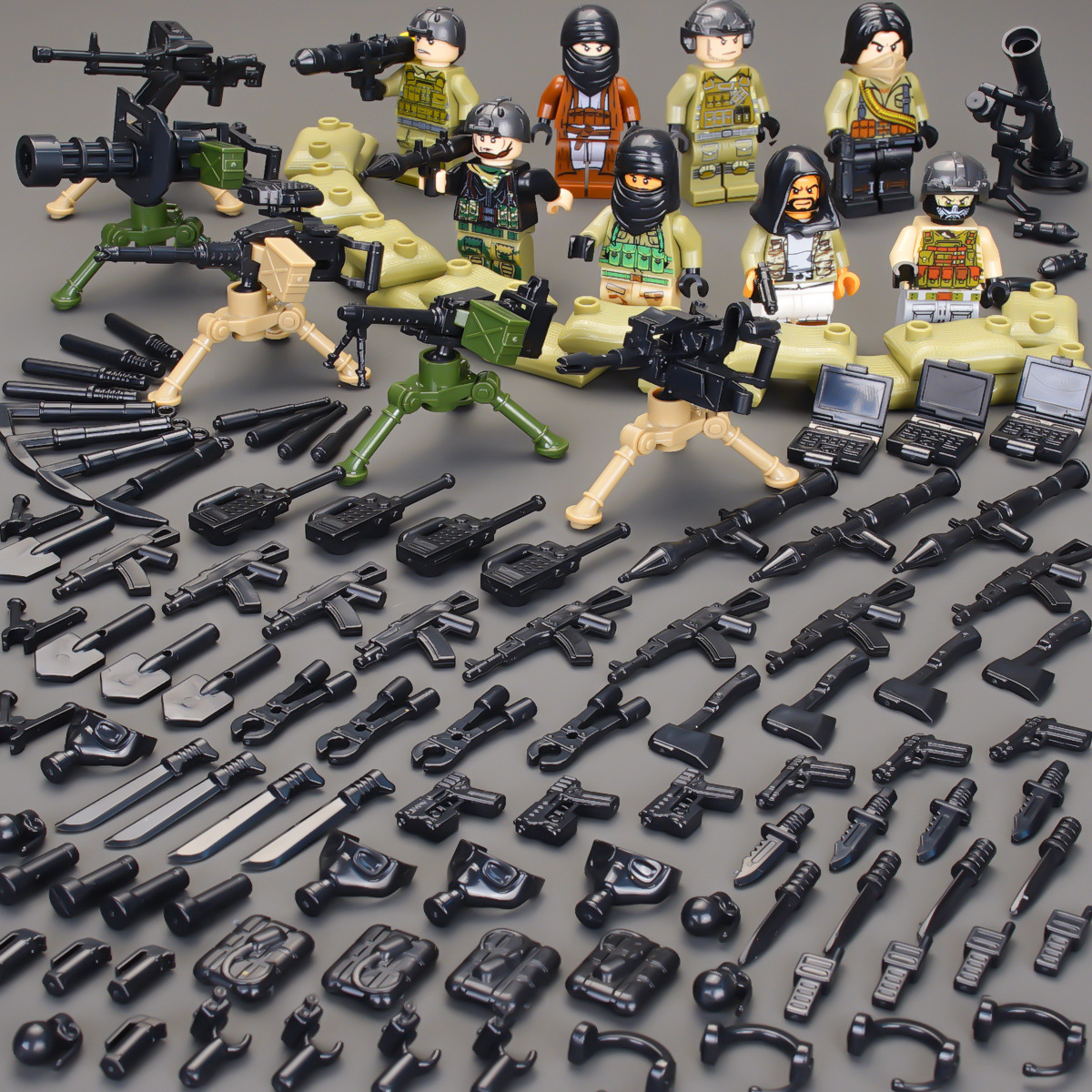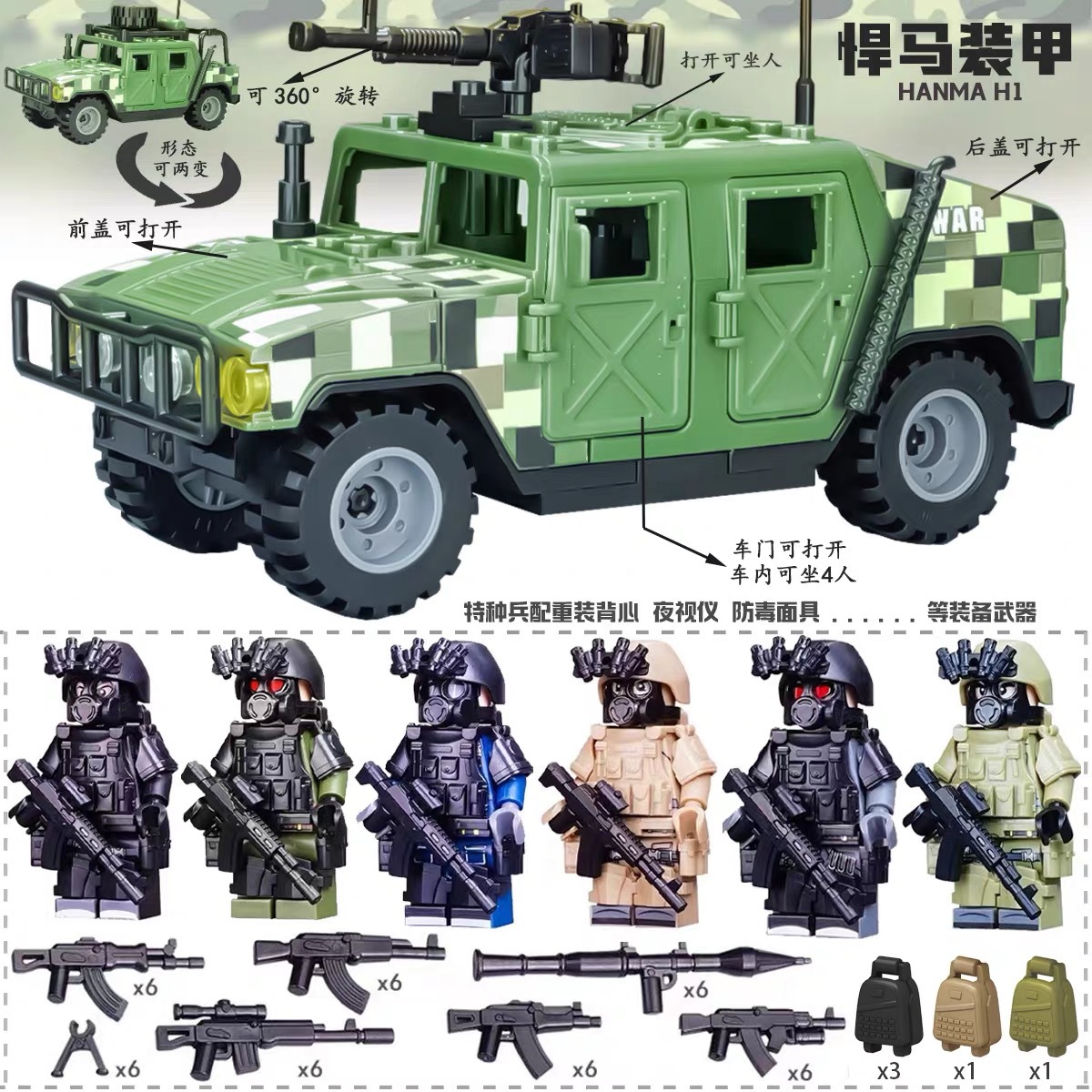 (3 вида полиции + спецназа) 20 человек + 2 заключенника + оружие на опорной пластине; Морские, сушевые и воздушные минифигурки 21 + оружие на опорной плите; Полицейская машина SWAT с 7 минифигурками; Команда патрулирования вертолета с 5 минифигурками; Синий полицейский квадратный массив 20 минифигурок + 2 заключенных + оружие на опорной пластине; Черный полицейский квадратный массив 20 минифигурок + 2 заключенных + оружие на опорной пластине; 20 минифигурок офисов дорожной полиции + 2 заключенных + оружие с базовой пластиной; Морские, сушевые и воздушные минифигурки 21 с опорной пластиной + микродвижки Тяньаньмен; Traffic + Black Police Motorcycle (как показано на рисунке); Морское, наземное и воздушное +3 полиция (6 минифигурок); Предупреждающий пост свисток с тремя полицейскими отделениями; Бронированная команда Scout с 6 минифигурками; Скоростная помощь боевого поля (на фото); Контейнер Bandit версии с 8 минифигурками; Soad надходит 8-фигурное противовесное оружие.; Шесть тяжелых спецназов с пачками оборудования; Специальные солдатские минифигурки типа А5 с сумкой для снаряжения; Специальные солдатские минифигурки типа B 5 с сумкой для снаряжения; Специальные солдатские минифигурки в стиле C 5, с сумкой для снаряжения; (Волк + Гепард + Снежный Леопард + Призрак Пустыни + Черный Призрак) 30 человек с оружием + Ведро; (SWAT SWAT + дикая прическа) 12 человек + 5 тяжелых инвентаря + ведро; (Снежный леопард + Призрак пустыни + Черный Призрак) 18 человек с оружием + ведро для хранения; (Волк + Гепард + Черный Призрак) 18 человек сооружением + ведро для хранения вещей; 142 штуки оружия и снаряжения + ведро для хранения; SWAT SWAT 6 человек сооружением; Специальные силы в дикой природе 6 человек с оружием; K шесть видов тяжелых спецназа сооружением; Desert Ghost Squad 6 человек + рулевой станок с землистыми кронштейнами; Black Ghost Squad 6 человек + черный кронштейн-пистолет; Специальная команда Snow Leopard 6 человек + черный кронштейн-пистолет; Специальная команда Wolf 6 человек + Машинный пистолет с кронштейнами земного цвета; Специальная команда Cheetah 6 + военный зеленый кронштейн-пистолет; 24-битное переустановленное спецназа ABC + морское, сушевое и воздушное оружие + ведро для хранения; 24-битное переустановленное спецназа DEF + морское, сушевое и воздушное оружие + ведро для хранения; City Police Team 51 человек + полицейский автомобильный самолет + ведро для хранения вещей; Коллекция городской полиции 30 минифигурок + джип + ведро для хранения; Городская полицейская история 14 минифигурок + полицейская машина + ведро для хранения; Камуфляжная спецназа 12 минифигурок + джип + ведро для хранения; Минифигурки Dragon Tiger Police 12 + джип + ведро для хранения; Black Hummer Armor с 6 минифигурками; Военная зеленая броня Hummer с 6 минифигурками; Броня пустыни Color Hummer с 6 минифигурками; Подставка для флага (на фото) поставляется с тремя минифигурками.