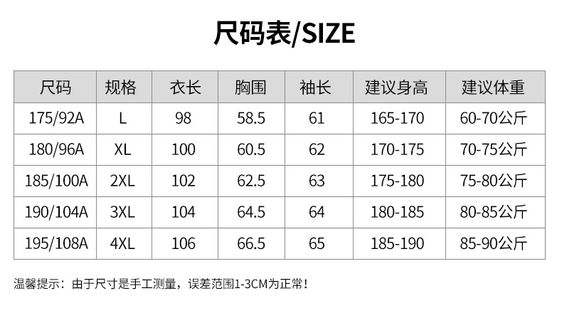 L/175; XL/180; 2XL/185; 3XL/190; 4XL/195