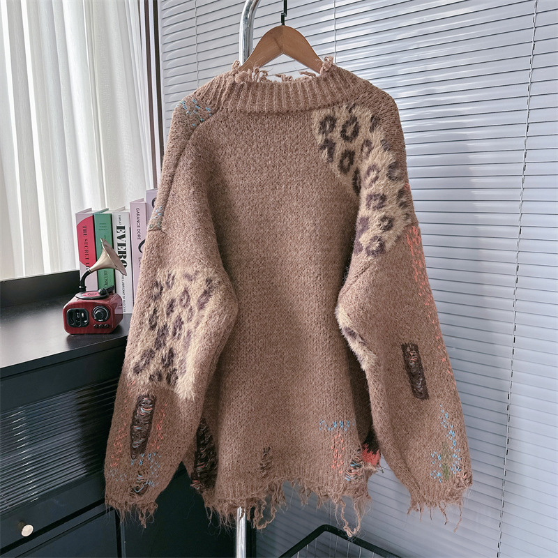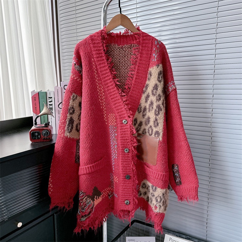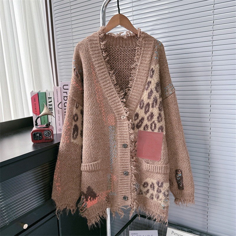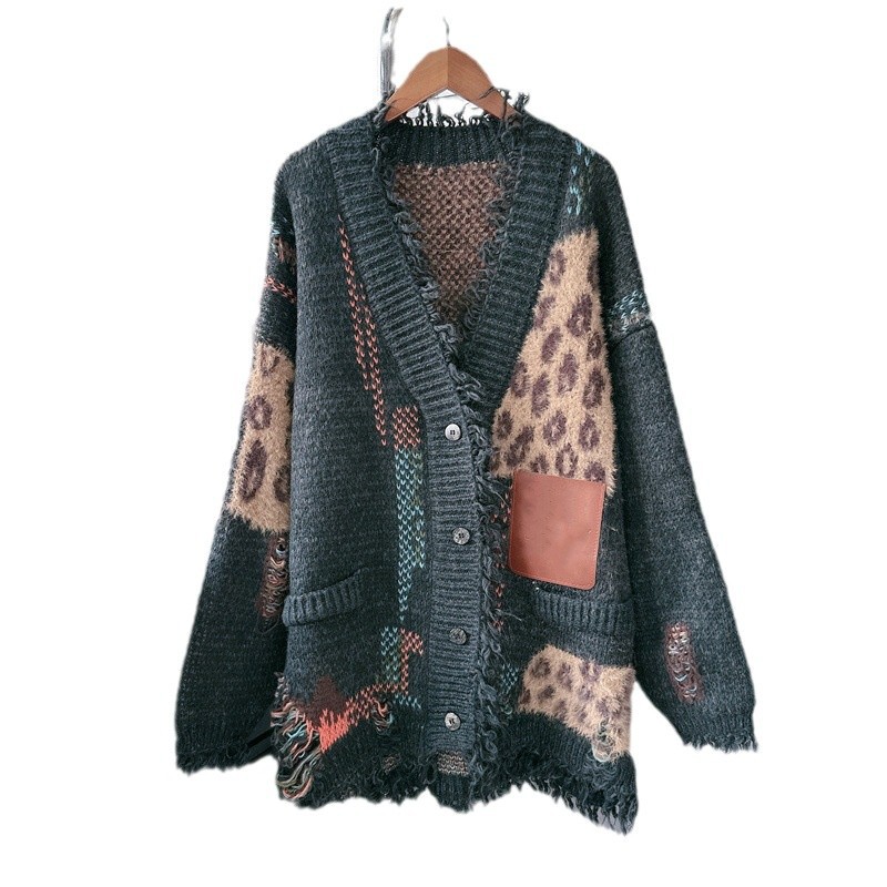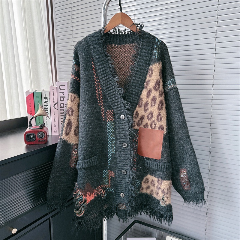 Женский свитер в европейском стиле для осени и зимы, новый дизайн с цветными блоками и леопардовым принтом, свободный и повседневный вязаный кардиган оверсайз.