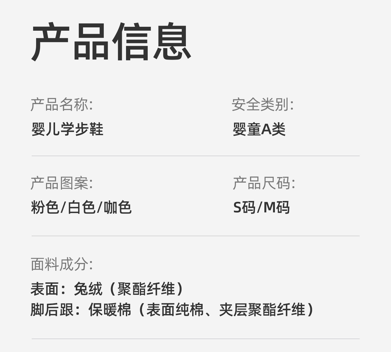 Внутренняя длина размера S 10cm (рекомендуется 0-6 месяцев); Размер М, внутренняя длина 11.5cm (рекомендуется для 6-12 месяцев)