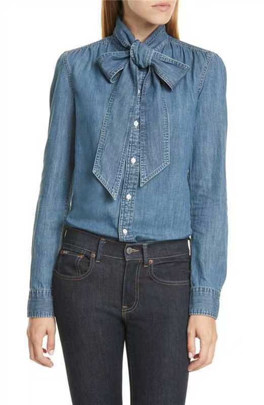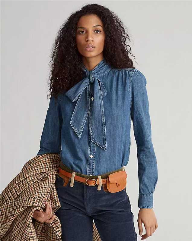 2024 Европа и США галстук с длинными рукавами повседневная джинсовая рубашка топы с отворотом