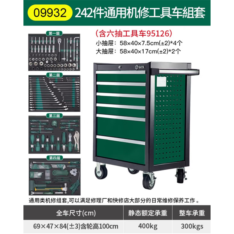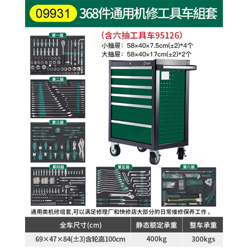 9930 249 предметов универсальный набор инструментов из листового металла + тележки для инструментов с 6 ящиками; 09930-R 249 шт. Универсальный набор инструментов из листового металла (красная тележка для инструментов); 09930-G 249 шт. Универсальный набор инструментов из листового металла (серый тележка для инструментов); 9931 368 шт. универсальный набор инструментов для ремонта машин + тележки для инструментов с 6 ящиками; 09931-R 368 шт. универсальный набор инструментов для ремонта машин; 09931-G 368-компонентный универсальный набор инструментов для ремонта машин (серый тележка для инструментов); 9932 242 предмета универсальный набор инструментов для ремонта машин + тележки для инструментов с 6 ящиками; 09932-R 242 шт. универсальный набор инструментов для ремонта машин + 6 тележек для инструментов с выдвижными ящиками (красная тележка для инструментов); 09932-G 242 шт. Универсальный набор инструментов для ремонта машин (серый тележка для инструментов); 9946 188 комплектов для ремонта автозащиты (включая тележку для инструментов с шестью насосами); 09946-R 188-компонентный ремонтный комплект автозащиты (красная тележка для инструментов); 9947 239 шт. Набор для ремонта машин немецкого автомобильного бренда (включая тележку для инструментов с шестью ящиками); 09947-R 239 шт. Набор для ремонта машин немецкой марки автомобиля (красная тележка для инструментов); 9948 Новый набор энергетических автомобильных инструментов из 68 предметов (включая четырех ящика и двухдверную тележку для инструментов)