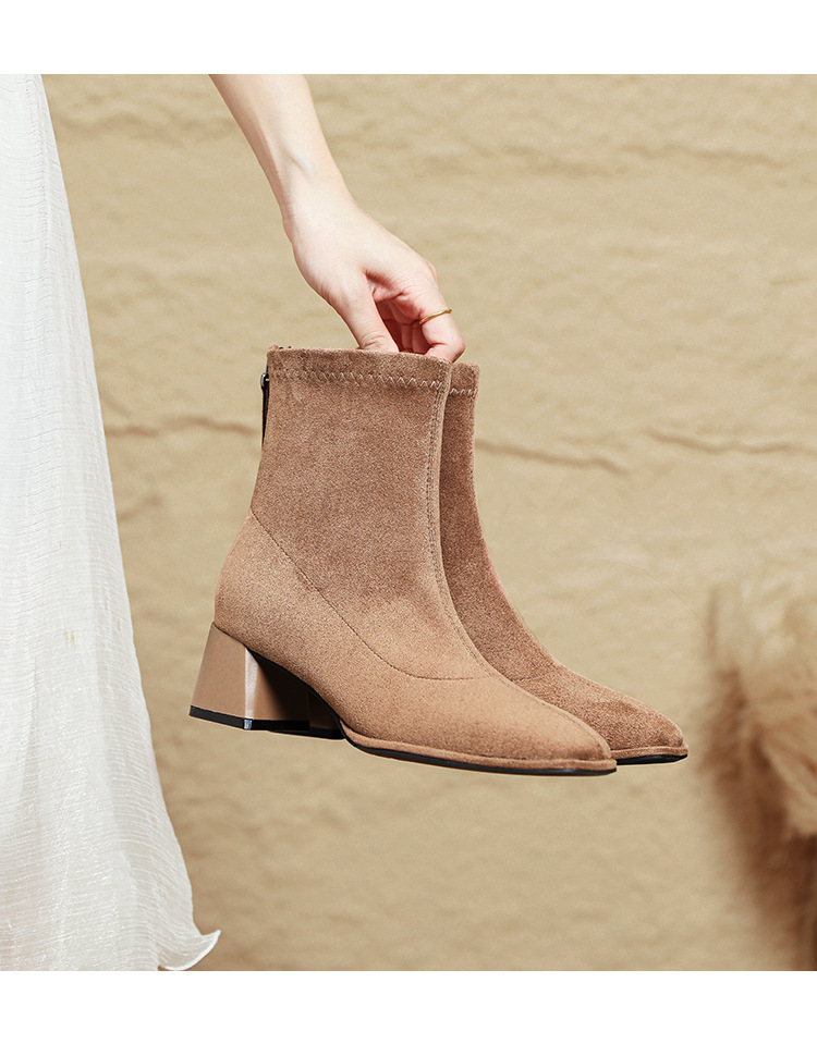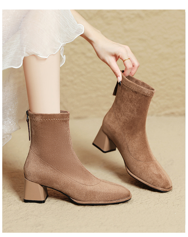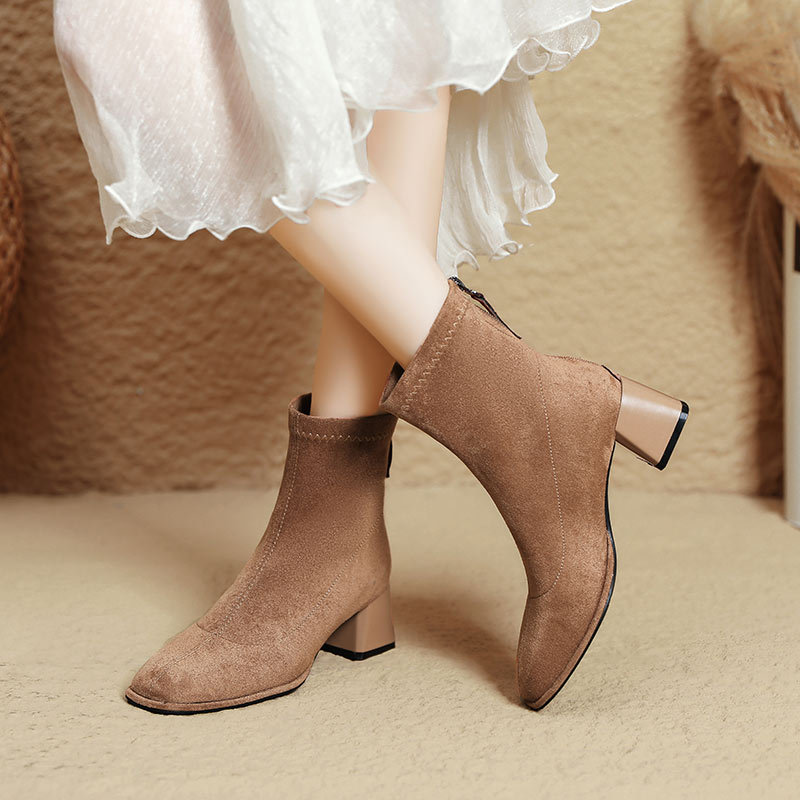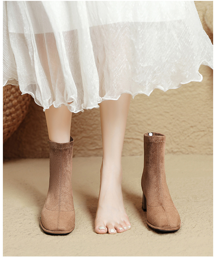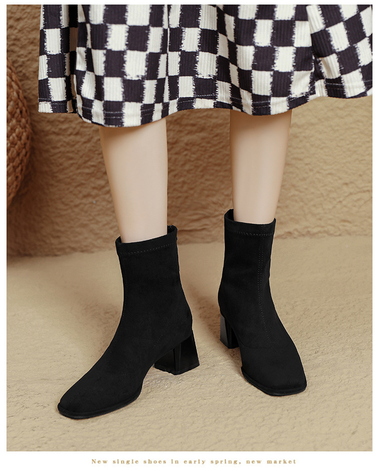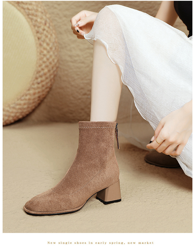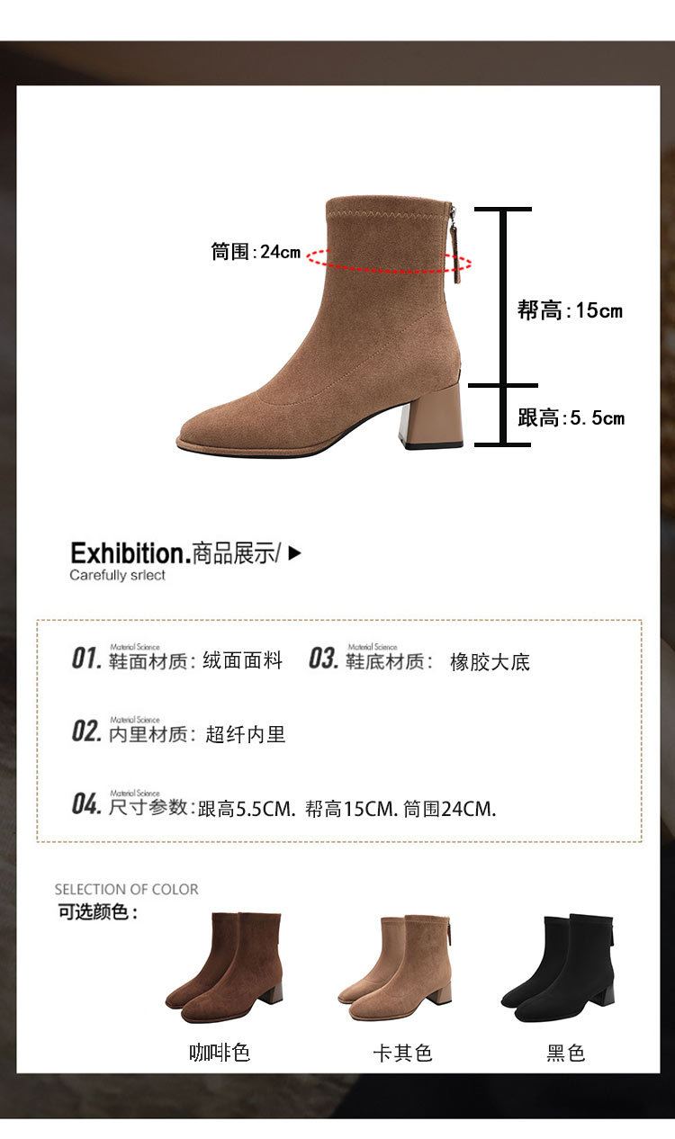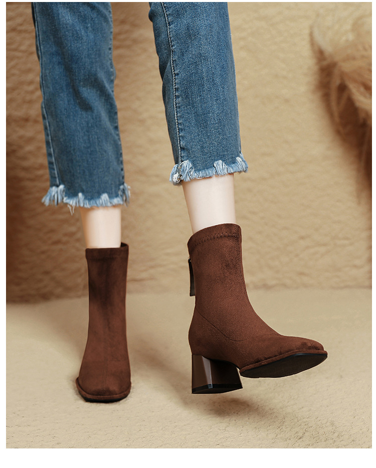 Женские короткие сапоги осень-зима 2025, новые замшевые ботинки до середины икры цвета хаки на высоком каблуке и массивной платформе, модные эластичные обтягивающие сапоги.