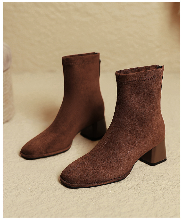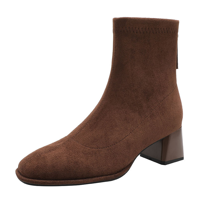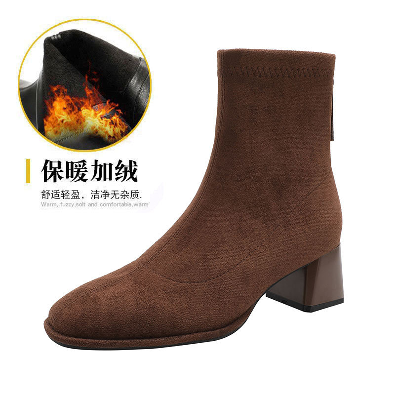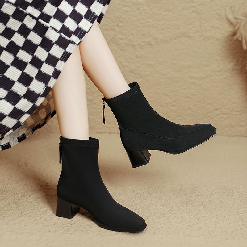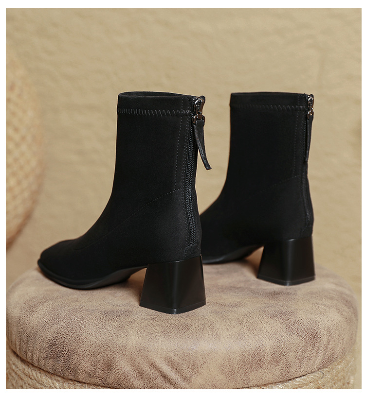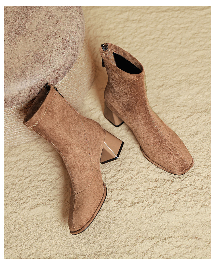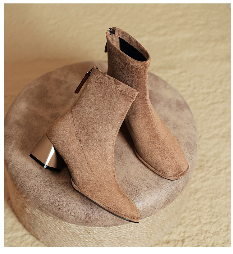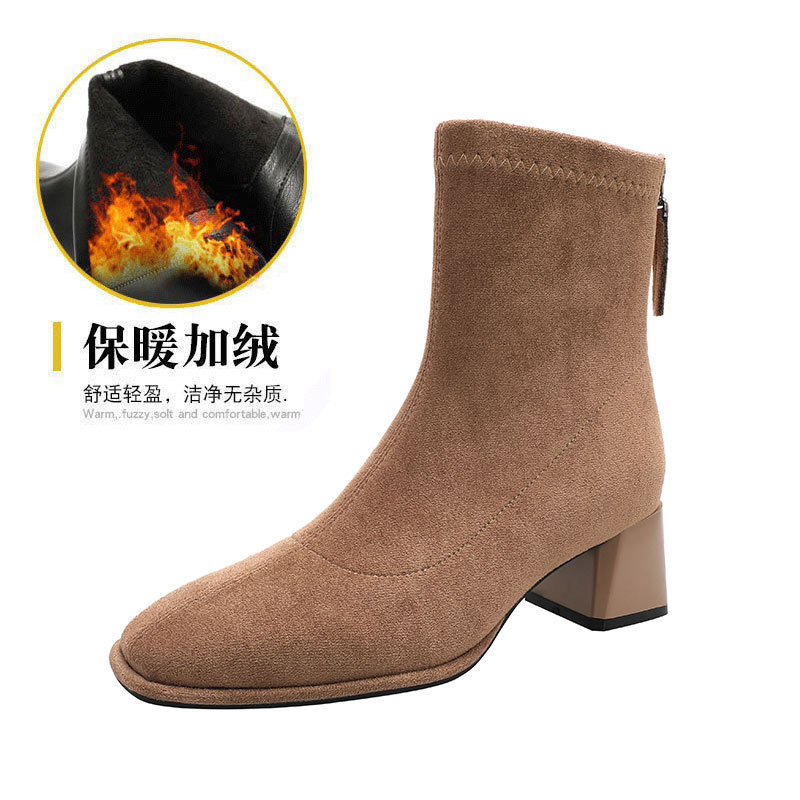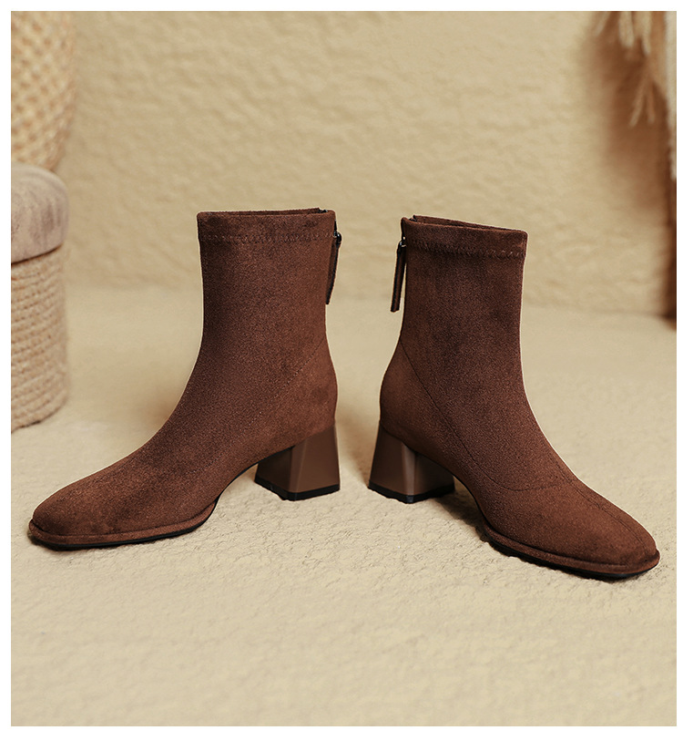 Женские короткие сапоги осень-зима 2025, новые замшевые ботинки до середины икры цвета хаки на высоком каблуке и массивной платформе, модные эластичные обтягивающие сапоги.