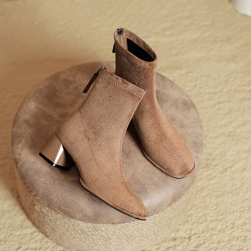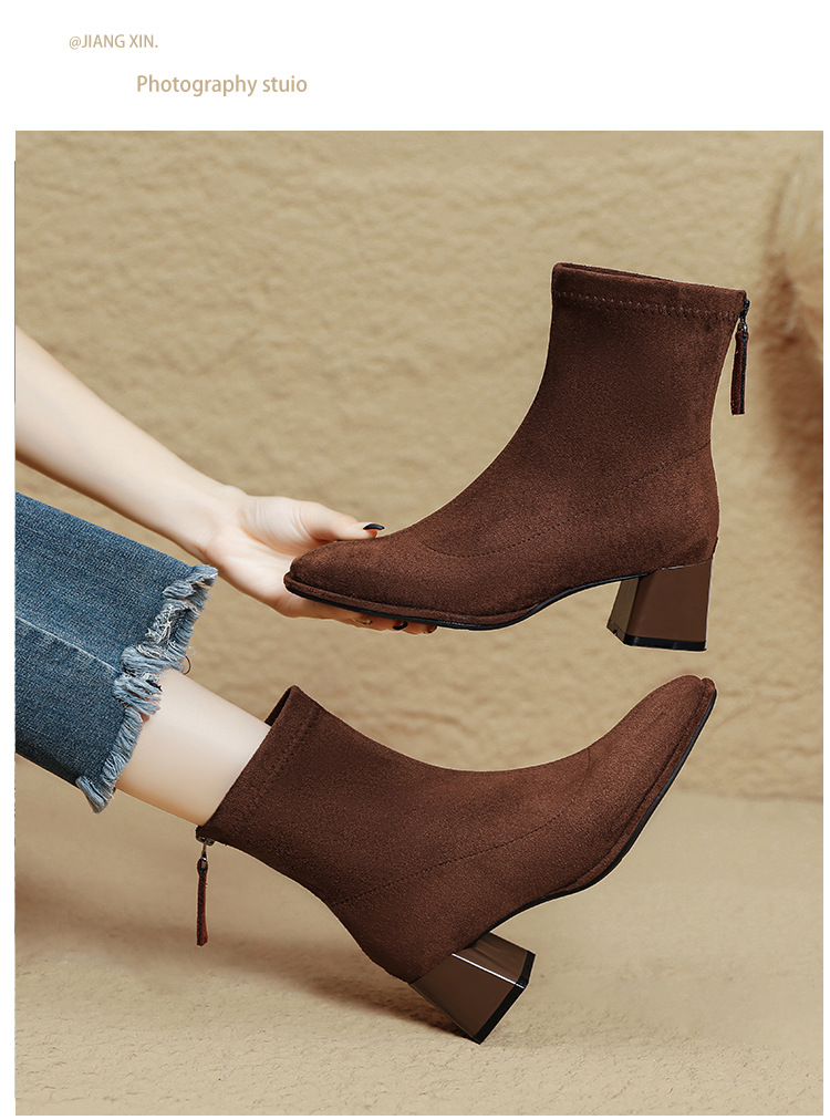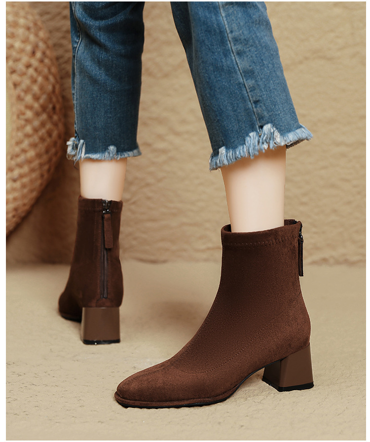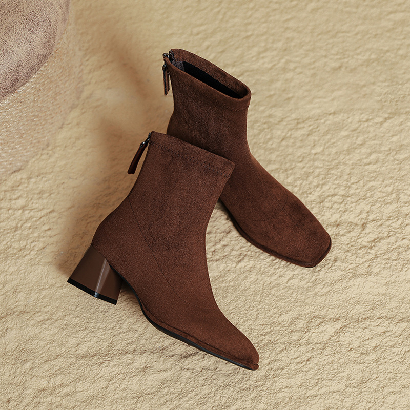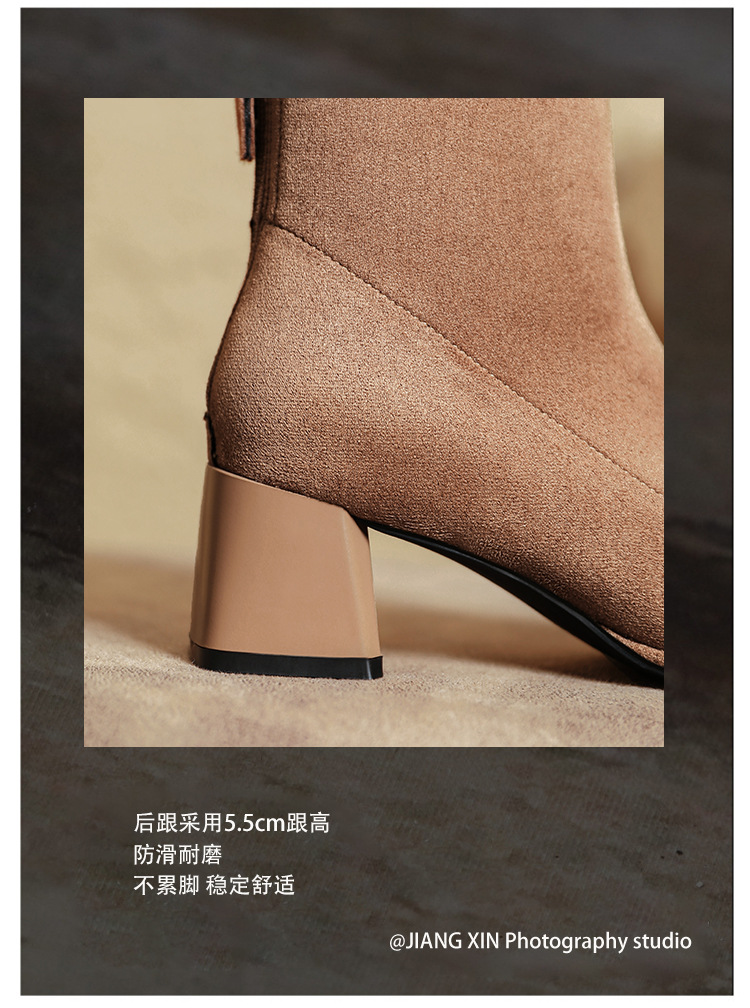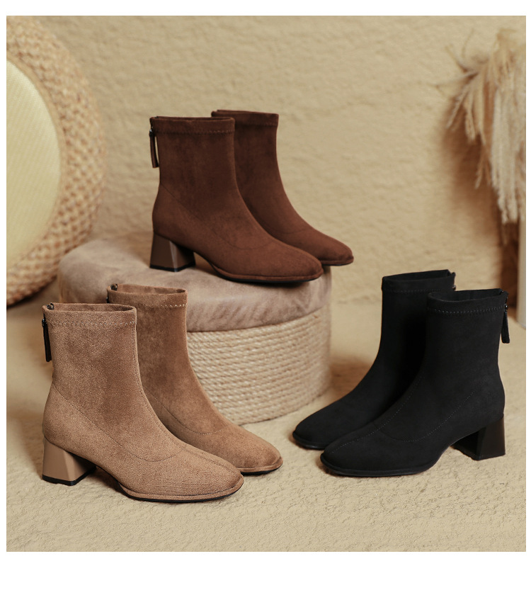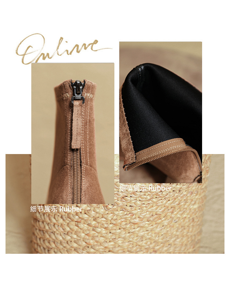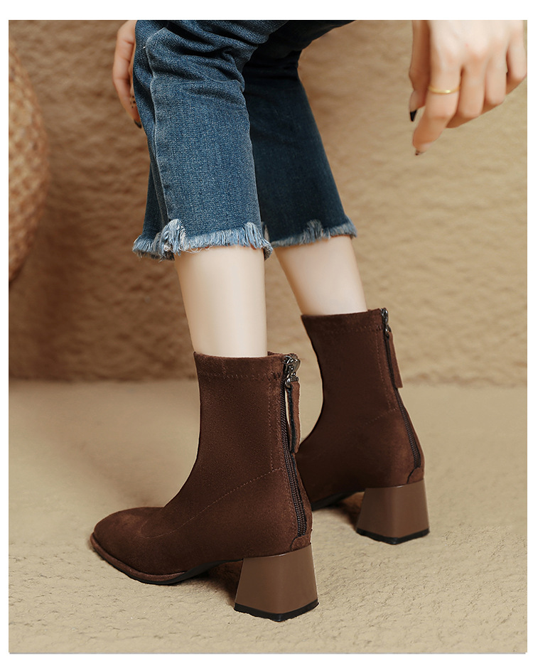 Женские короткие сапоги осень-зима 2025, новые замшевые ботинки до середины икры цвета хаки на высоком каблуке и массивной платформе, модные эластичные обтягивающие сапоги.