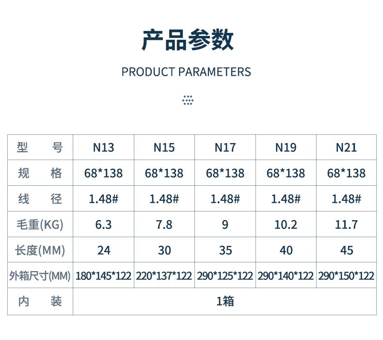 N13 (9384 шт.*одна коробка)/6,3 кг; N15 (9384 шт.*одна коробка)/7,8 кг; N17 (9384 шт.*одна коробка)/9 кг; N19 (9384 шт.*одна коробка) 10,2 кг; N21 (9384 шт.*одна коробка)/11,7 кг