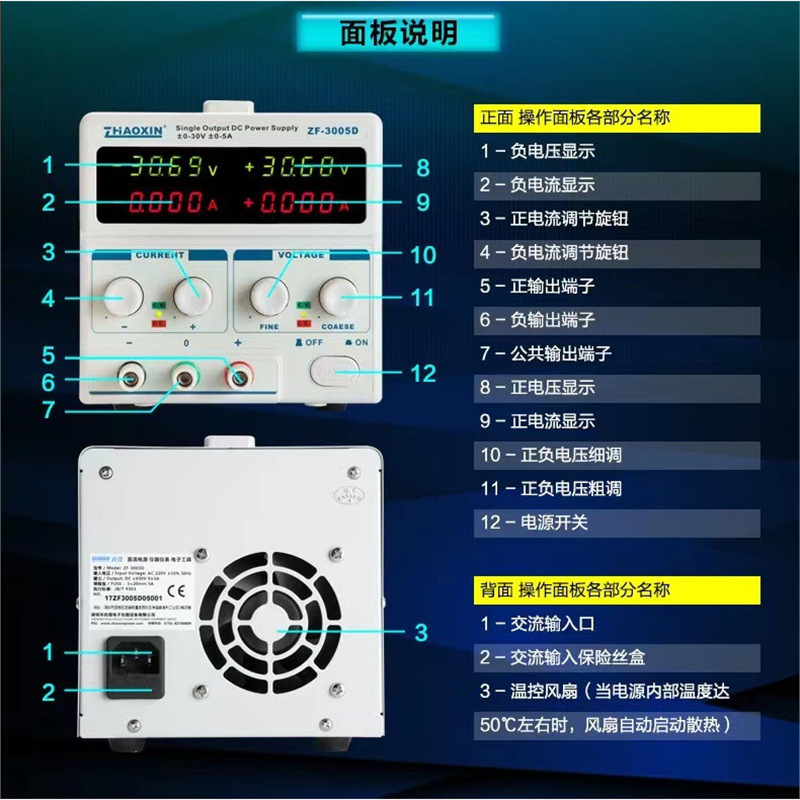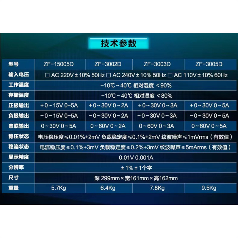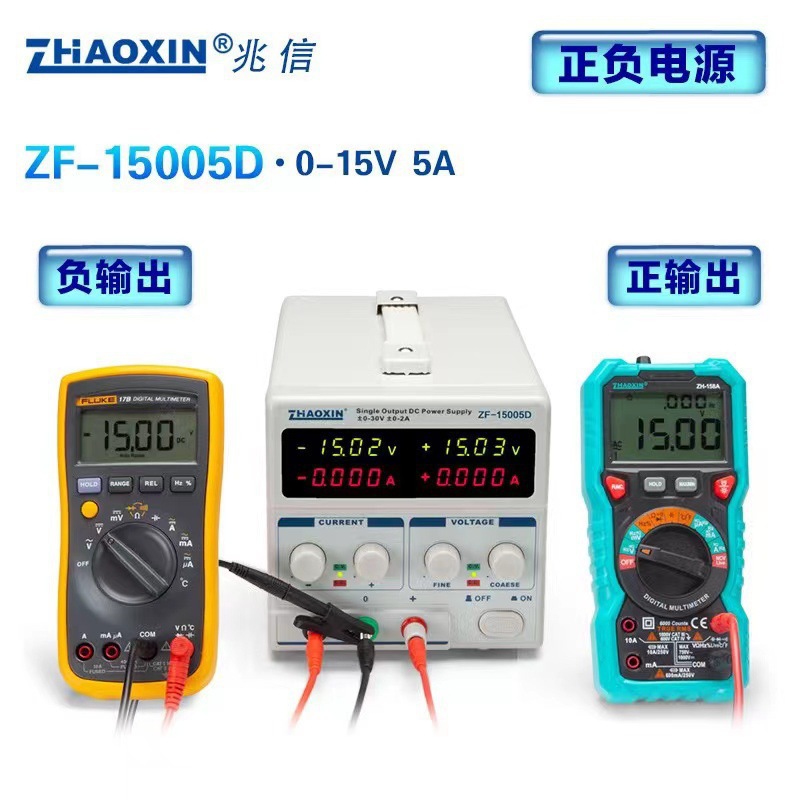 兆信ZF-15005D 0-15V-0-5A 正负输出线性直流稳压可调电源 实脸开发维修 , 正负电源连续可调 串联输出 , 四位 LED 数字 显示