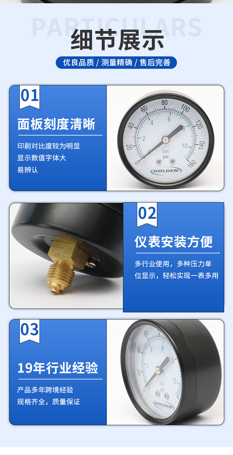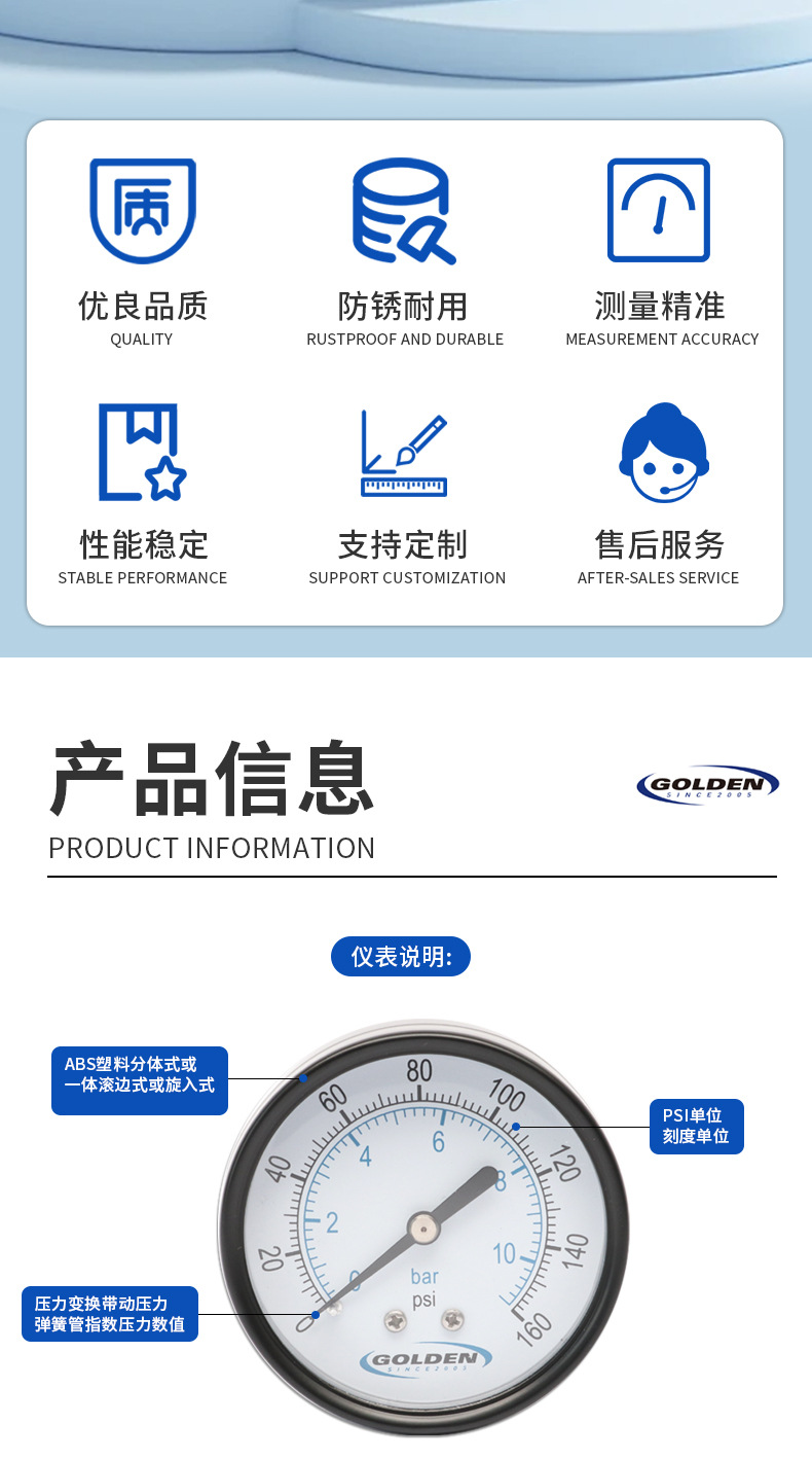 大家好,欢迎来到慈溪金色仪器仪表有限公司,我公司成立于2005年专业设计制造出口型压力表生产型企业。具有全新的管理体系及技术力量,从2006年开始产品远销美洲,欧洲等各国,并与知名品牌长期合作。