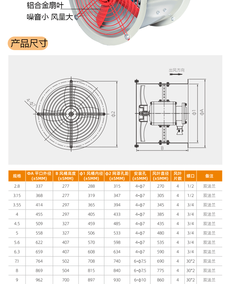 轴流风机型号较多,客户订购前请先与销售人员确认型号名称、机号、电压、功率、流量、转速等具体参数!