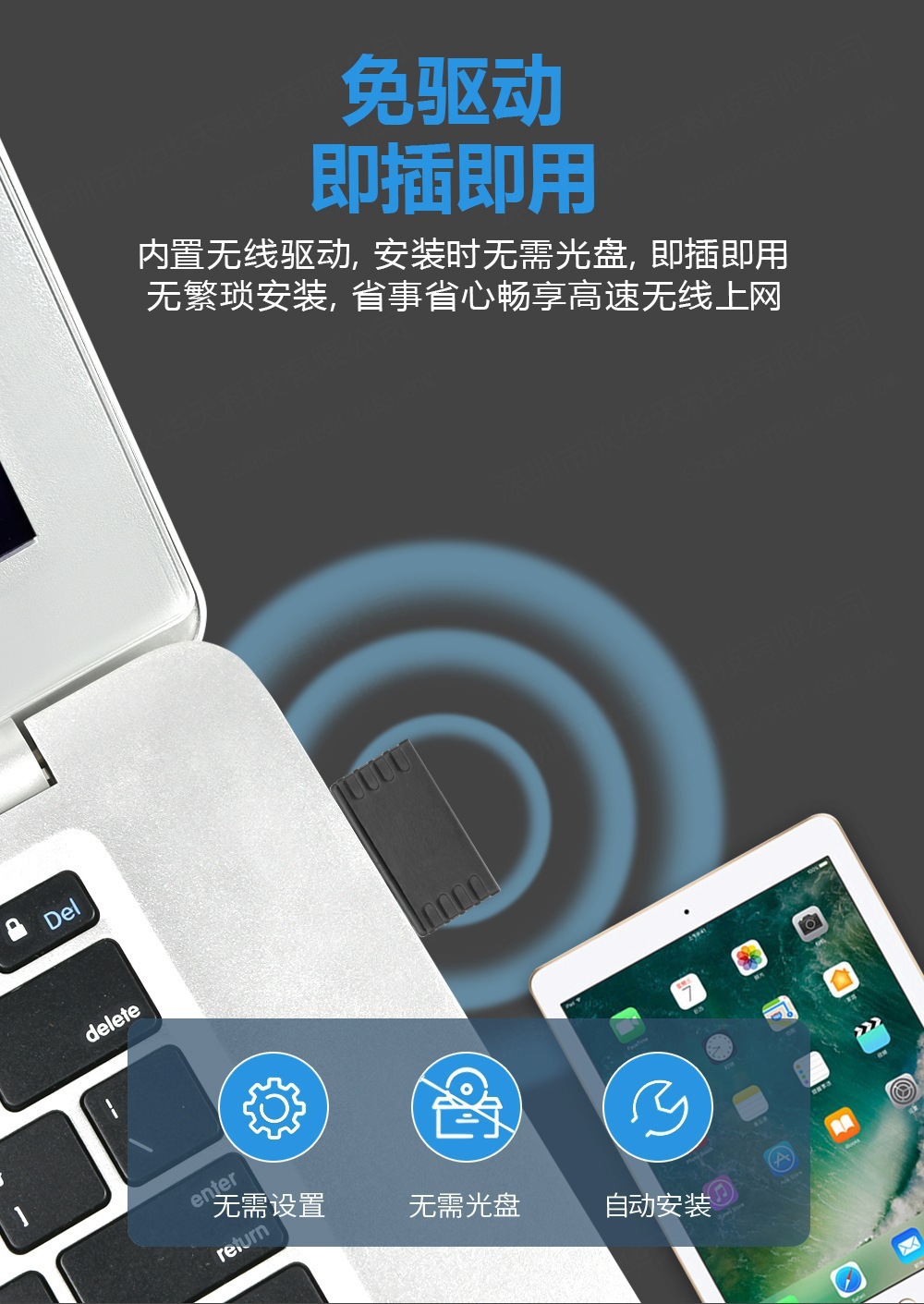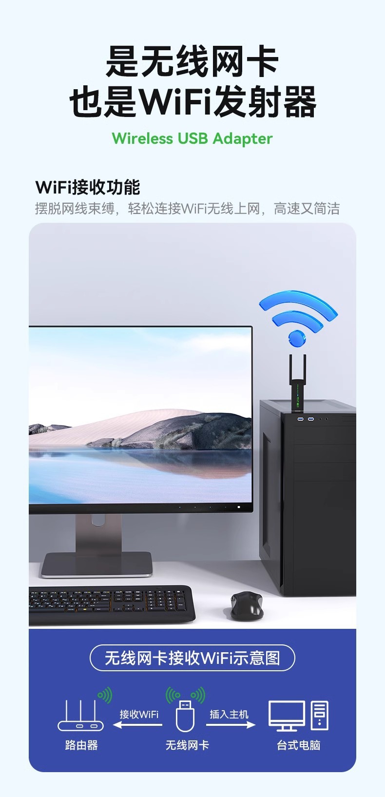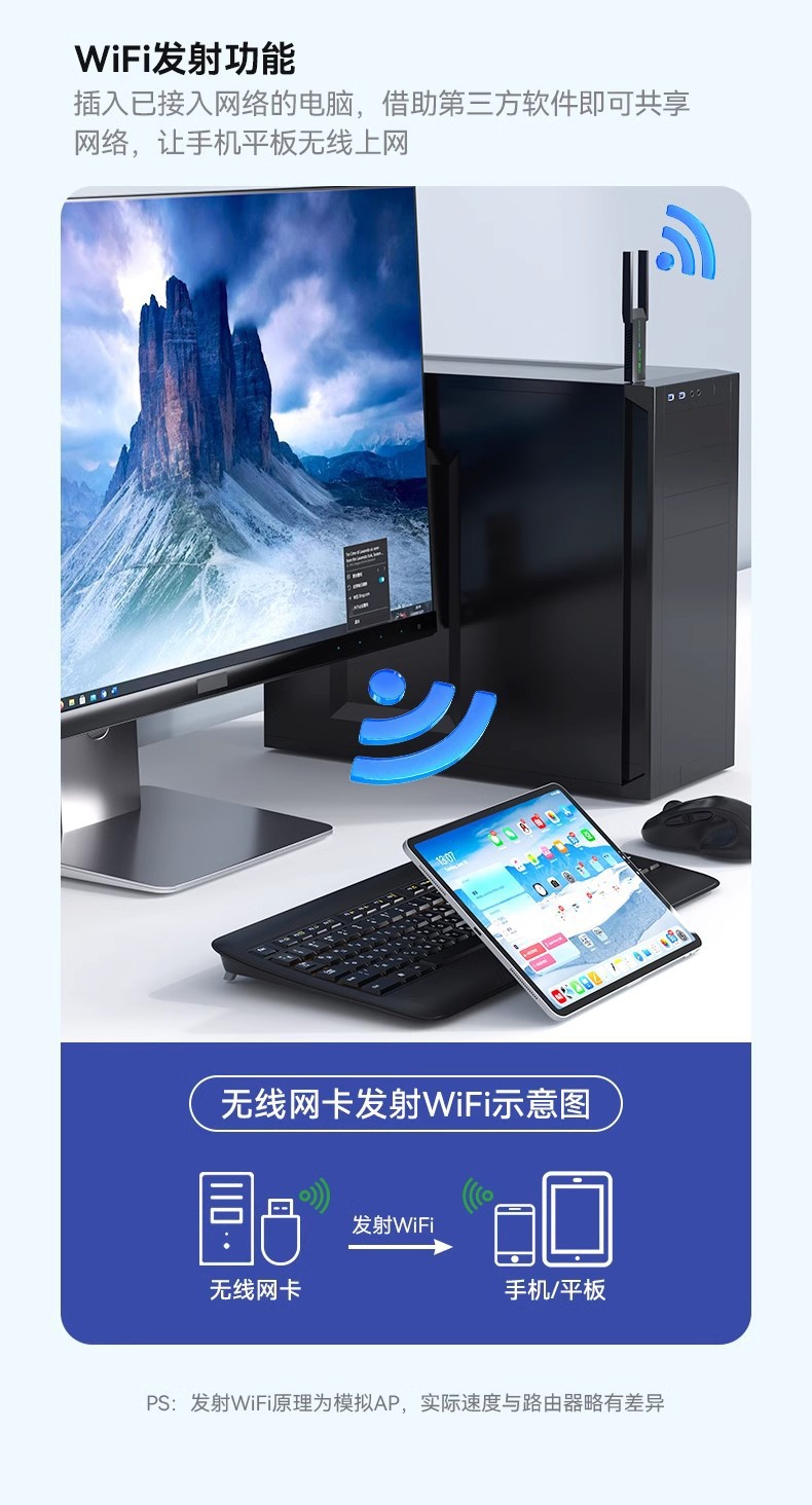11AC双频无线USB网卡适用于笔记本台式PC机等设备进行无线连接,可以提供方便、快捷的无线上网方式。 该网卡支持自动检测功能,能够自动调整速率 。