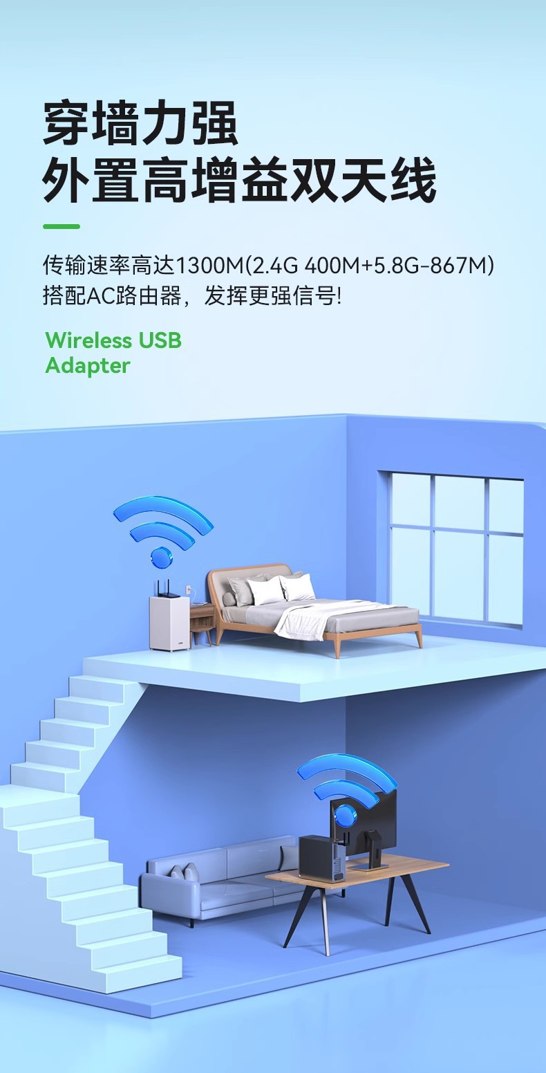 802.11AC 1300Mbps 2.4GHz & 5GHz无线网卡