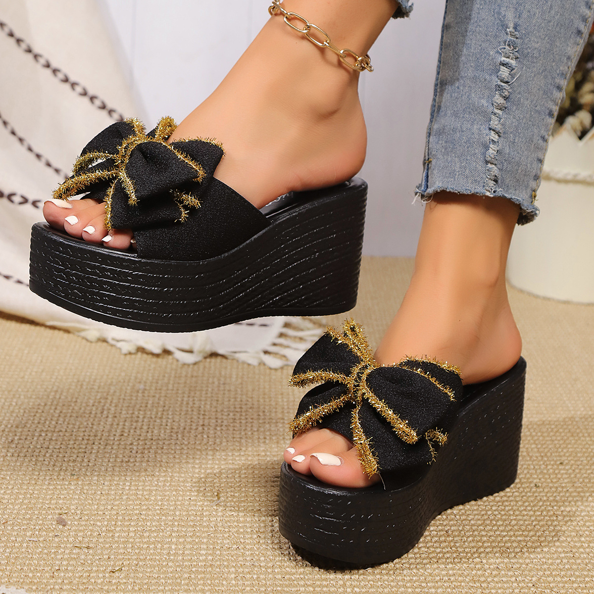 Внешняя торговля Пляжные тапочки с толстой подошвы 2025 Новый сплошной цвет бант модный наклон с круглой головкой большой размер холодные тапочки