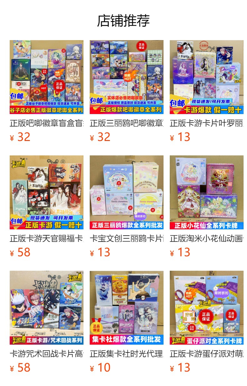 Новая версия карточной игры Conan 1 юань раскрывает пакет☆Розничная цена 1 юань/упаковка☆3 листа/упаковка; Ограниченный выпуск Conan 10 Yuan Insight Pack, часть 4★Всего в коробке 18 упаковок.★Розничная цена 10 юаней/упаковка.; Подлинный значок Конана, значок звезды Вулинга на миллион долларов, упаковка из 15 юаней☆Всего в коробке 6 упаковок.☆Розничная цена 15 юаней/упаковка.; Аутентичный значок к 30-летию детектива Конана☆Всего в коробке 6 штук☆Розничная цена 15 юаней/шт.; Настоящая карточная игра «Конан» за 128 юаней, пакет для оценки фильма☆Всего в коробке 5 упаковок.☆Розничная цена 128 юаней/коробка.; Новая версия радужного пакета за 5 юаней с 3 бомбами.☆Всего в коробке 20 упаковок (розничная цена 5 юаней/упаковка); Новая версия наклеек Xinyue за 5 юаней.☆Всего в коробке 20 упаковок (розничная цена 5 юаней/упаковка); Новая версия бомб Huiyue 6.★Всего в коробке 18 упаковок.☆Розничная цена 10 юаней/упаковка.; Значок пони 1☆Вся коробка содержит 6 упаковок (розничная цена 15 юаней/упаковка).; Новая версия держателя значка дружбы Pony☆Всего в коробке 12 упаковок.☆Розничная цена 15 юаней/упаковка.; Лазерная квитанция My Little Pony☆Всего в коробке 6 упаковок.☆Розничная цена 20 юаней/упаковка.; Новая версия подставки для рисования пони☆Вся коробка содержит 12 упаковок (розничная цена 20 юаней за упаковку).; Цветная акриловая бумага Xiaomi G4☆Всего в коробке 6 упаковок.☆Розничная цена 25 юаней/упаковка.; Подставка для рисования сна Xiaomi за 30 юаней☆Всего в коробке 12 упаковок.☆Розничная цена 30 юаней/упаковка.; 2 книги☆Сяома. Средняя книга-карточка Баоли (10 юаней за книгу в розницу); 5 книг☆Книга карточек Xiaomi Zhong (10 юаней за книгу в розницу); пони☆Книга коллекции Magic Xunyou за 128 юаней☆(Содержит 1 книгу с картами + 4 пакета карт + 1 карточку PR) (розничная цена 128 юаней за книгу); 1 карта☆My Little Pony Twilight Pack 3 пули☆Розничная торговля 50 юаней/карта; 2 карты☆My Little Pony Twilight Pack 3 пули☆Розничная торговля 50 юаней/карта; Новая версия гелевой ручки «пони».☆Fantasy 4th Edition - 12 штук в коробке, без дубликатов.; 5 упаковок☆Маленькая пленка Maca (100 листов/упаковка); 5 кирпичиков из жесткой карты пони☆Розничная цена 5 юаней/шт.; Пеппа Пиг 2-юань Discovery Pack☆Всего в коробке 30 упаковок.☆Розничная цена 2 юаня/упаковка.; Подлинные купюры Hitcard, грабящие гробницы, пакет за 15 юаней☆Всего в коробке 10 упаковок.☆Розничная цена 15 юаней/упаковка.; Настоящая карточная игра Русалка внизу, 10 юаней, пакет из 2 бомб☆Всего в коробке 18 упаковок.☆Розничная цена 10 юаней/упаковка.; Синий тюремный значок, версия Q☆Всего в коробке 10 штук☆Розничная цена 15 юаней/шт.; Подлинный значок серии Volleyball Junior 15 Yuan Starburst☆Всего в коробке 18 штук.☆Розничная цена 15 юаней/шт.; Новая версия пакета Sanrio 2 Yuan с 10 000 картин и милой встречей☆Всего в коробке 30 упаковок.☆Розничная цена 2 юаня/упаковка.; Пакет Sanrio за 5 юаней с тысячами картин и милой встречей☆Всего в коробке 20 упаковок.☆Розничная цена 5 юаней/упаковка.; Пакет карт Sanrio на 5 юаней☆Вся коробка содержит 22 упаковки (розничная цена 5 юаней/упаковка).; Подлинная карточка для сбора билетов Sanrio.☆Всего в коробке 18 упаковок.☆Розничная цена 10 юаней/упаковка.; Пакет Kabao Sanrio Polaroid за 10 юаней☆Всего в коробке 18 упаковок.☆Розничная цена 10 юаней/упаковка.; Симпатичный значок Sanrio за 10 юаней☆Всего в коробке 10 упаковок.☆Розничная цена 10 юаней/упаковка.; 5 упаковок-пленка для карточек Sanrio ☆ 100 листов в упаковке, всего 500 листов. ☆ Рекомендуемая ро