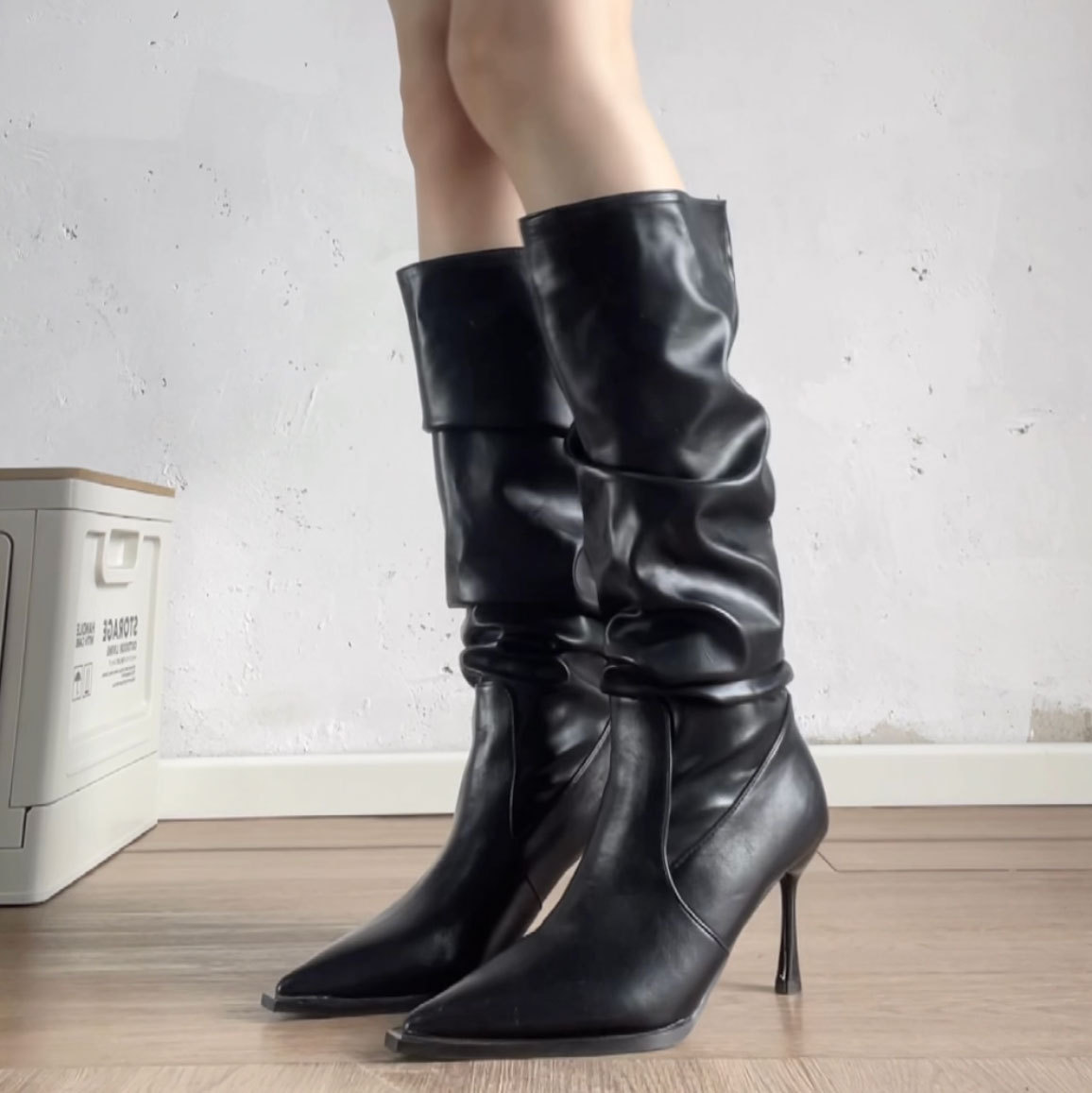 Европейские и американские сапоги с острыми складками, высокие сапоги, женские тощие осенью и зимой 2024