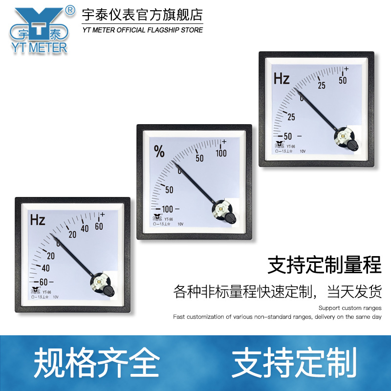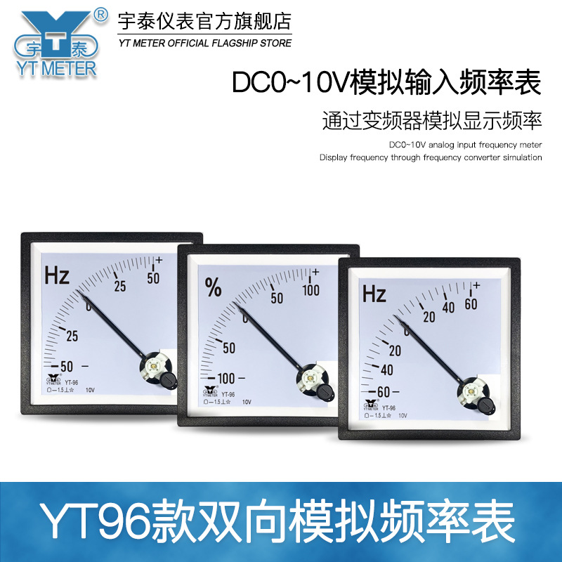 Размер инструмента 96х96мм, размер отверстия 92х92мм.; ±50Hz/10V; ±60Hz/10V; ±100Hz/10V; ±100%/10V; ±150%/10V; ±200%/10V