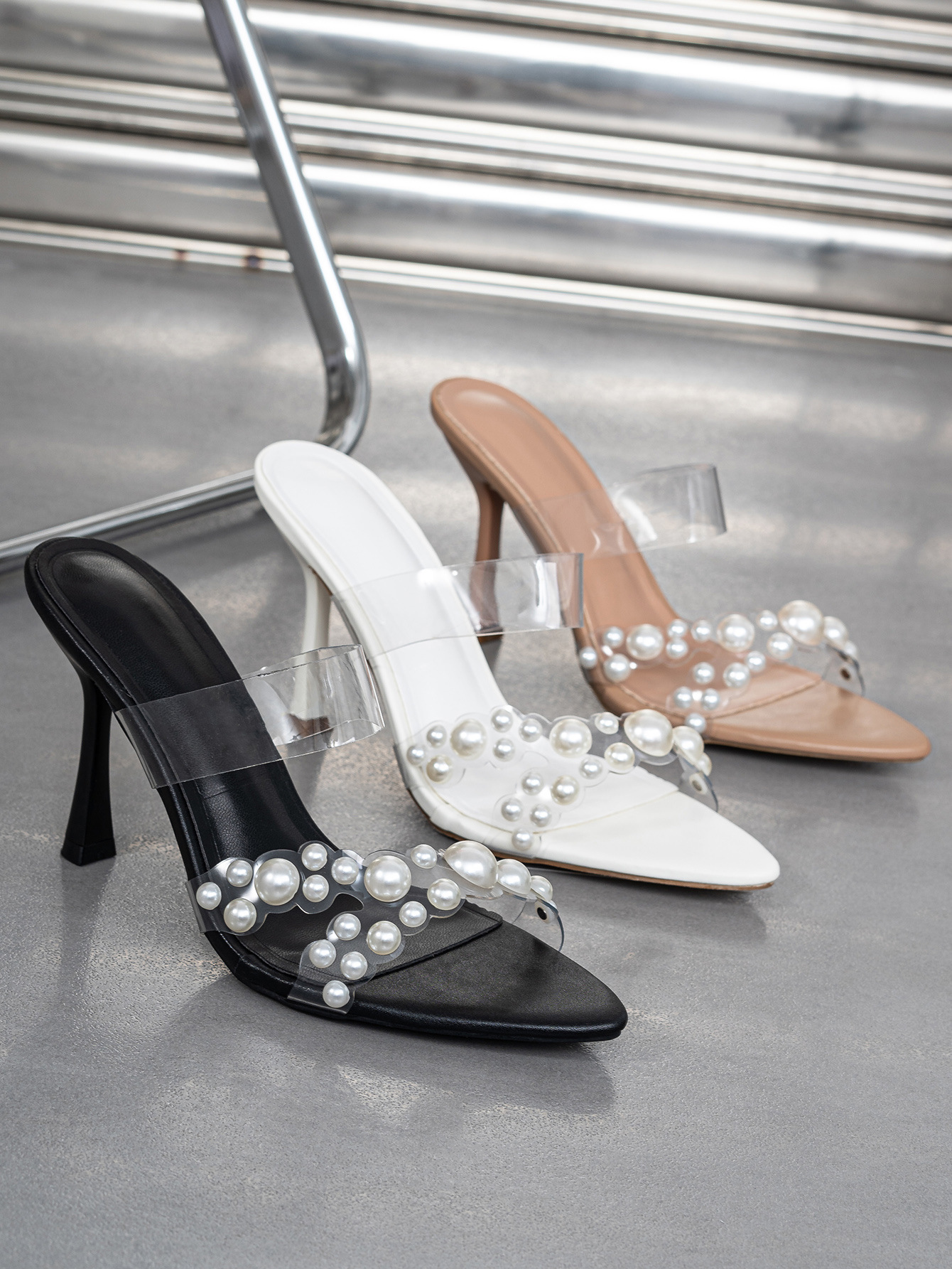 2024 новый французский прозрачный жемчуг слово холодные тапочки на каблуках дикие женские тапочки на каблуках