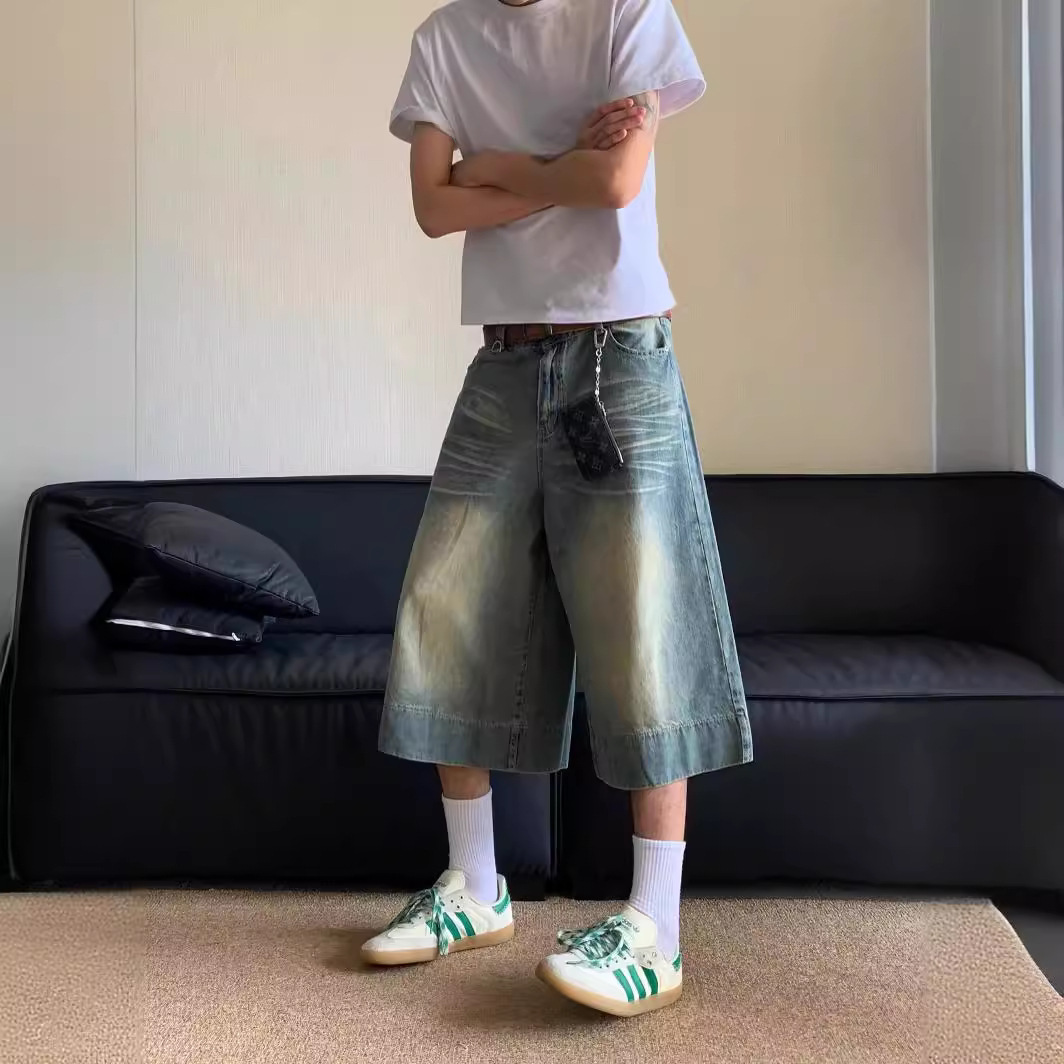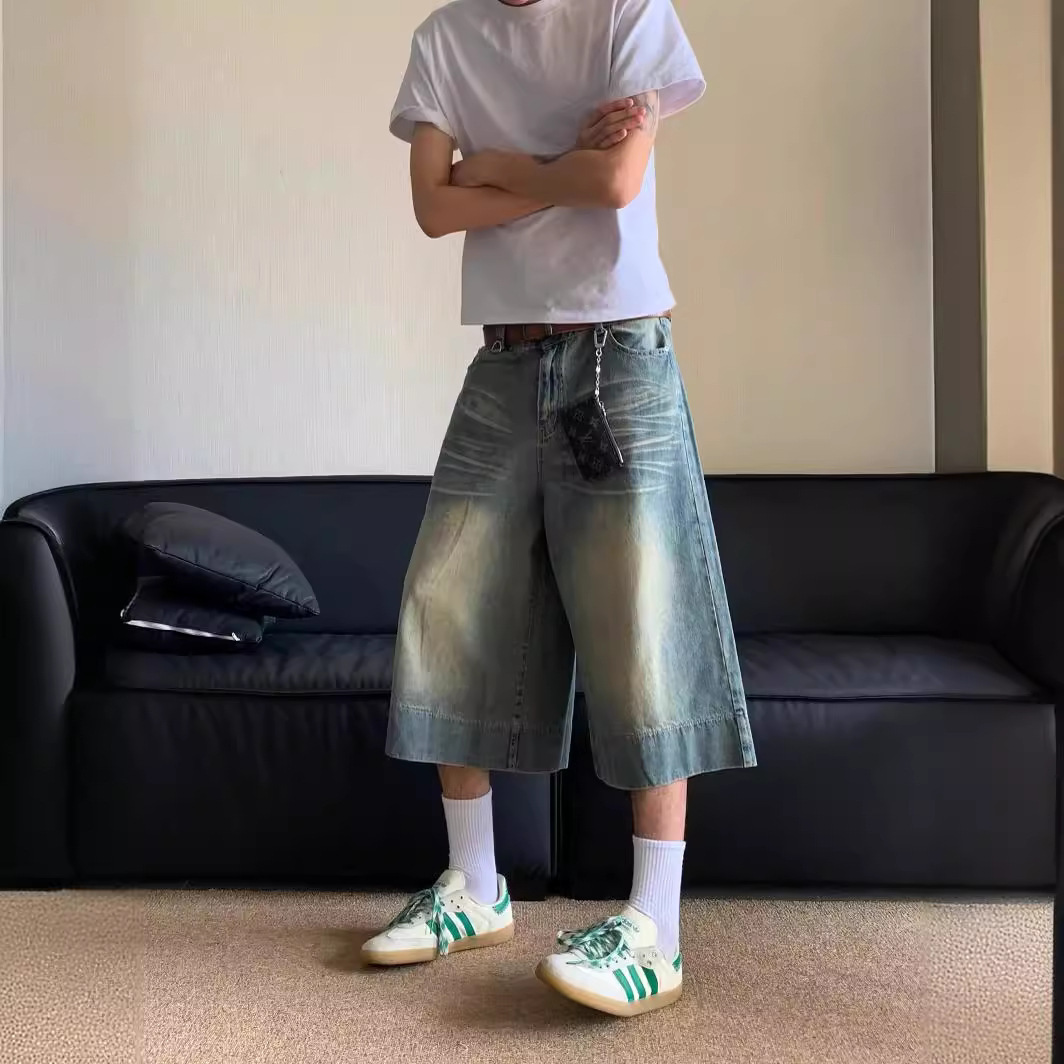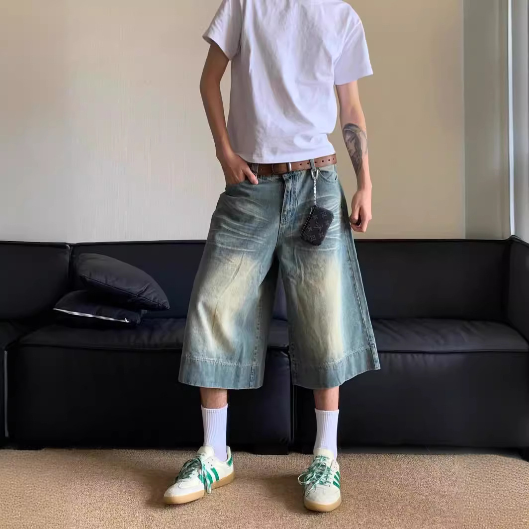 Внешняя торговля 2024 американский ретро широкие ножки 7 очков джинсы летние ретро стирки прямые джинсовые брюки мужские шорты
