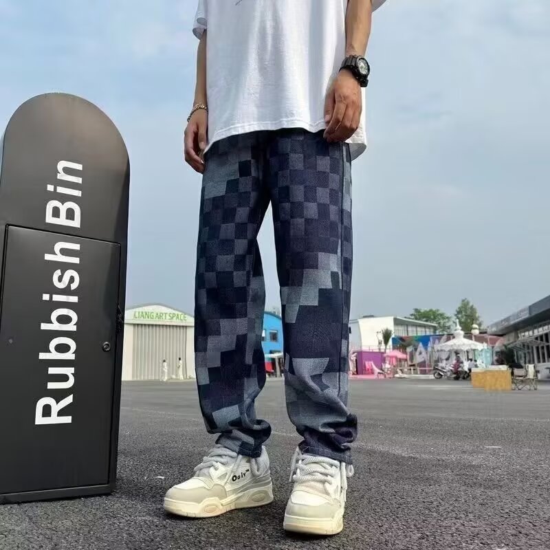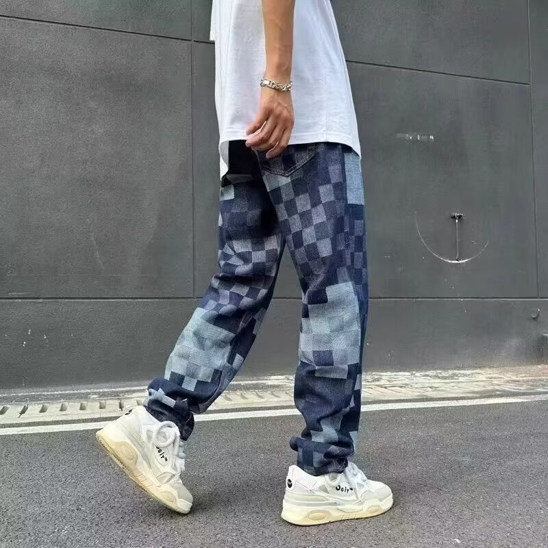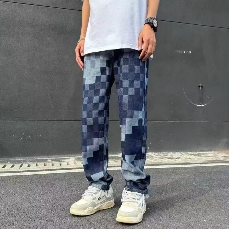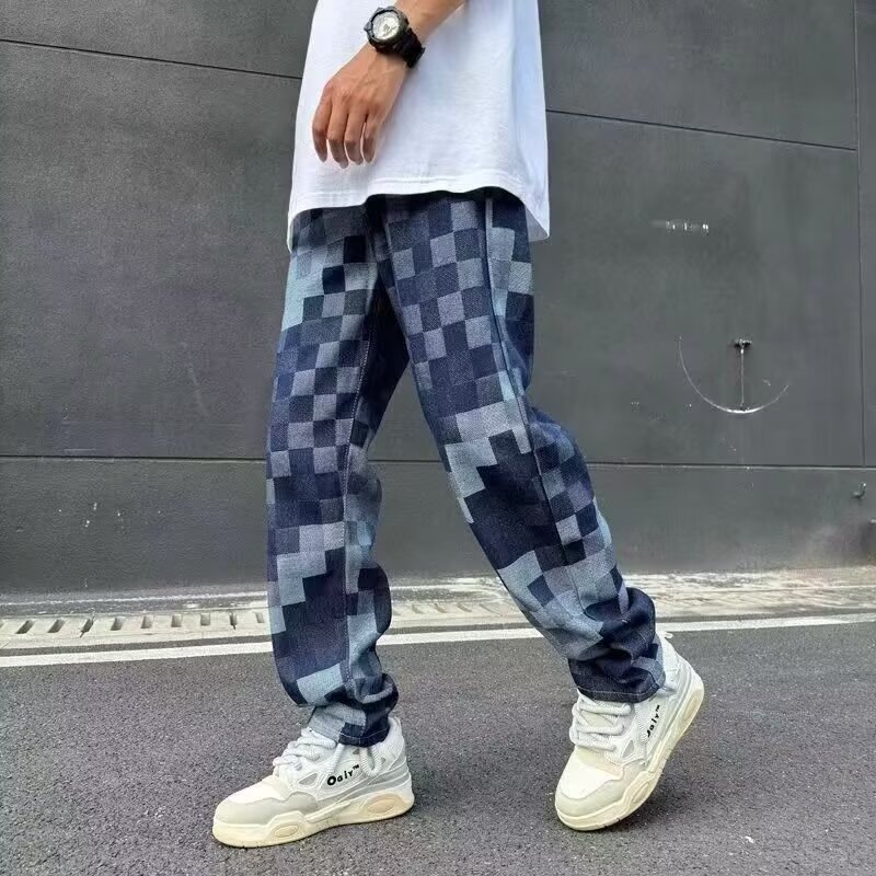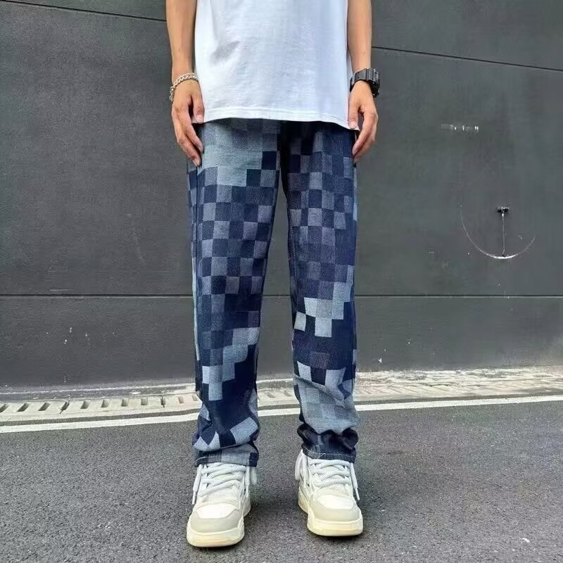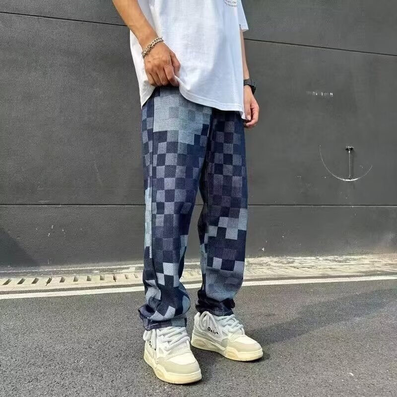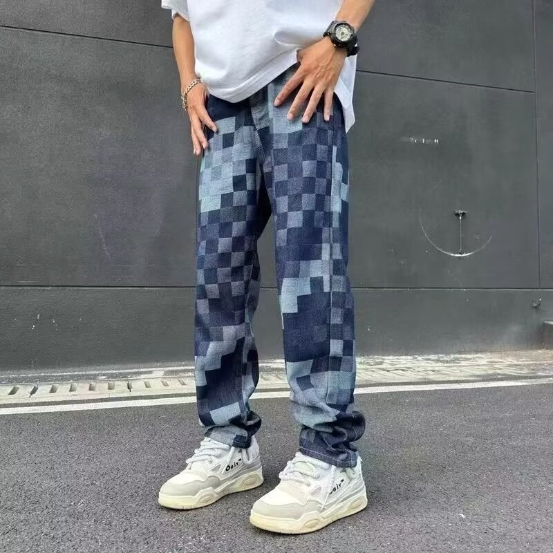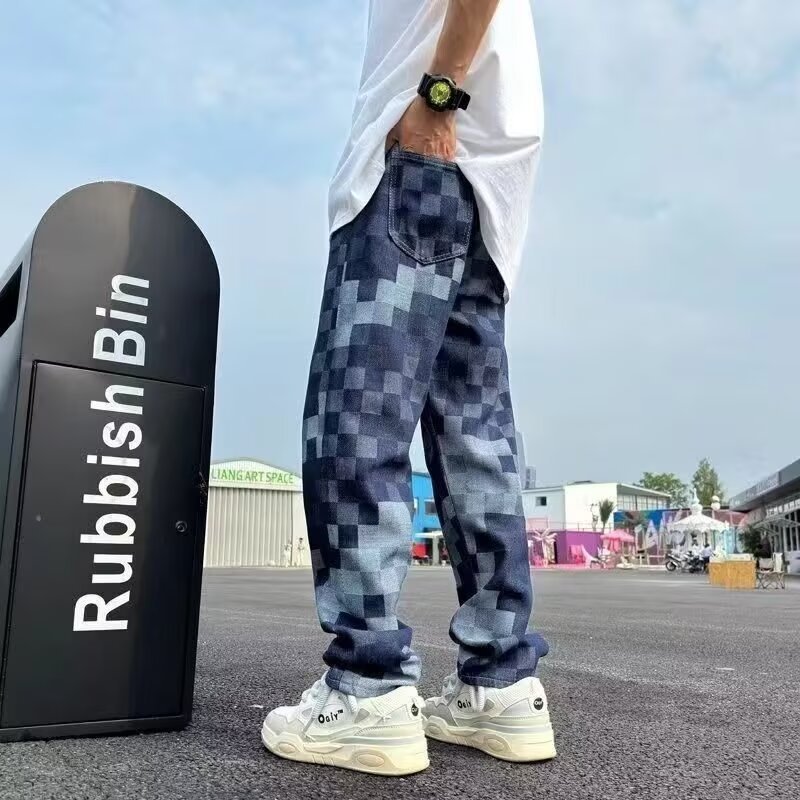 2024 Мозаичные шахматные джинсы мужские приливные бренды красивые уличные штаны американские высокие уличные брюки vibe прямые брюки