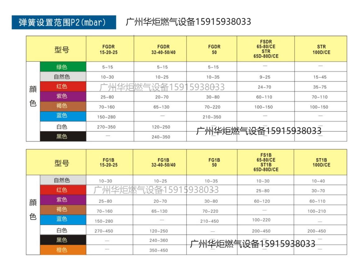 入口压力范围 P1:P2+30 mbar-1 bar;工作压力范围 P2:提供自然色标准弹簧;其他压力范围见弹簧选型表。