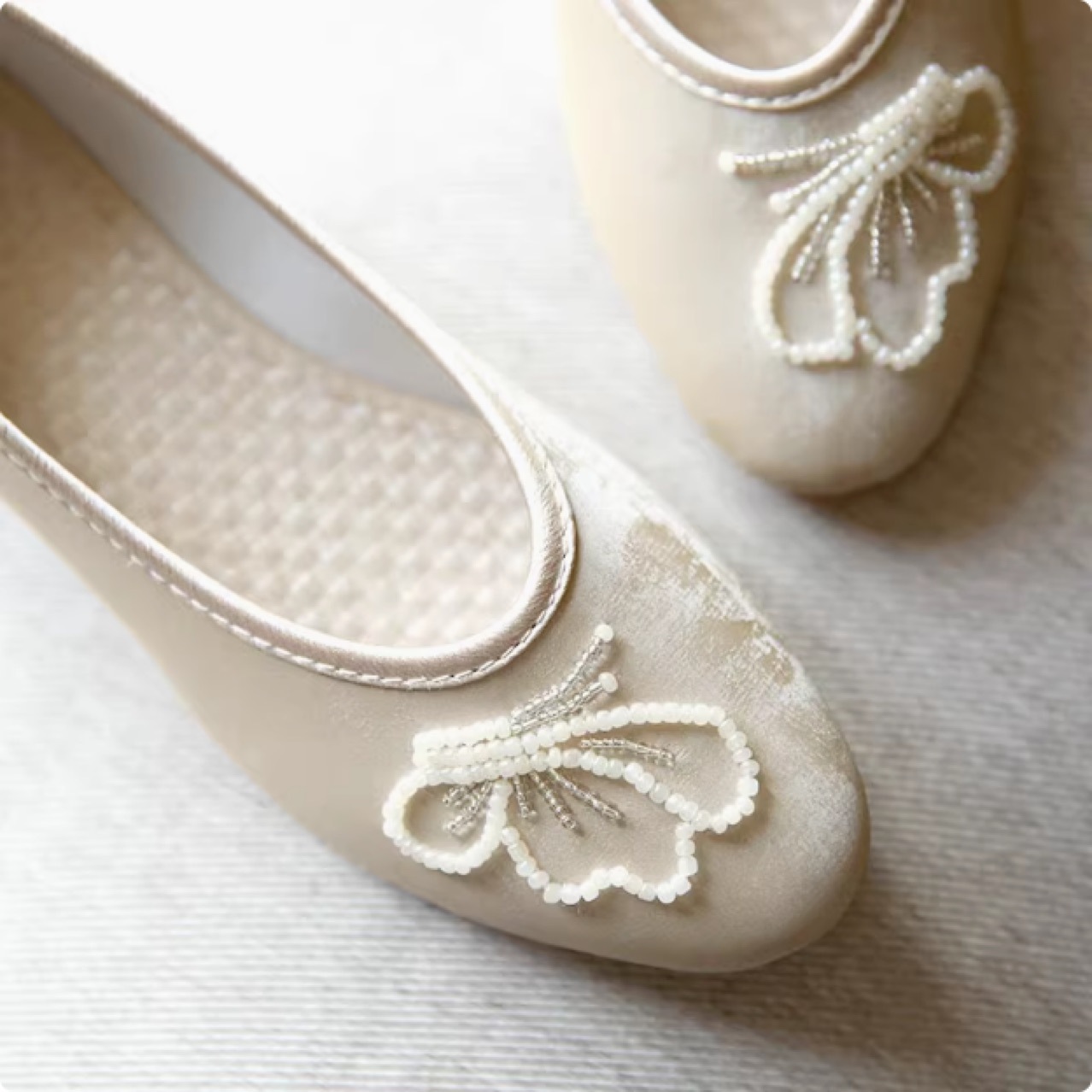 311 Осенние туфли ручной работы с жемчугом и бабочкой, туфли ручной работы на низком каблуке, маленькие туфли в стиле ароматов для поездок на работу, туфли для мам с неглубоким жемчугом