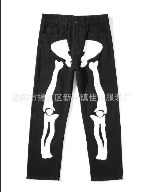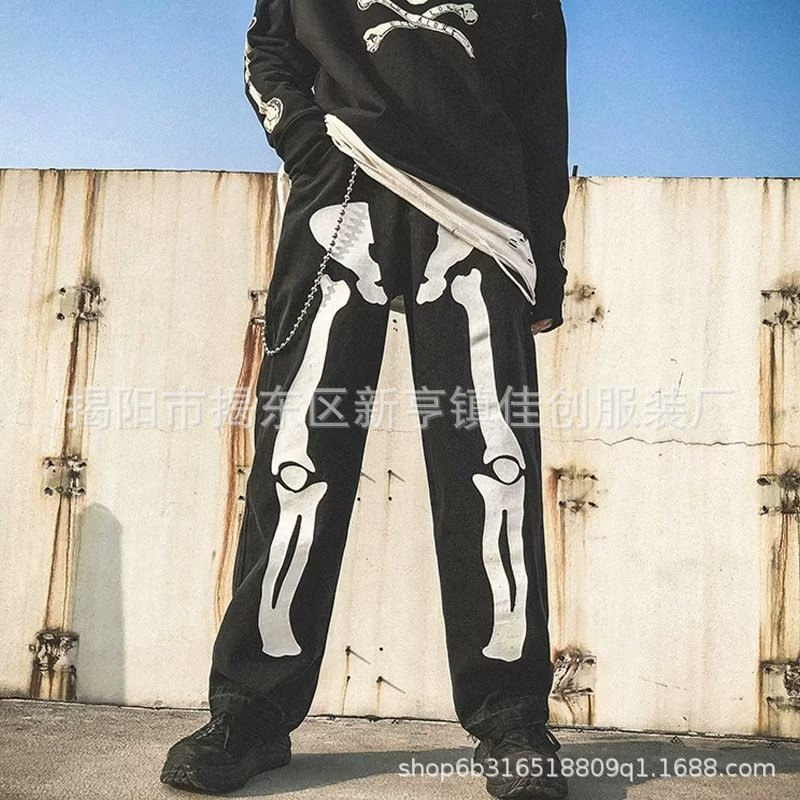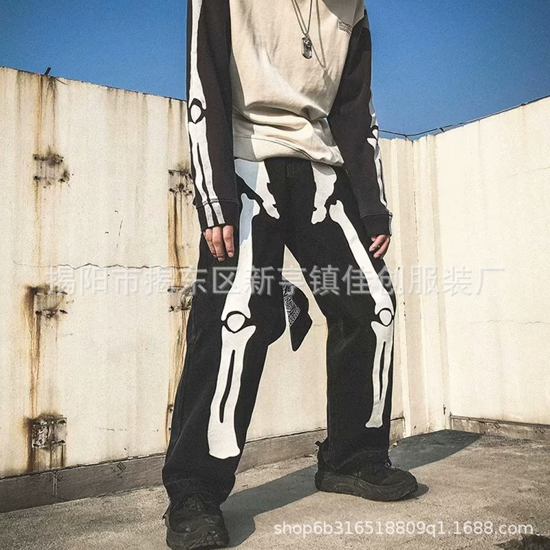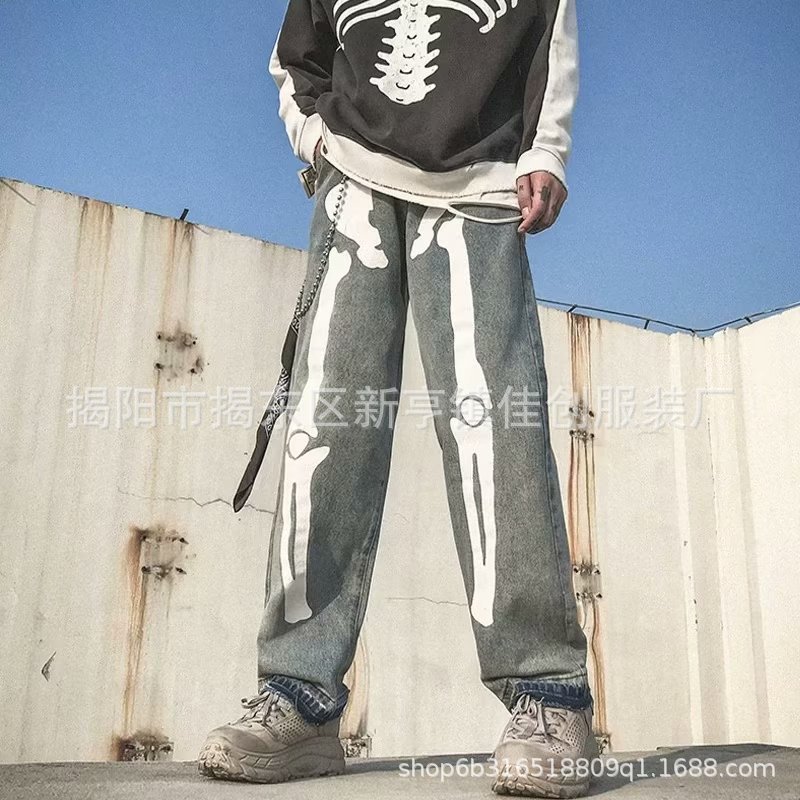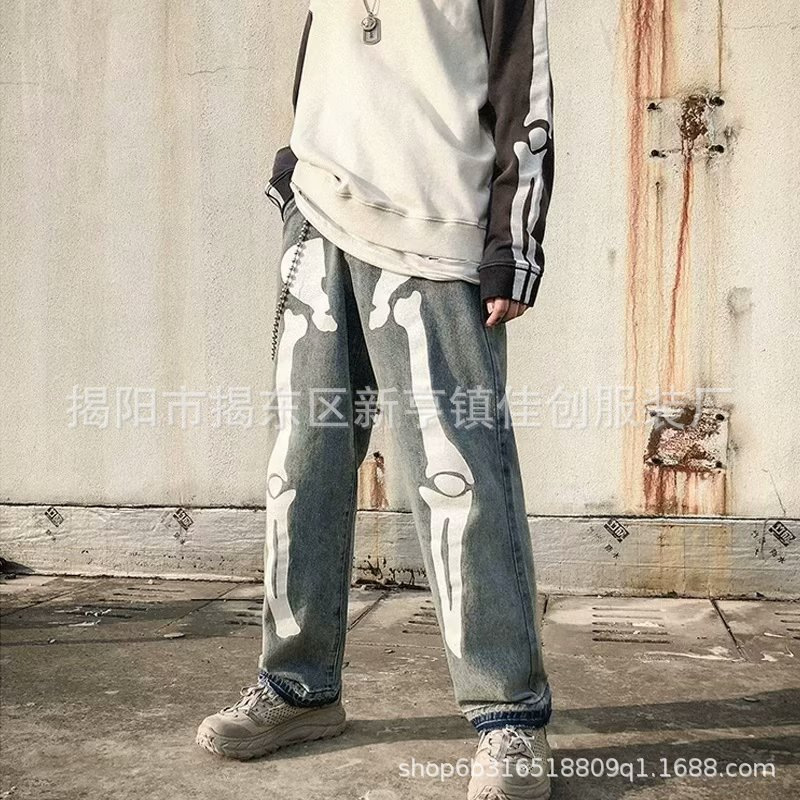 Guochao vibe High Street хип-хоп свободные американские уличные джинсы с принтом кости черепа прямые широкие джинсы