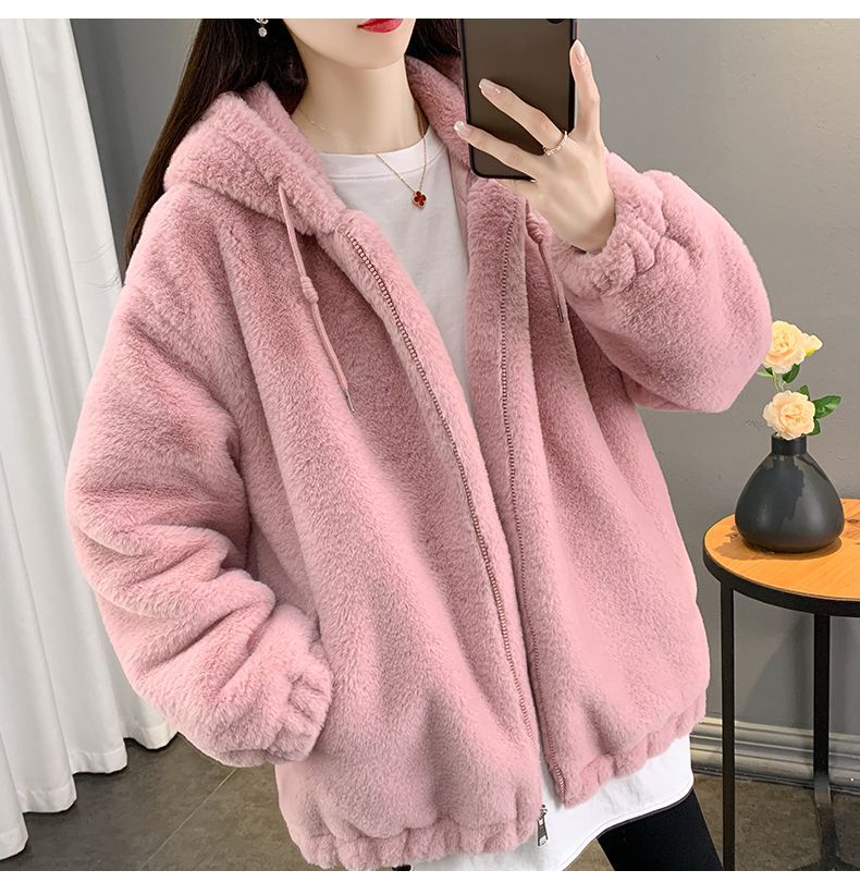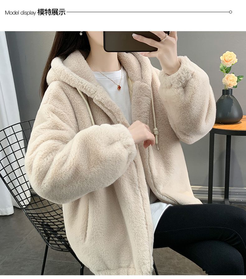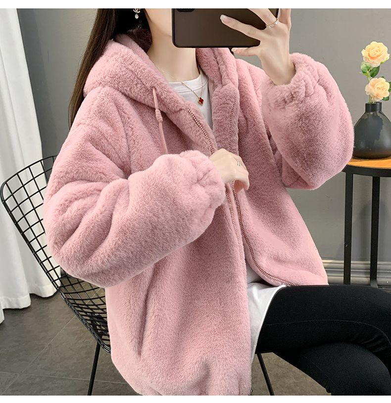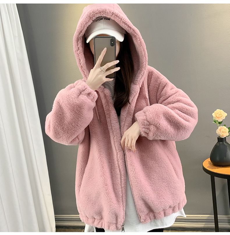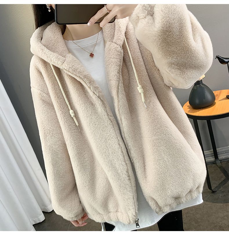 2024 двухсторонний плюшевый женский средний длинный свободный теплый толстый пальто на молнии с капюшоном