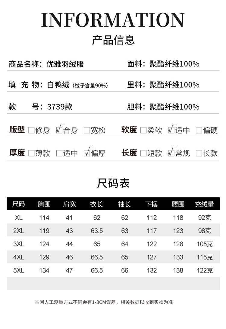 XL [Рекомендуется в пределах 55kg] Грузоподъемность пухового наполнения 92 г; 2XL [рекомендуемая 110-12] грузоподъемность наполнения 98 г; 3XL [рекомендуемая 125-12] емкость наполнения вниз 105 г; 4XL [рекомендуемая 140-12] емкость наполнения вниз 115 г; 5XL [рекомендуется 160-12] пуховая начинка 122 г
