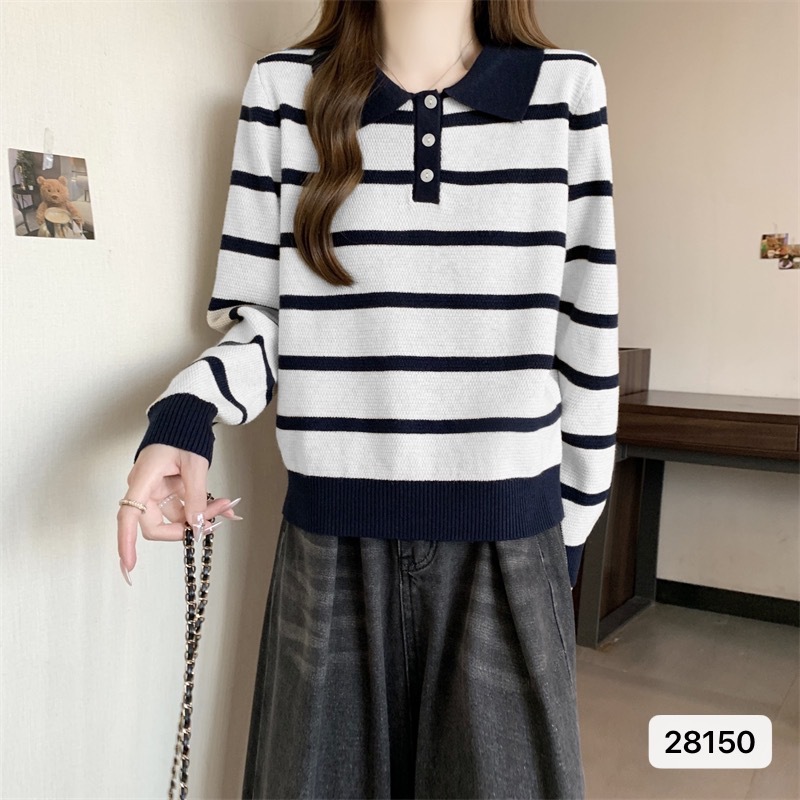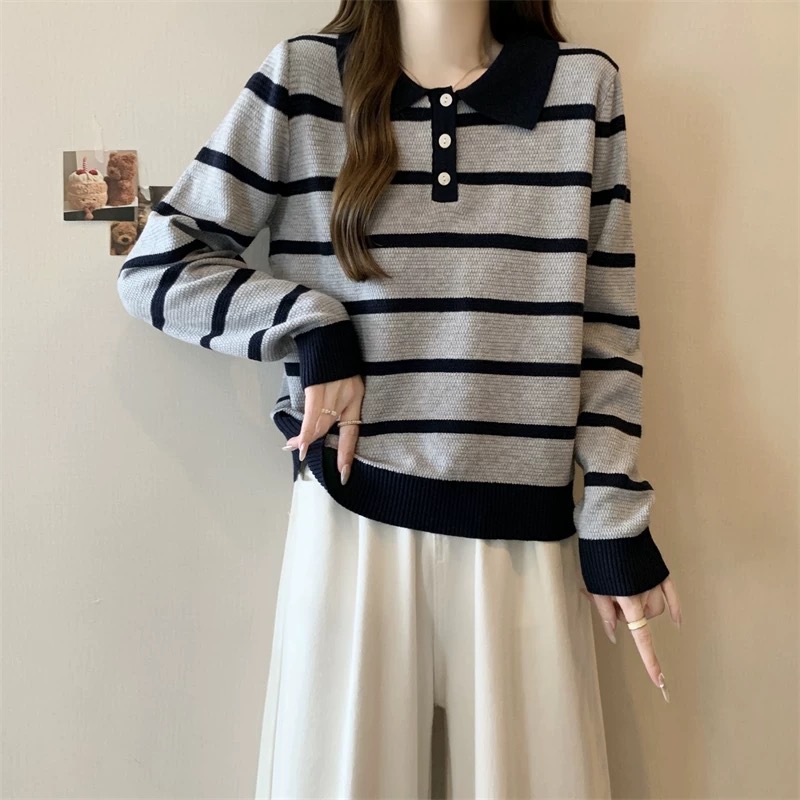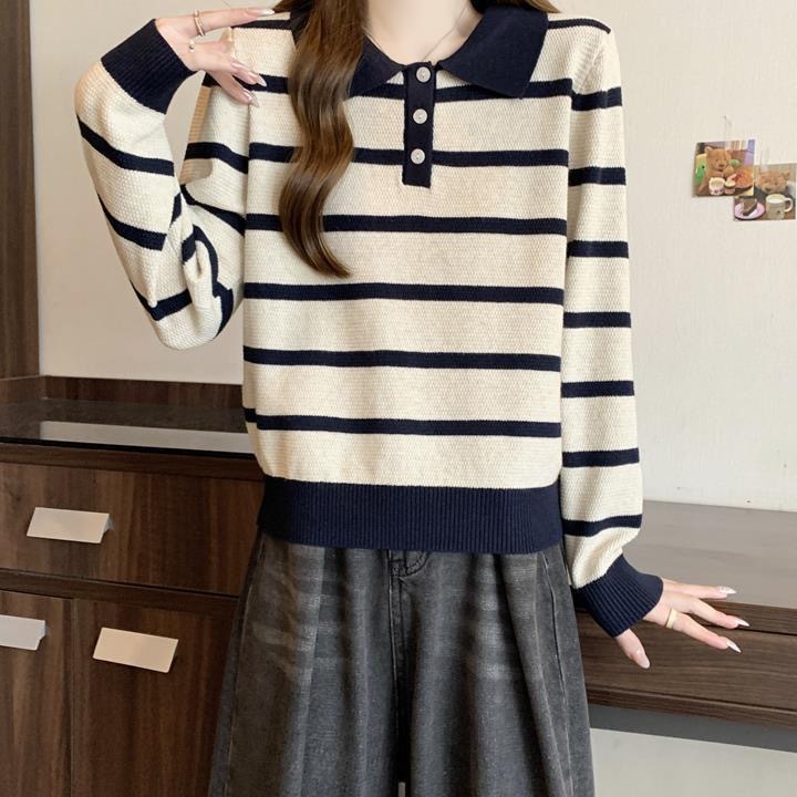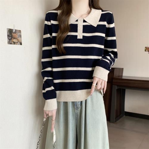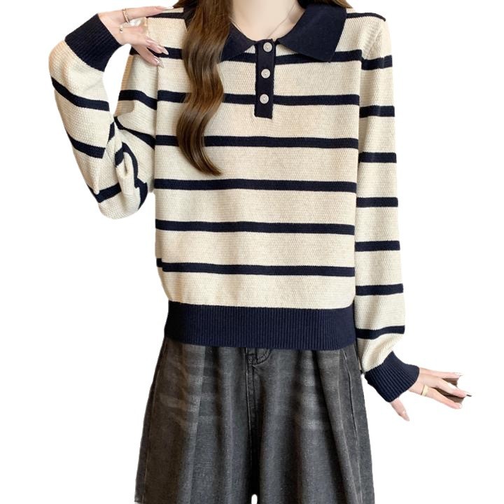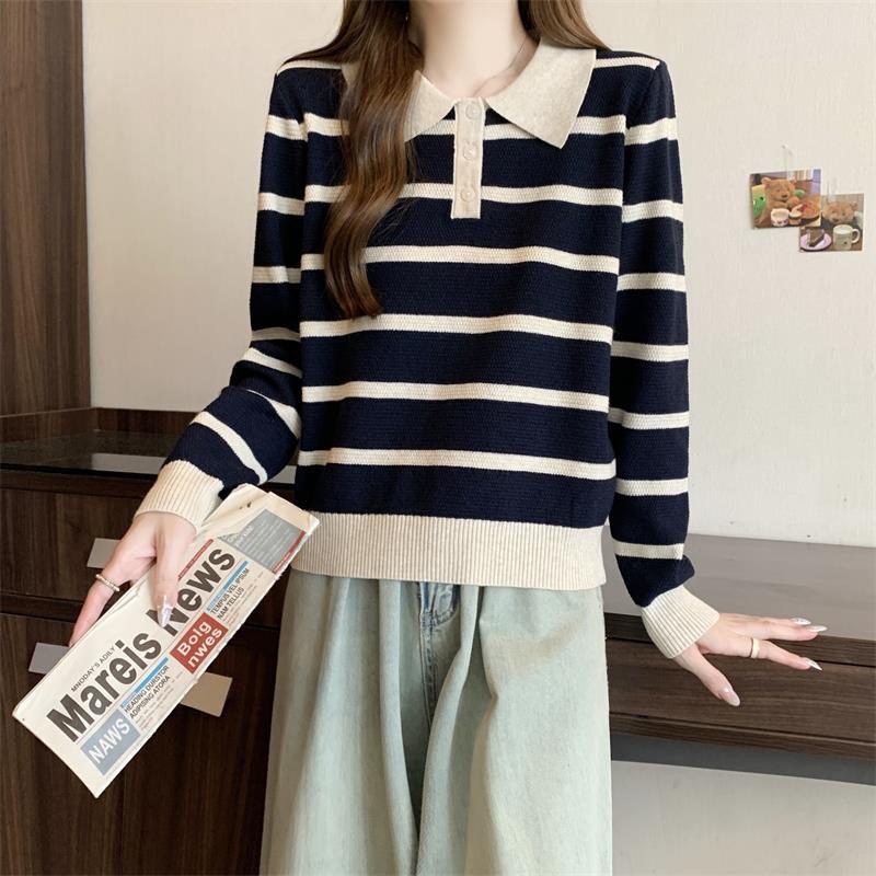 Гонконгский стиль ретро-контрастный цвет в полоску Polo-образный трикотаж женский осенний корейский выпуск свободного лацкана дикая повседневная одежда