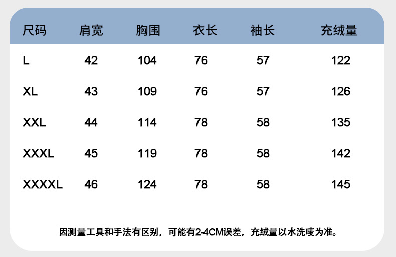 L [рекомендуется 45-52.5kg ]; XL [рекомендуется 52.5-60kg ]; 2XL [рекомендуется 60-67.5kg ]; 3XL [рекомендуется 67.5-75kg ]; 4XL [рекомендуется 75-82.5kg ]