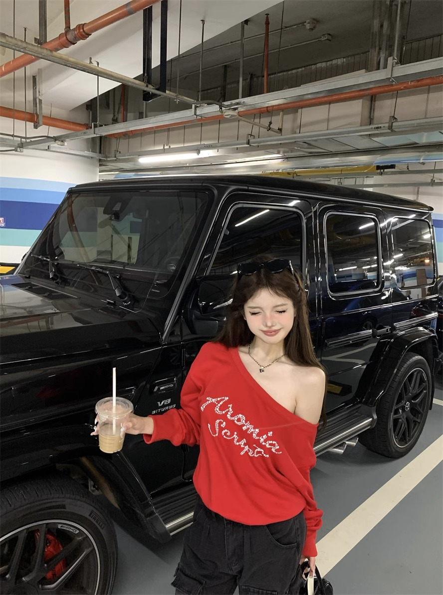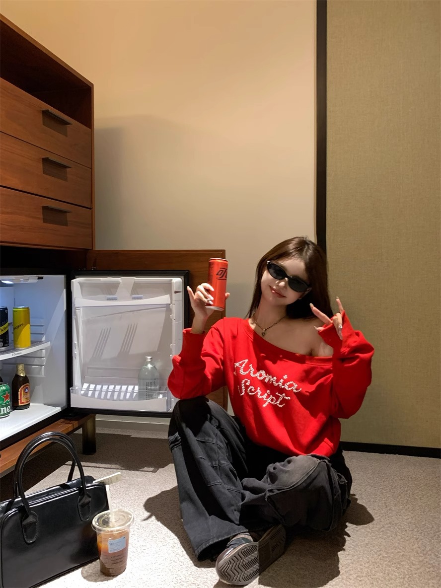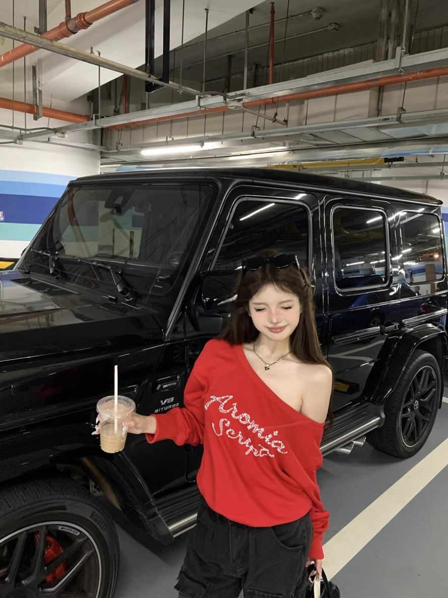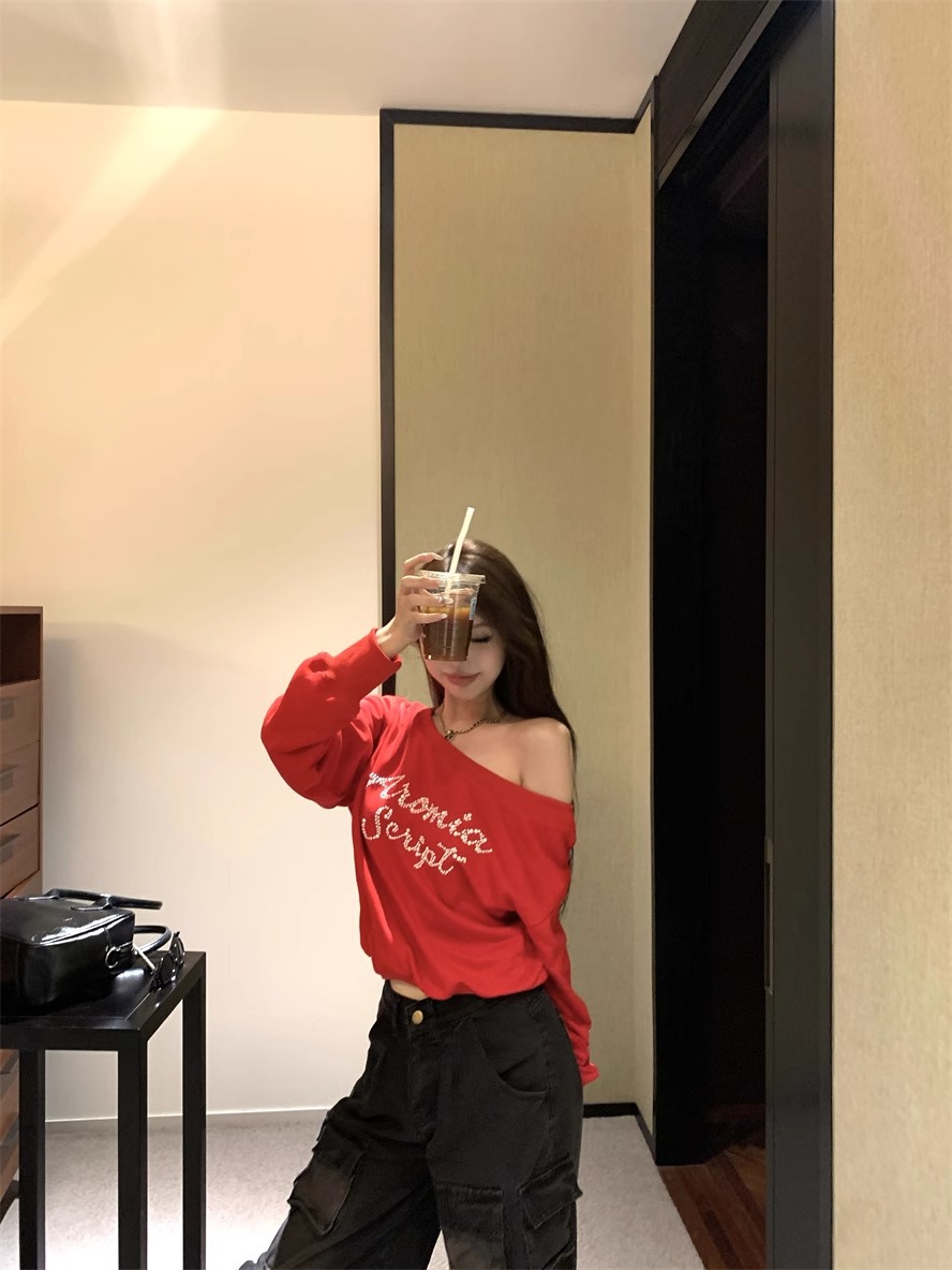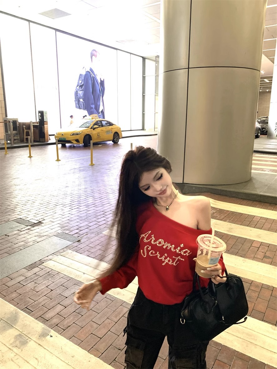 Буква с горячими бриллиантами косой плечо с длинными рукавами свитер женская свободная американская девушка осенью дизайн красный дикий топ