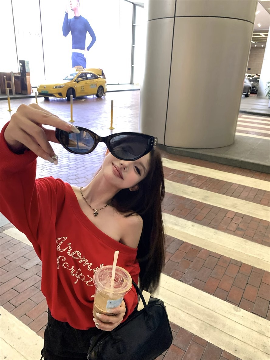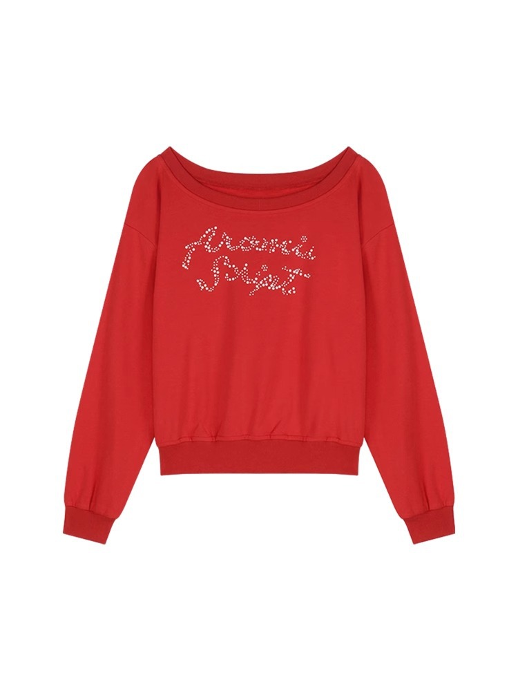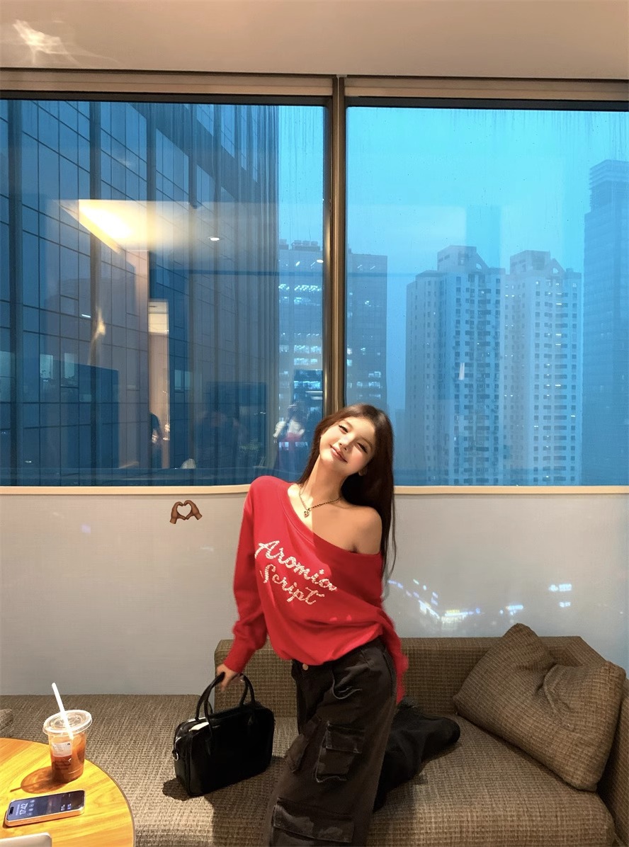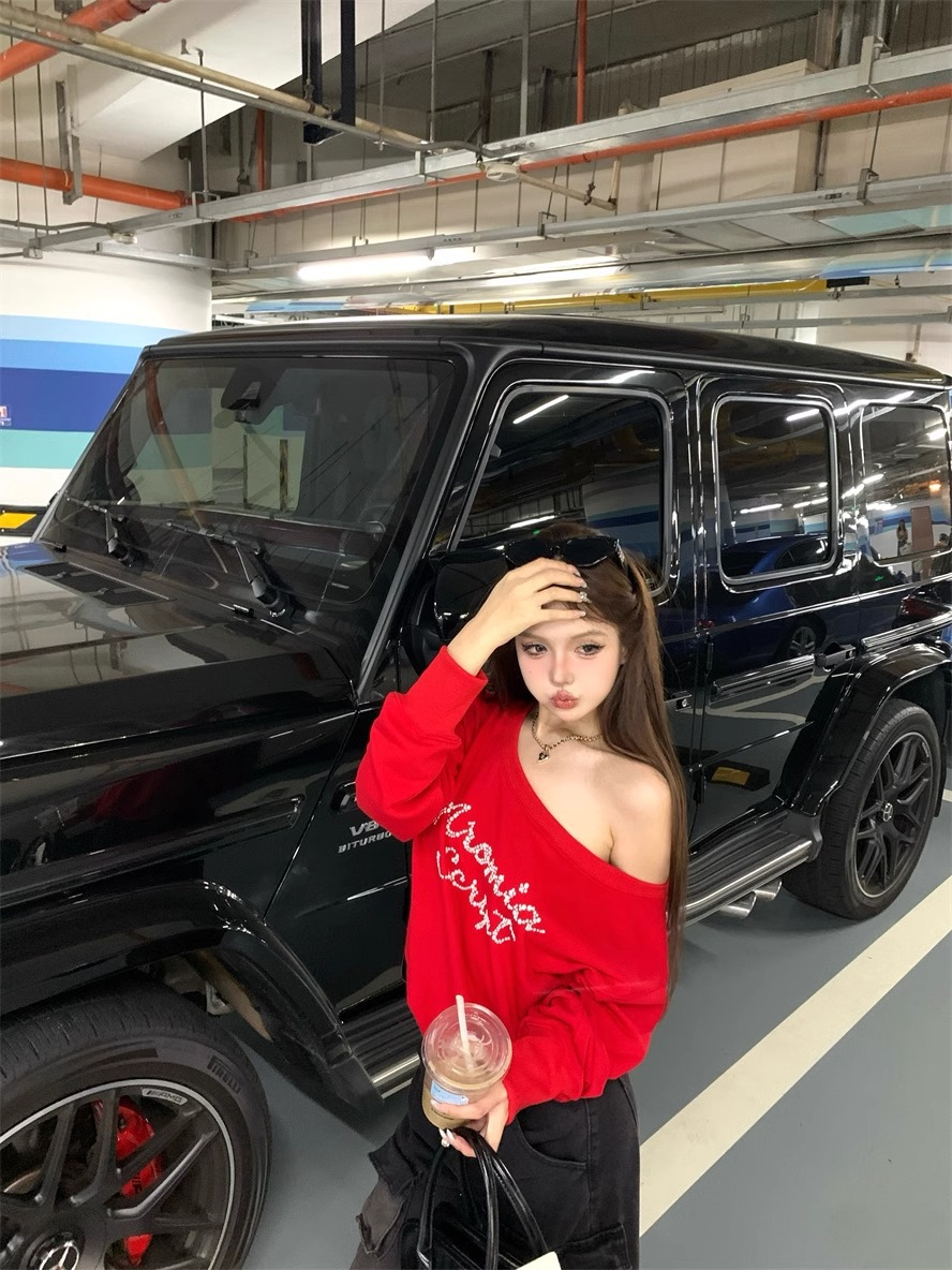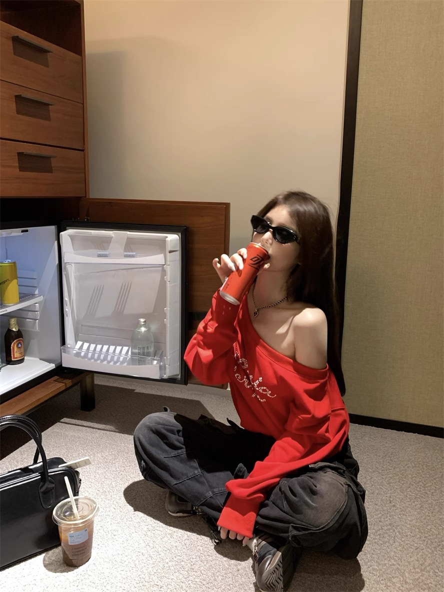 Буква с горячими бриллиантами косой плечо с длинными рукавами свитер женская свободная американская девушка осенью дизайн красный дикий топ