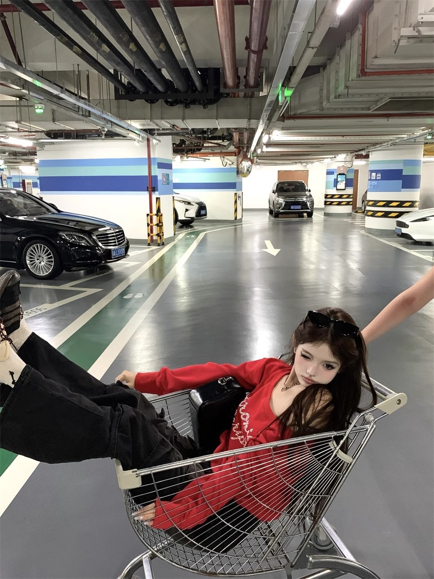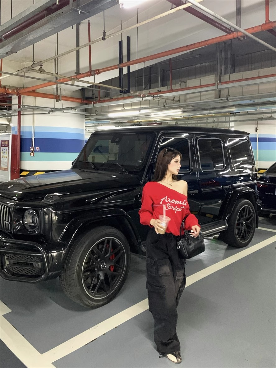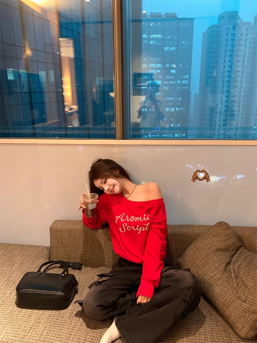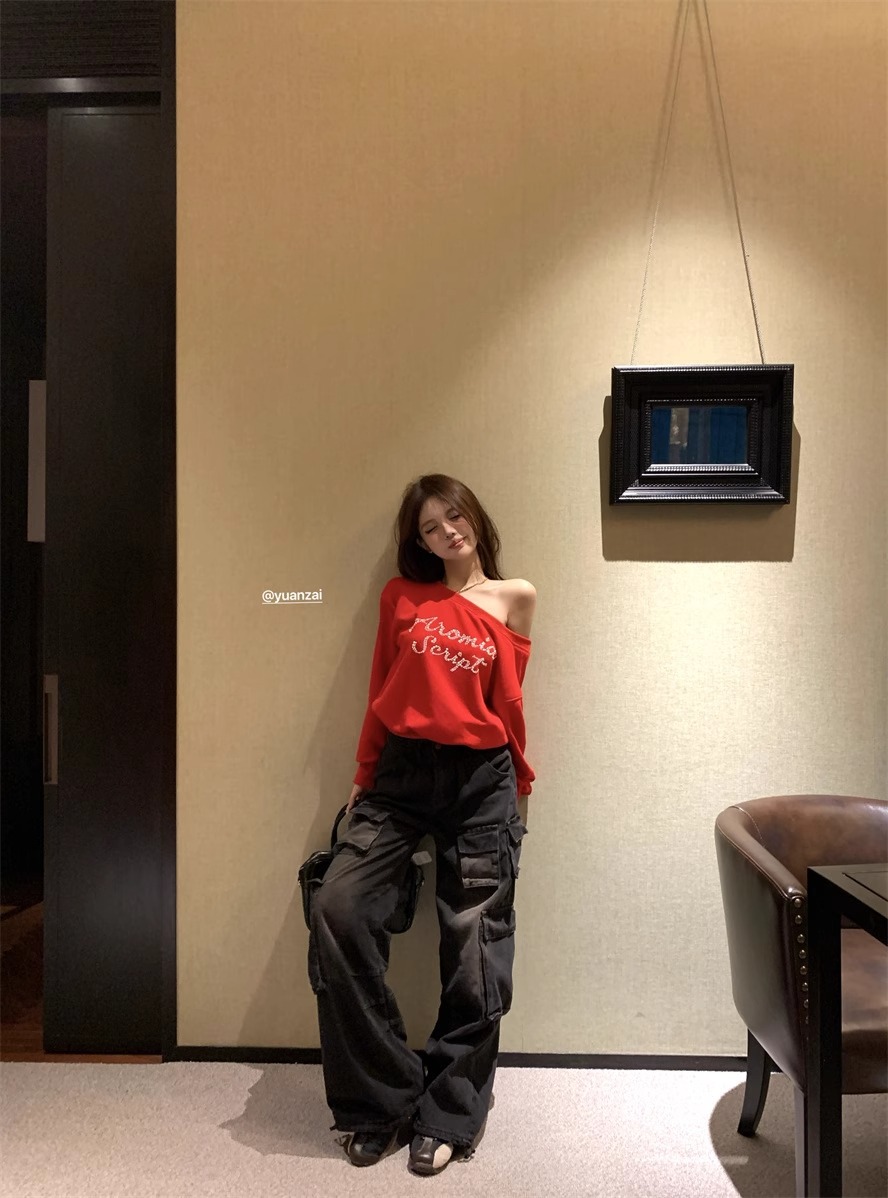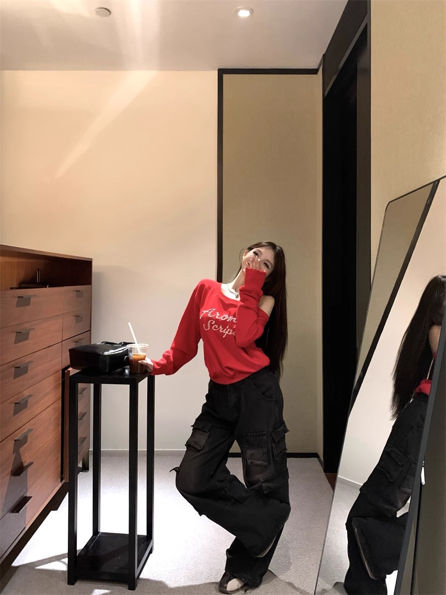 Буква с горячими бриллиантами косой плечо с длинными рукавами свитер женская свободная американская девушка осенью дизайн красный дикий топ