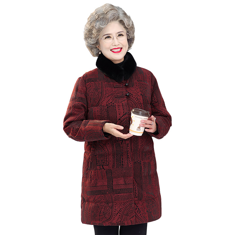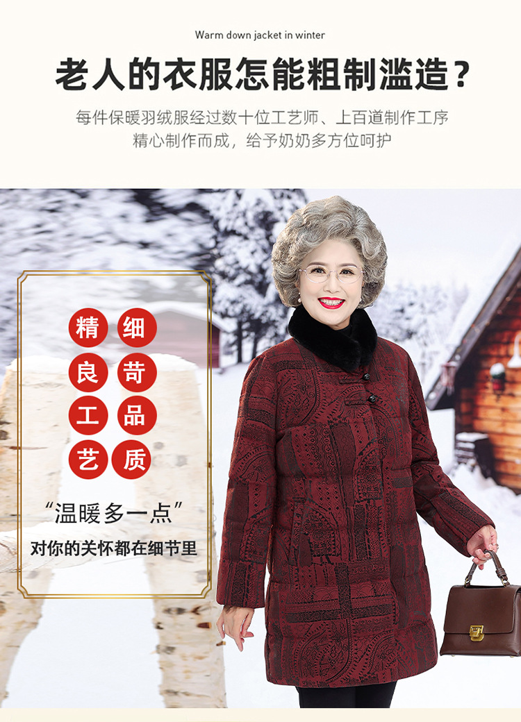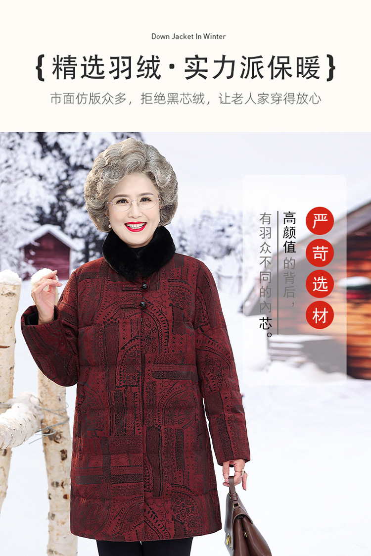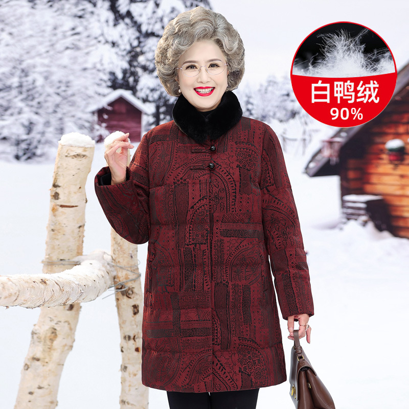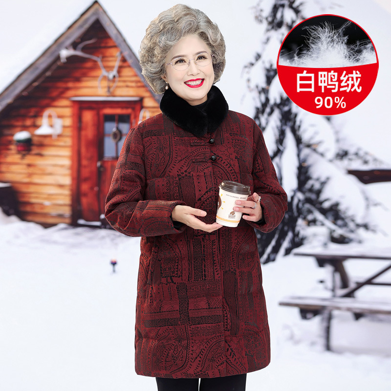Пожилой пуховик женский средний и длинный зимний костюм мама утолщает теплая кожаная куртка бабка белая утка